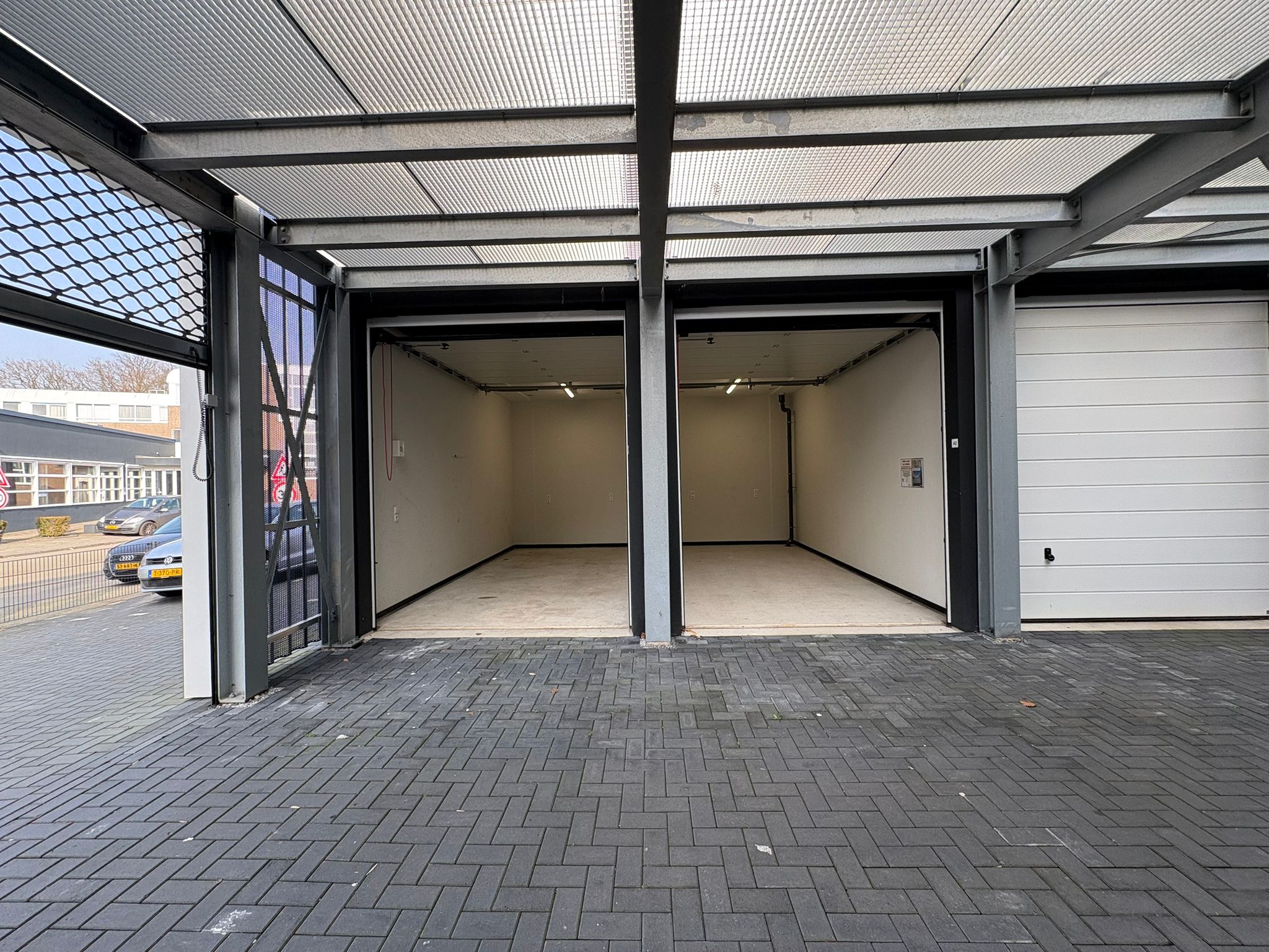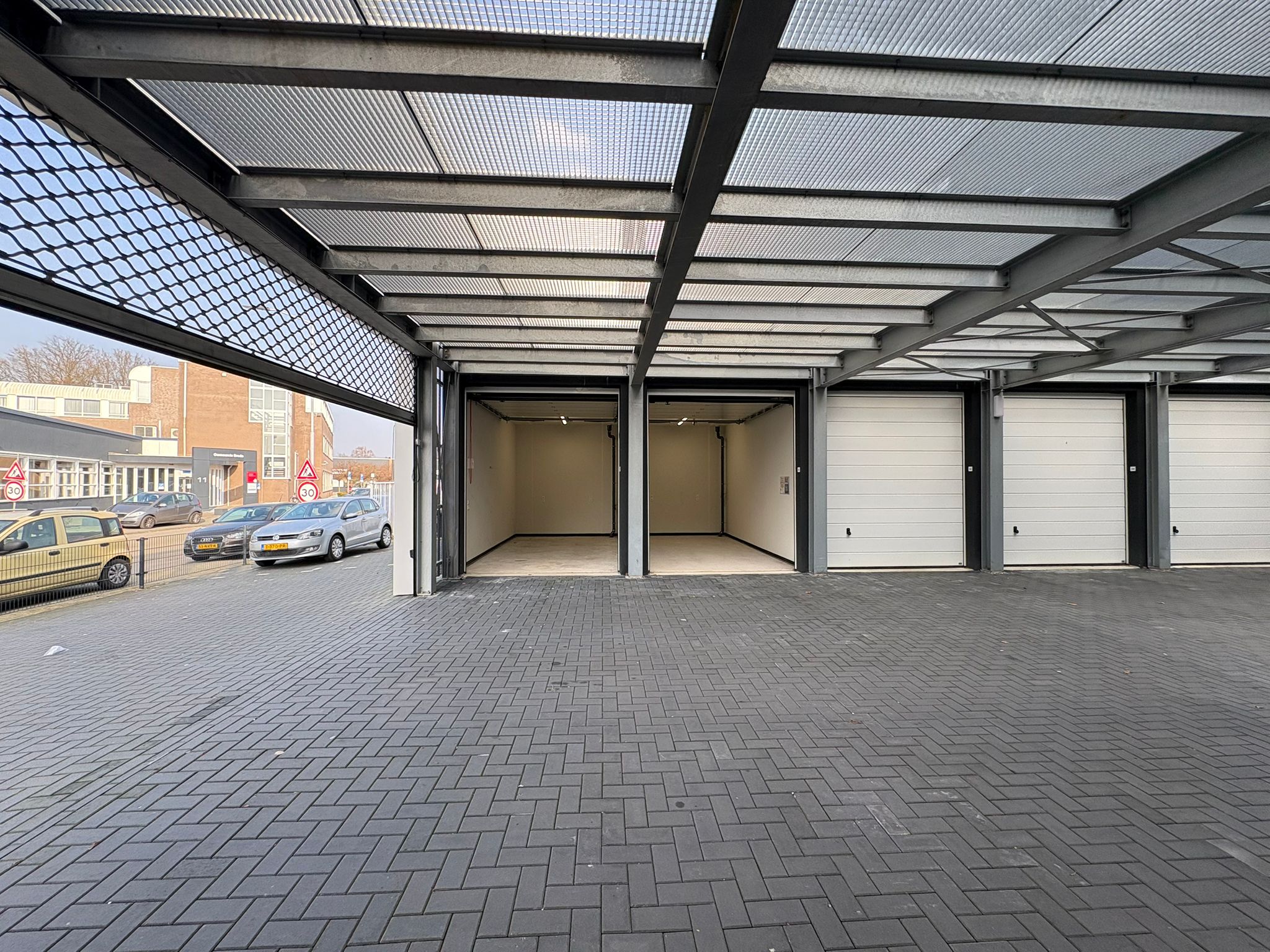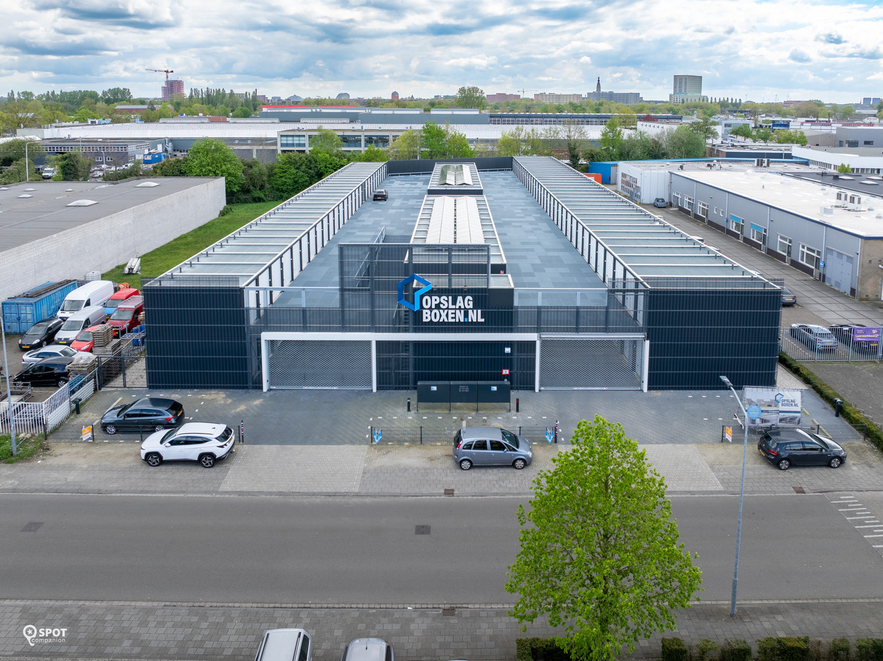 Bij de opslagboxen behoren geen eigen parkeerplaatsen. Er zijn enkele openbare parkeerplaatsen beschikbaar, waaronder enkele voorzien van laadmogelijkheden.