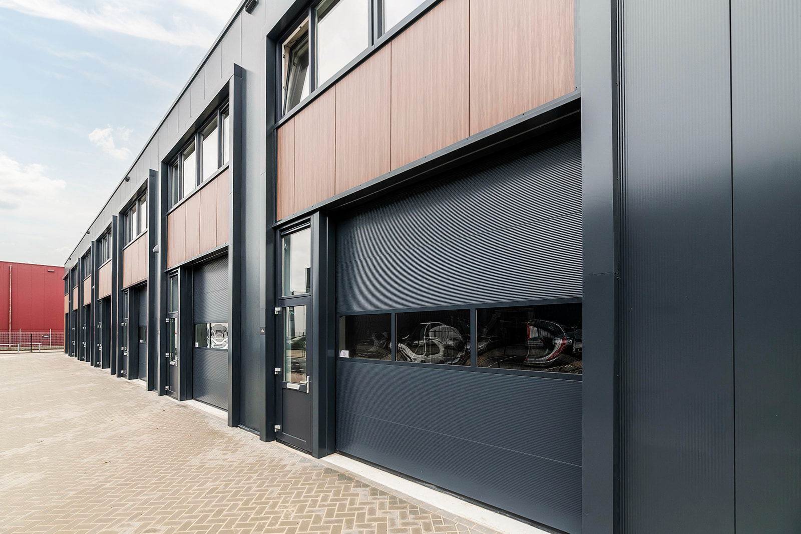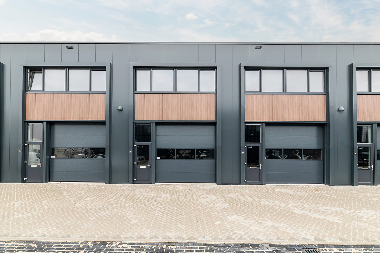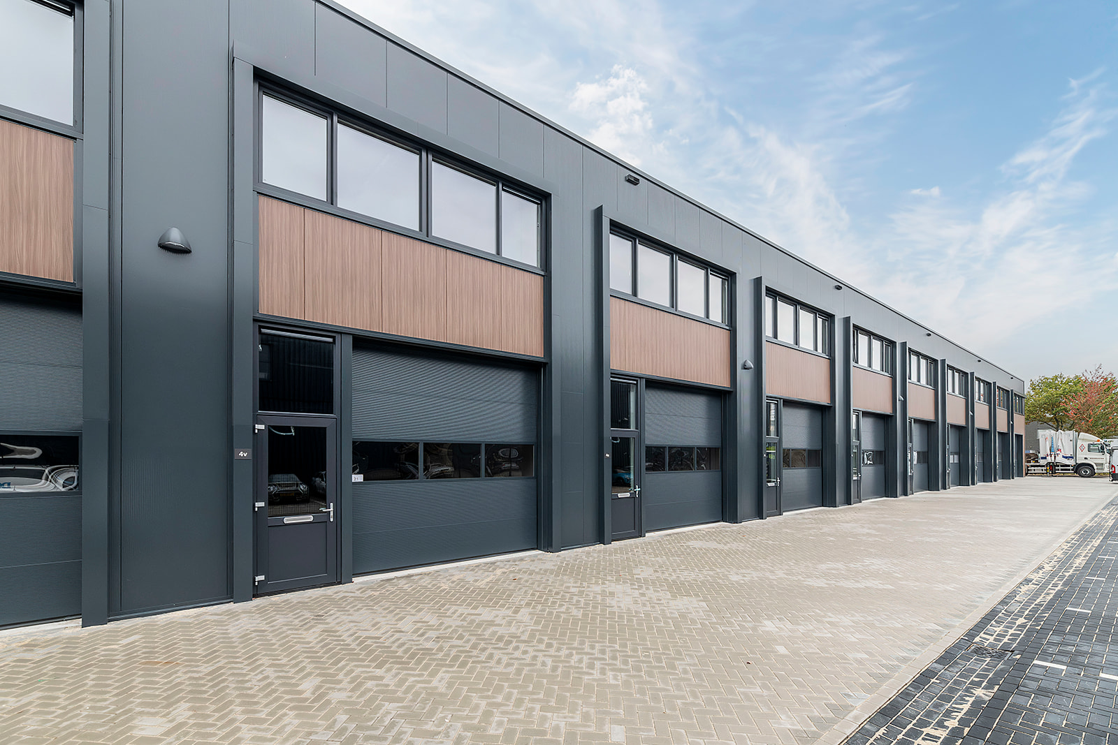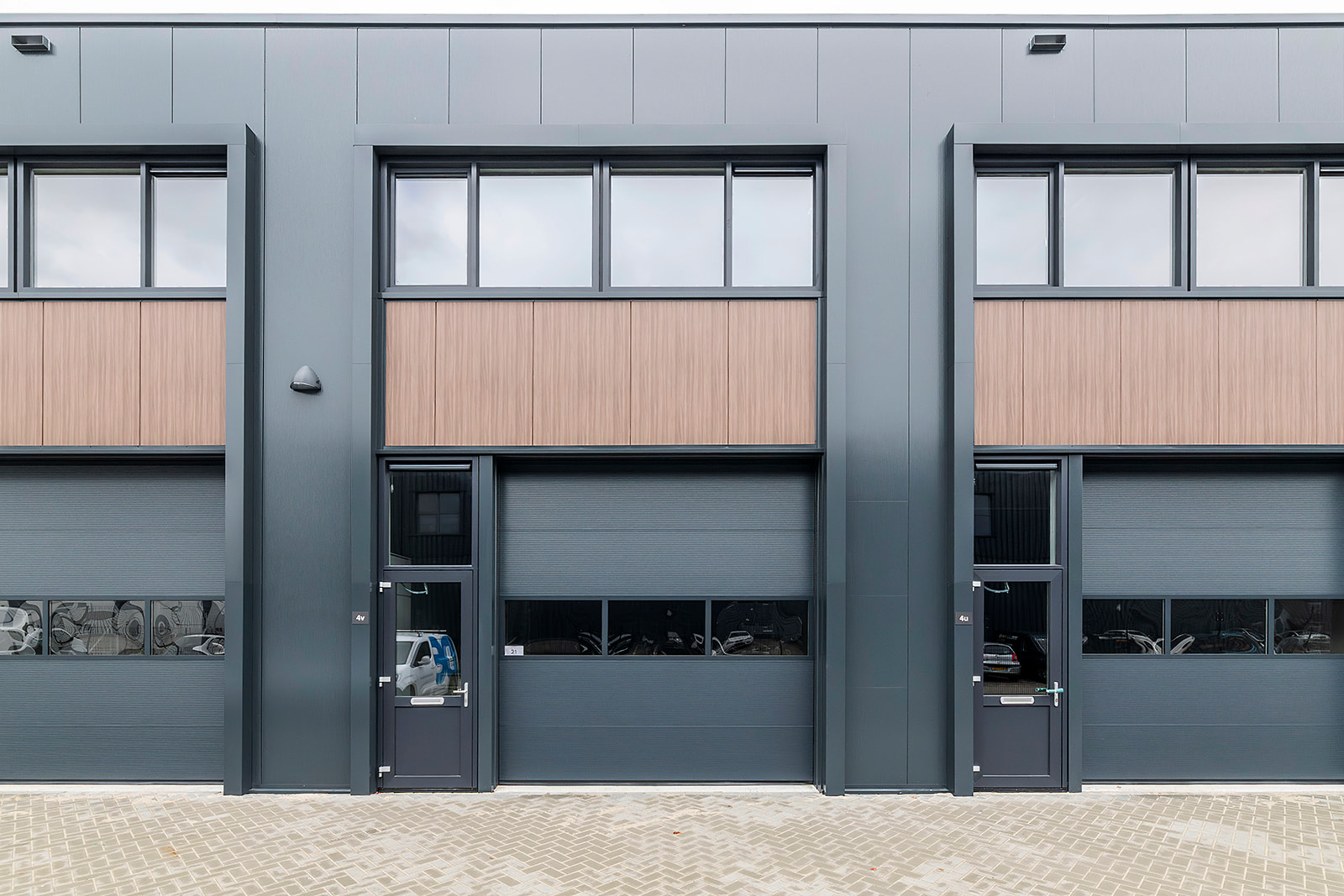 Deze tussenunit is centraal gelegen aan de achterzijde van het complex. Dankzij de grote raampartijen op de eerste verdieping profiteert de ruimte van een ruime hoeveelheid natuurlijk daglicht, wat bijdraagt aan een prettige werkomgeving.