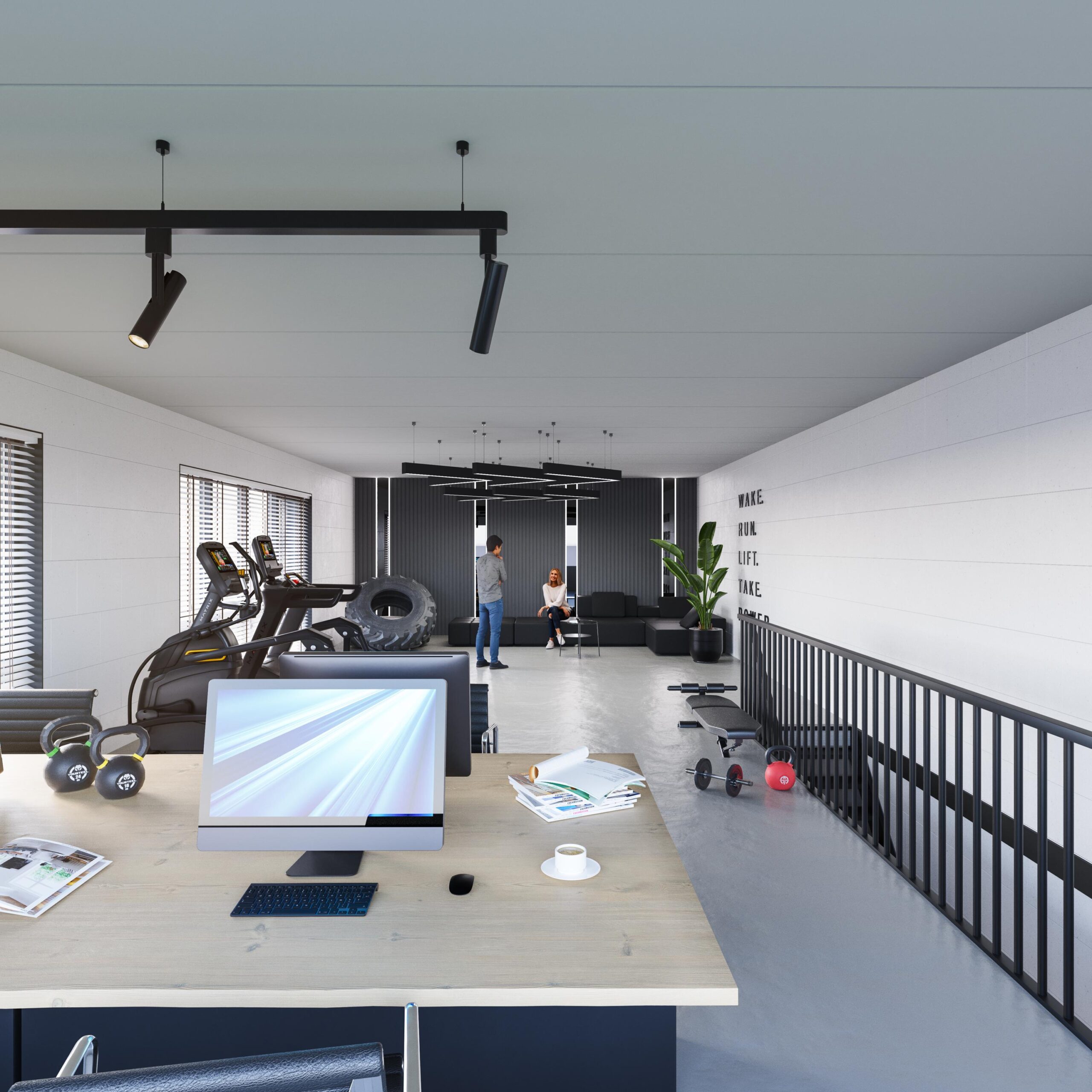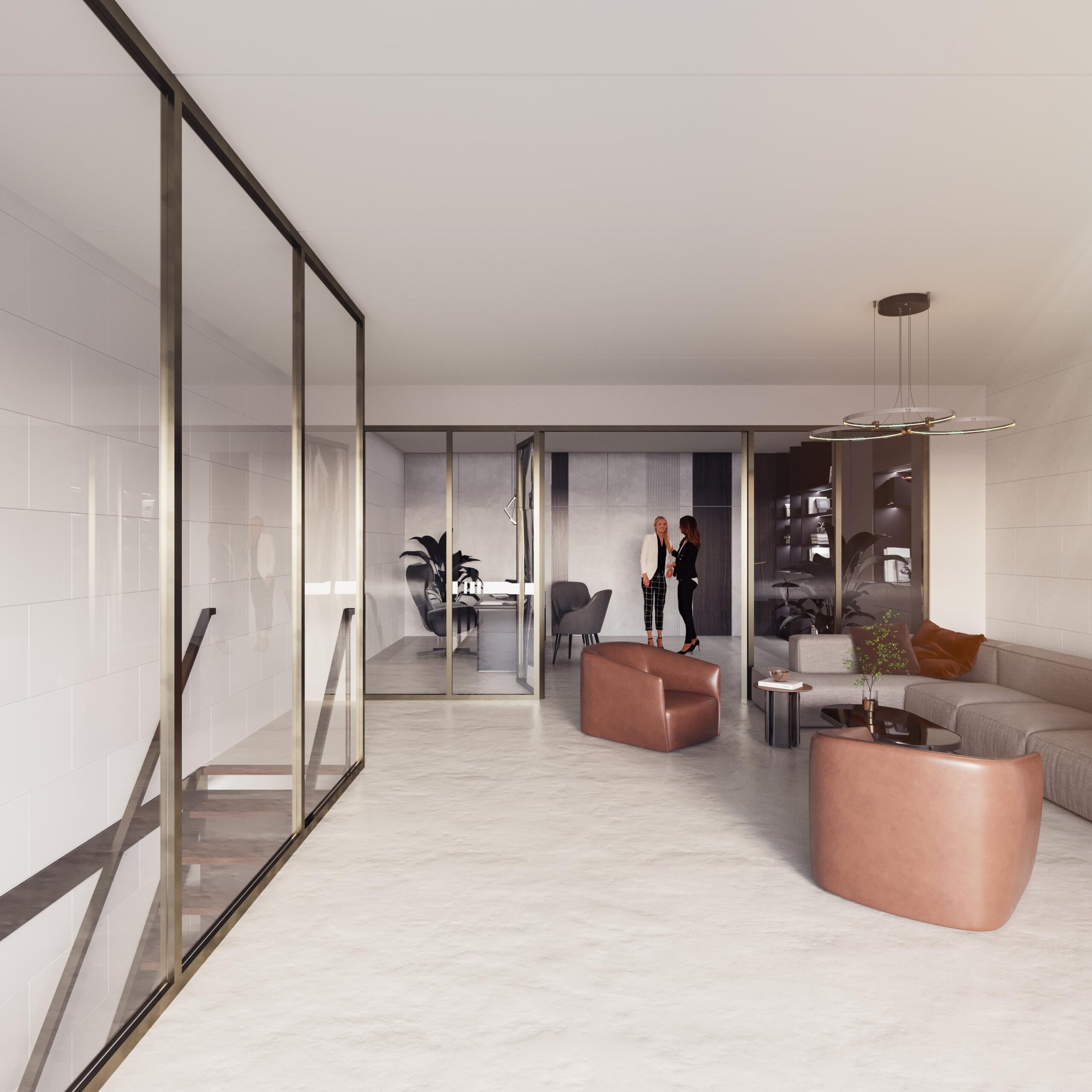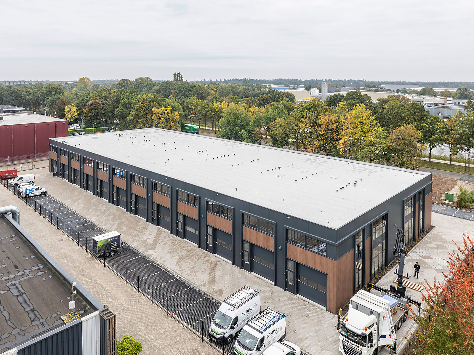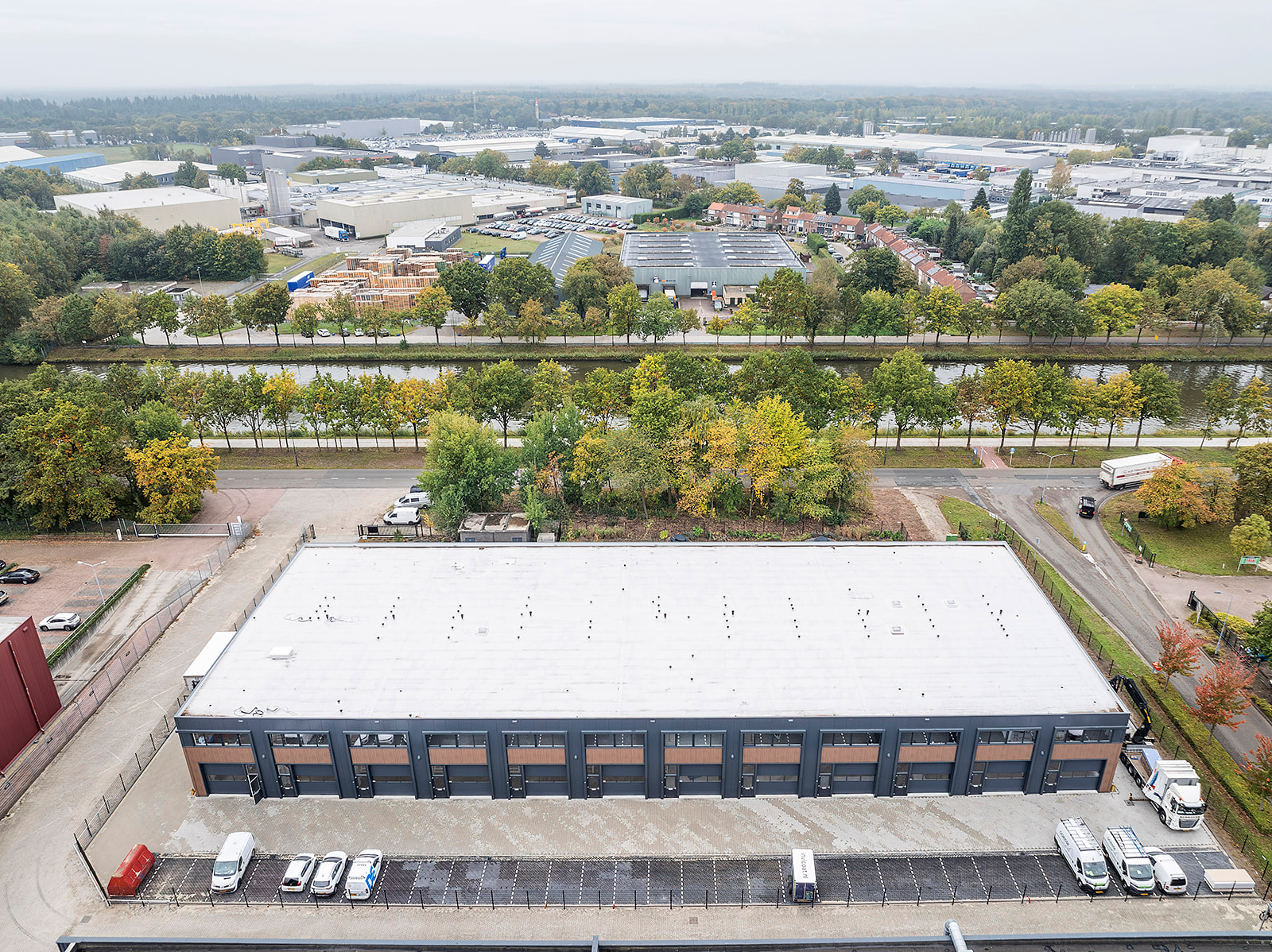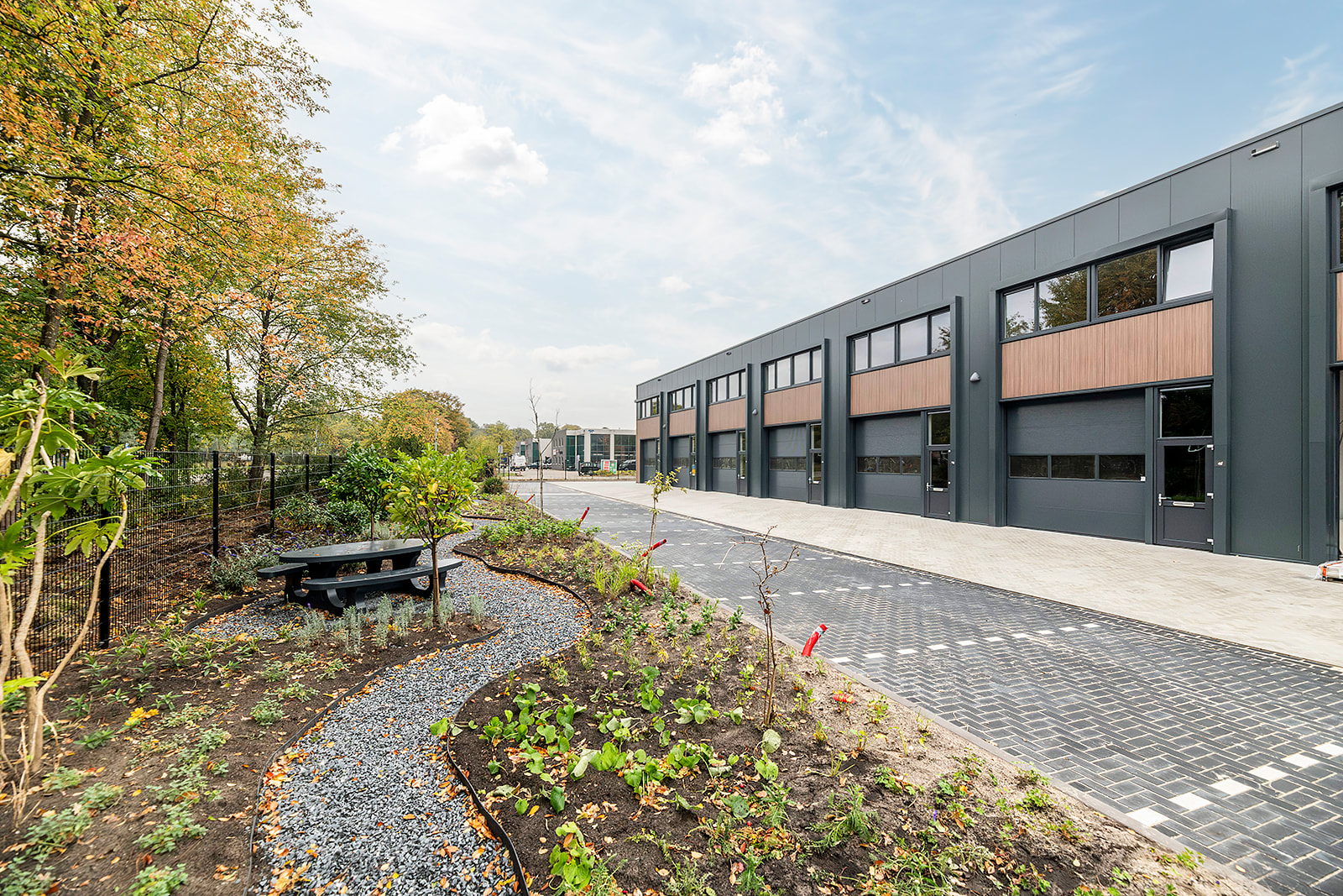 Deze tussenunit is centraal gelegen aan de achterzijde van het complex. Dankzij de grote raampartijen op de eerste verdieping profiteert de ruimte van een ruime hoeveelheid natuurlijk daglicht, wat bijdraagt aan een prettige werkomgeving.