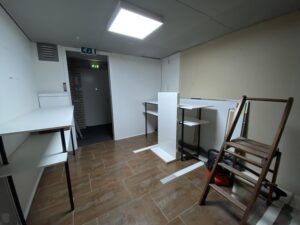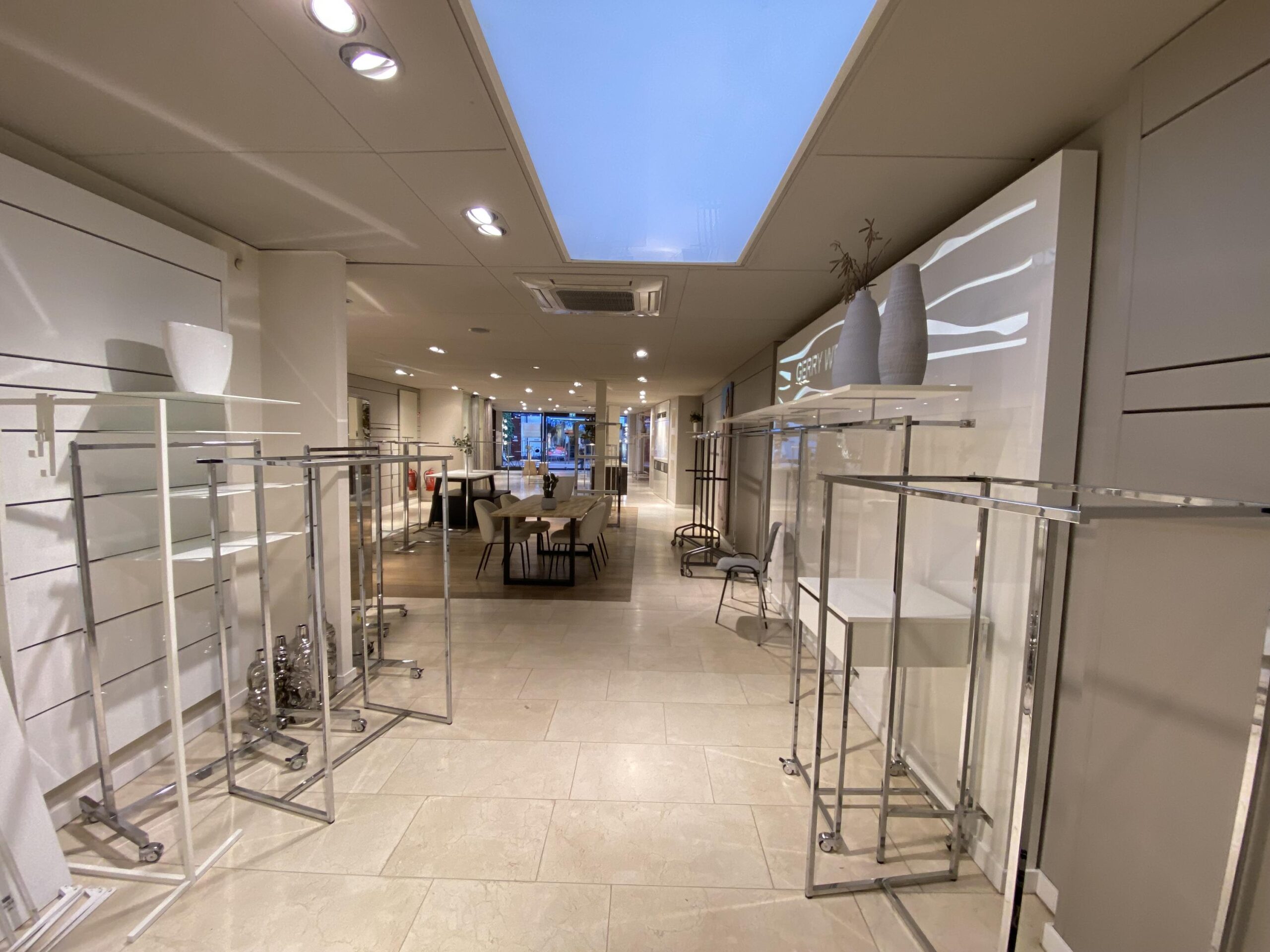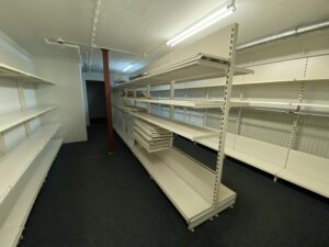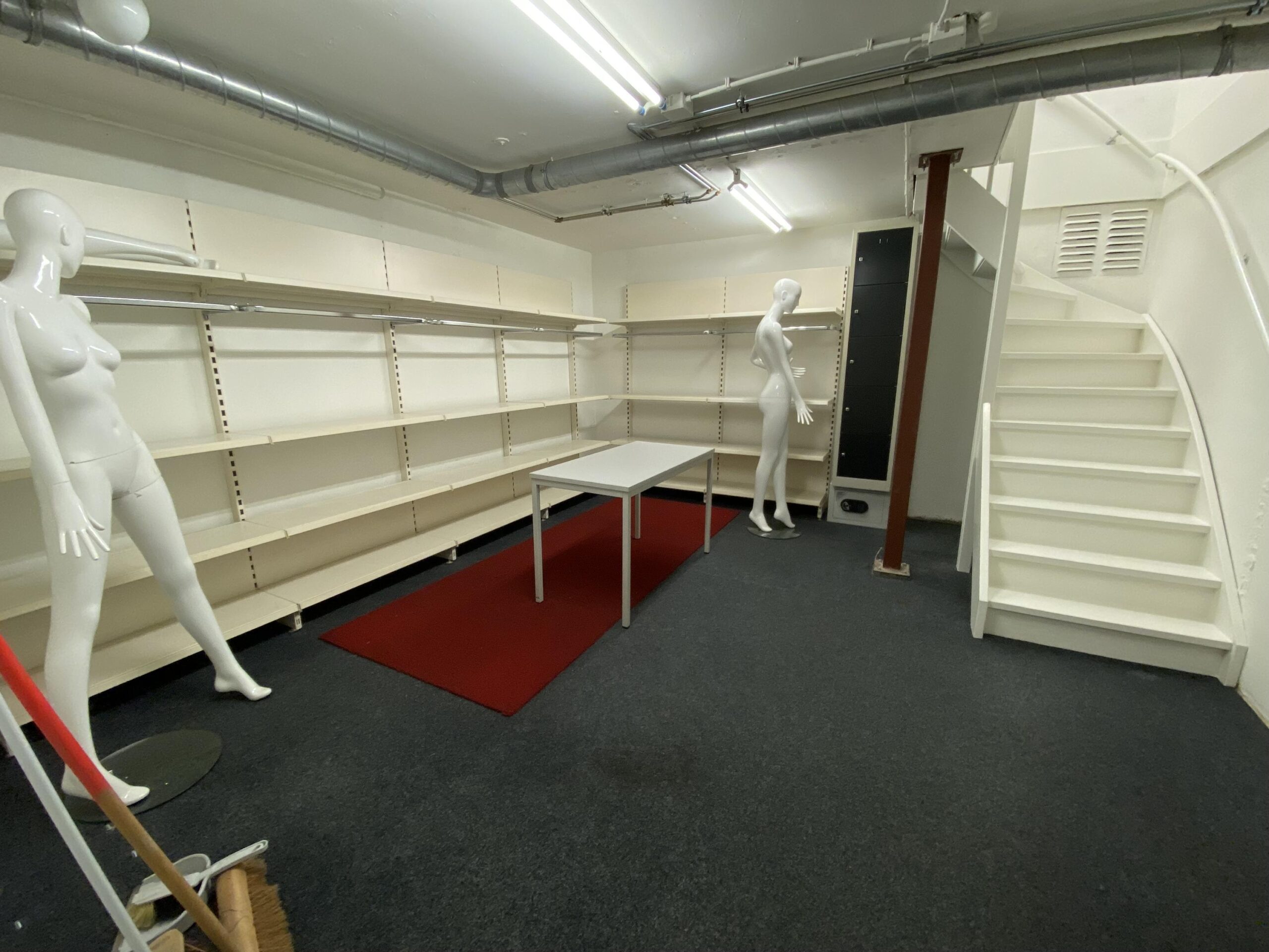De complete winkelinrichting met stellingen in de opslagruimte wordt ter overname aangeboden.