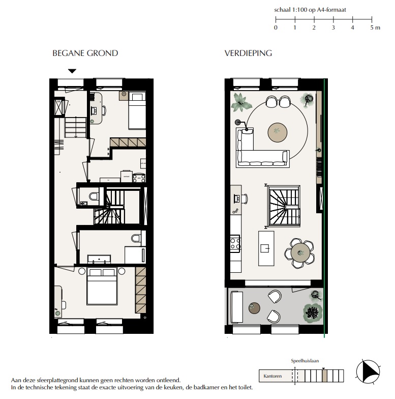 Deze stadswoning, met een woonoppervlakte van 102 m2, komt maar één keer voor. Vanuit de entree kom je direct in de hal, met de trap naar boven. Je komt boven in het midden van de riante, lichte living van zo’n 46 m2. Wat direct in het oog springt is de enorme hoogte. Die hoogte kun je prachtig benutten met maatwerk wandmeubels. De keuken kun je naar eigen wens indelen. Zo kun je kiezen voor een extra lange variant, maar natuurlijk behoort een eilandkeuken ook tot de mogelijkheden.
