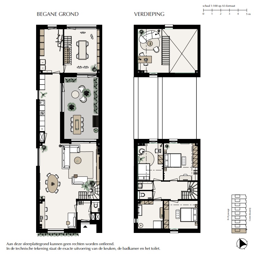 De keuken vormt samen met de patio het centrale middelpunt van de woning. De lengte van de keuken vraagt om een bijzonder design. Hier kun je je creativiteit goed op loslaten. En dat geldt ook voor de studio met entresol. Je kunt er een prachtig kantoor aan huis van maken, waar je met meer mensen kunt werken. Of ambacht uitoefenen en workshops geven bijvoorbeeld. Alles is mogelijk.