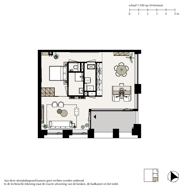 In het hart van het appartement zijn de keuken, berging, toilet en badkamer gesitueerd. Daaromheen kun je de ruimte vrij indelen zoals jij het wenst. Denk aan een lounge om te ontspannen, een slaapdomein en een fijne plek om te tafelen met vrienden en familie. Er is ook plek om thuis te werken. Laat je inspireren door de sfeerplattegrond!