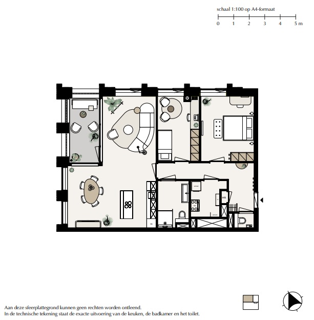 Verder is het appartement ingedeeld met twee slaapkamers, een apart toilet en een badkamer met een inloopdouche, wastafel en tweede toilet. In de berging is plaats voor de wasmachine en wasdroger en staan ook de technische apparaten.
