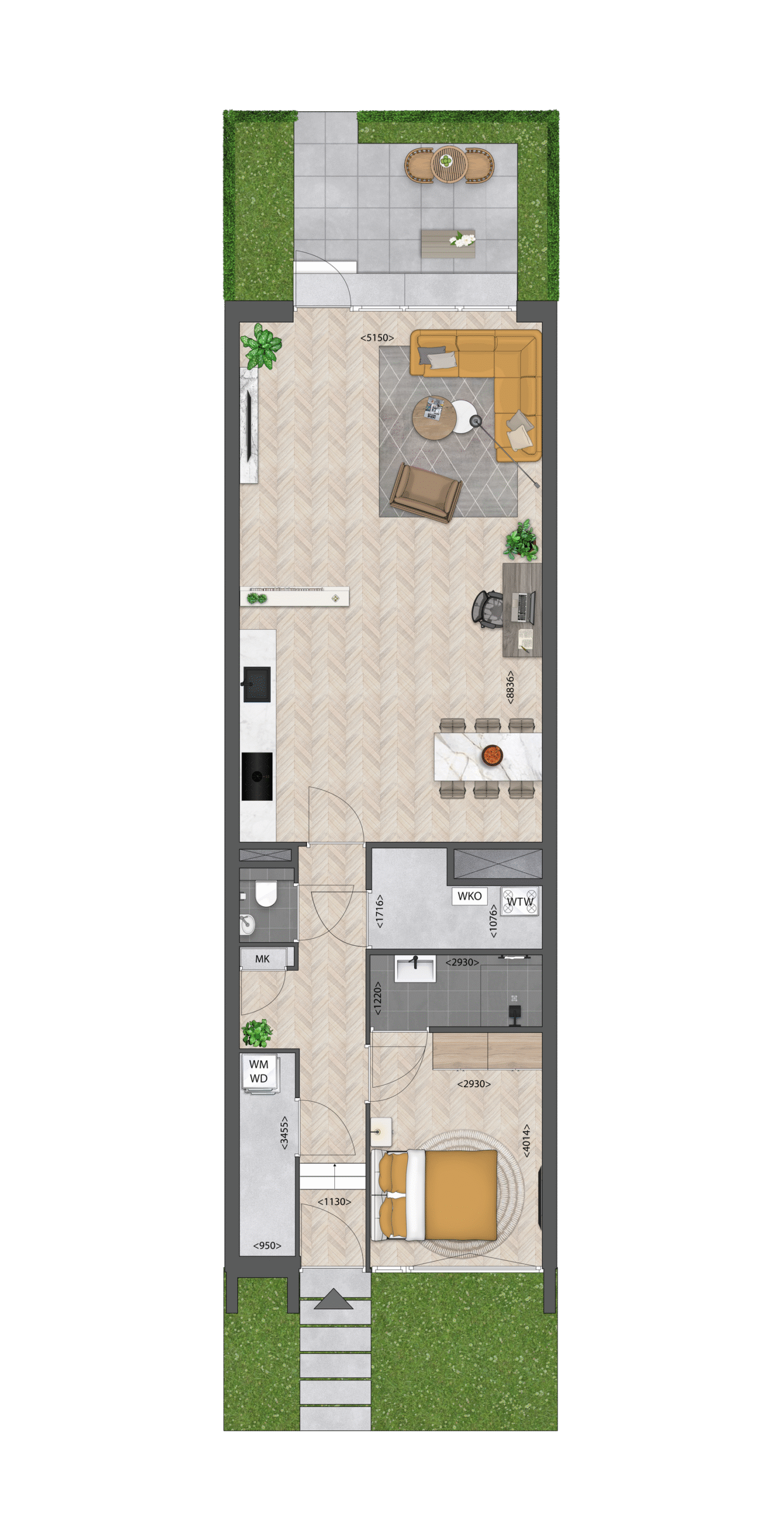 - 10 ruime stadswoningen met privéterras, waarvan 8 stadswoningen tevens over een souterrain beschikken.