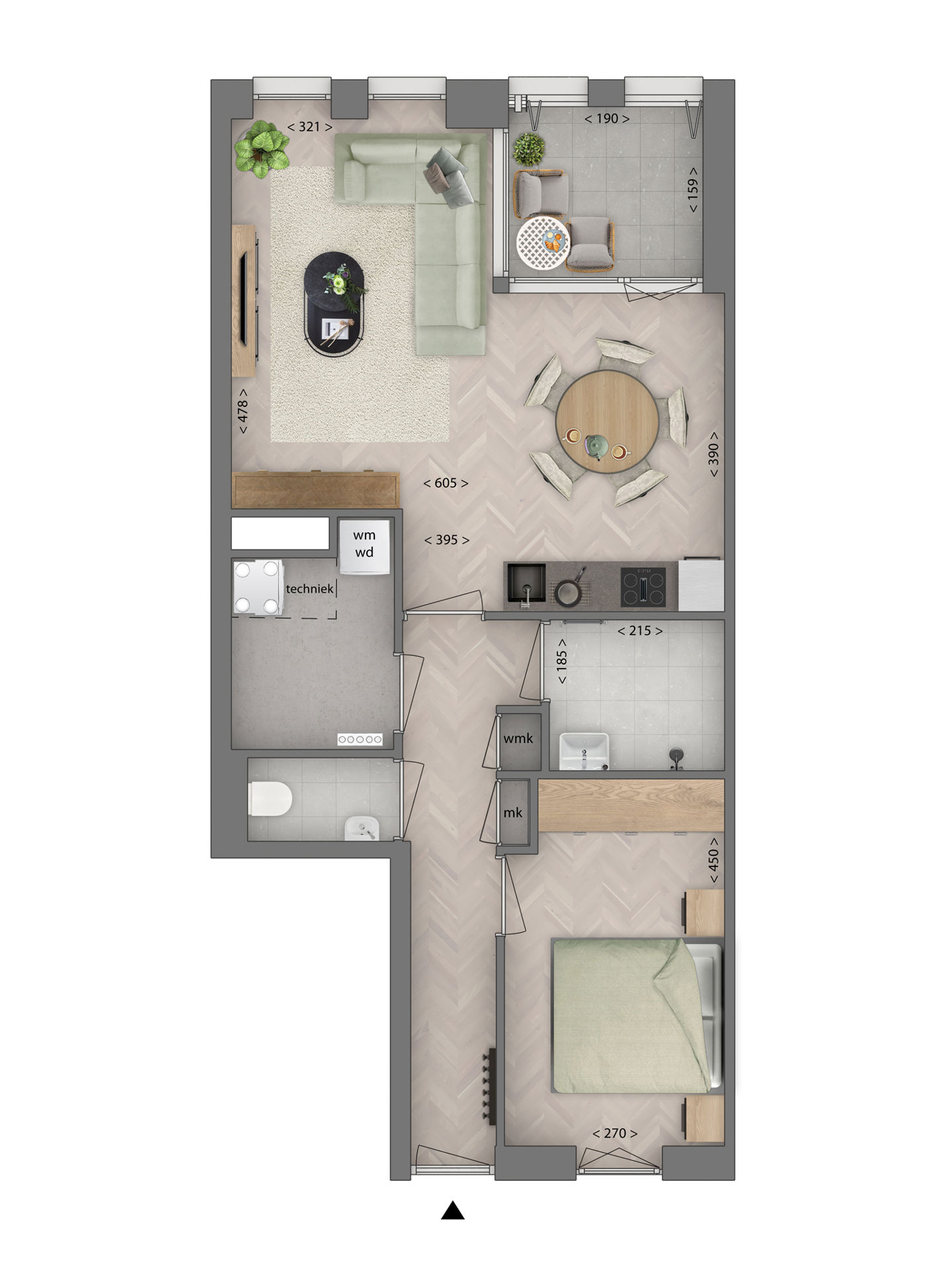 Zodra je binnenkomt voelt het meteen goed. De open woonkamer en keuken lopen soepel in elkaar over en vormen het hart van je woning: een plek om te koken, werken of relaxen met vrienden en een drankje. En de keuken is ook nog eens compleet ingericht dus je kunt direct nieuwe recepten uitproberen. De loggia grenst aan de living: jouw eigen beschutte buitenplek in de zon. Zet de deur naar de loggia lekker open als je bezoek hebt. De perfecte plek voor een ontbijt in de zon, een borrel of een fijne werkplek met uitzicht. Er is een ruime, lichte slaapkamer en die badkamer? Die is modern en af met een inloopdouche en wastafel, het toilet is separaat. Ook handig: je hebt een technische ruimte met plek voor je wasmachine, droger en andere spulletjes. Zie je jezelf al zitten op je loggia?