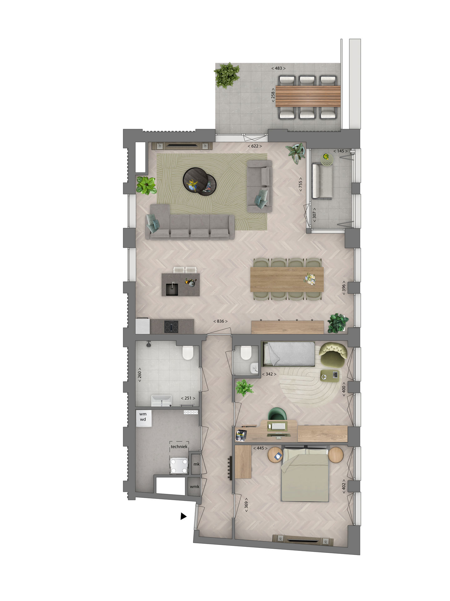 Stel je voor: 2 buitenruimtes, ochtendzon en middagzon? Yes, dit daktuinappartement #59 (B3.1) op de 3e verdieping van De Burgemeester heeft het allemaal. Je beschikt hier over een royale daktuin op het oosten en een loggia op het zuiden, dus altijd een fijne plek om buiten te zijn. Of je nu houdt van de vroege zon of liever in de middag neerploft. Binnen heb je 2 slaapkamers, een fijne open indeling en een moderne badkamer en keuken. Hier woon je in de hippe Spoorzone, met het centrum van Tilburg om de hoek! Is dit precies wat jij zoekt?