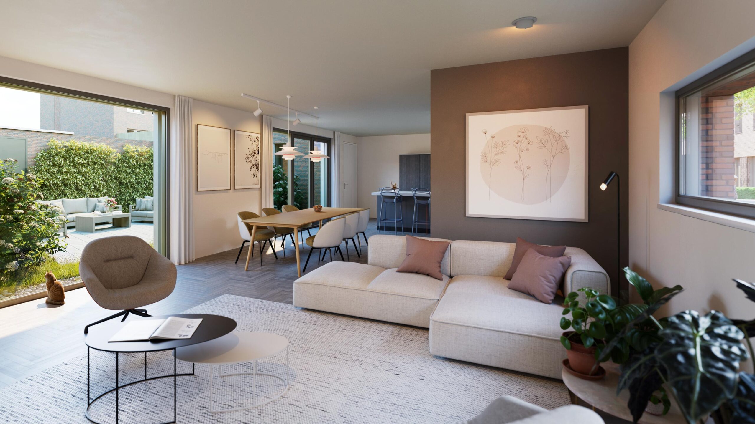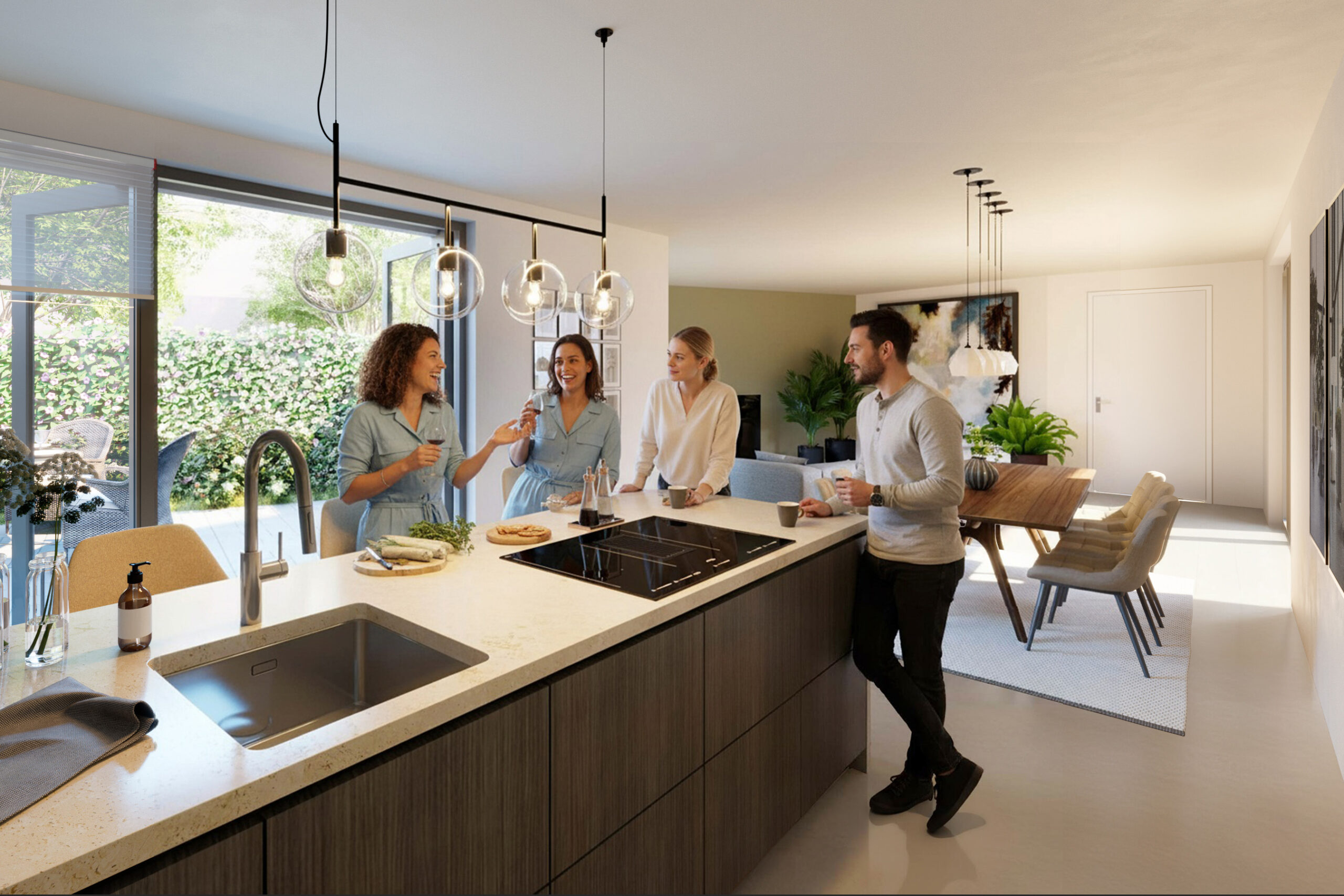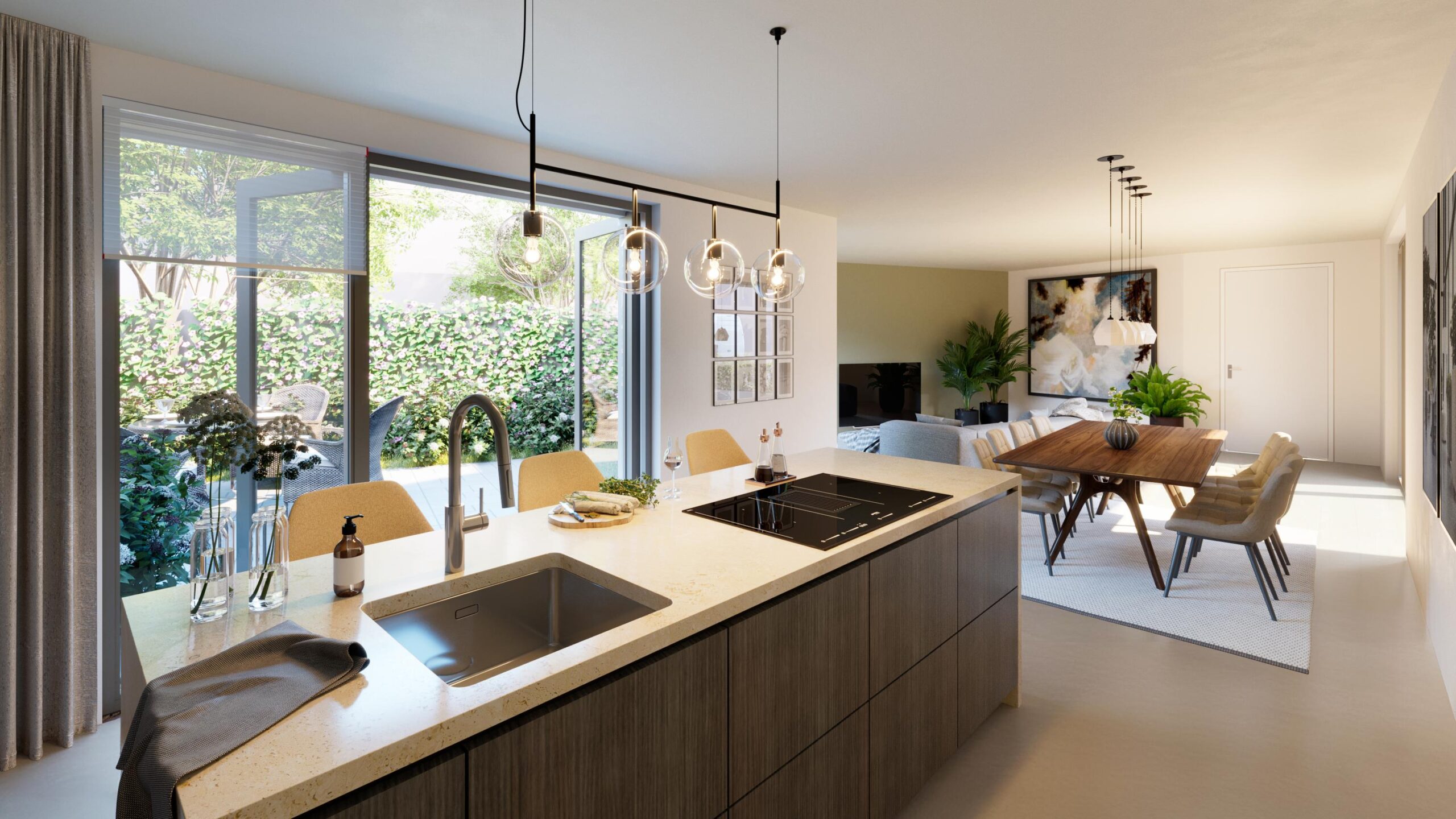 De royale woonkamer met open keuken kijkt uit op deze groene patio en vormt de ideale plek om te ontspannen, te koken en samen te zijn. Dankzij de grote glaspartijen baadt de leefruimte in daglicht en voelt de woning ruim en open aan.
