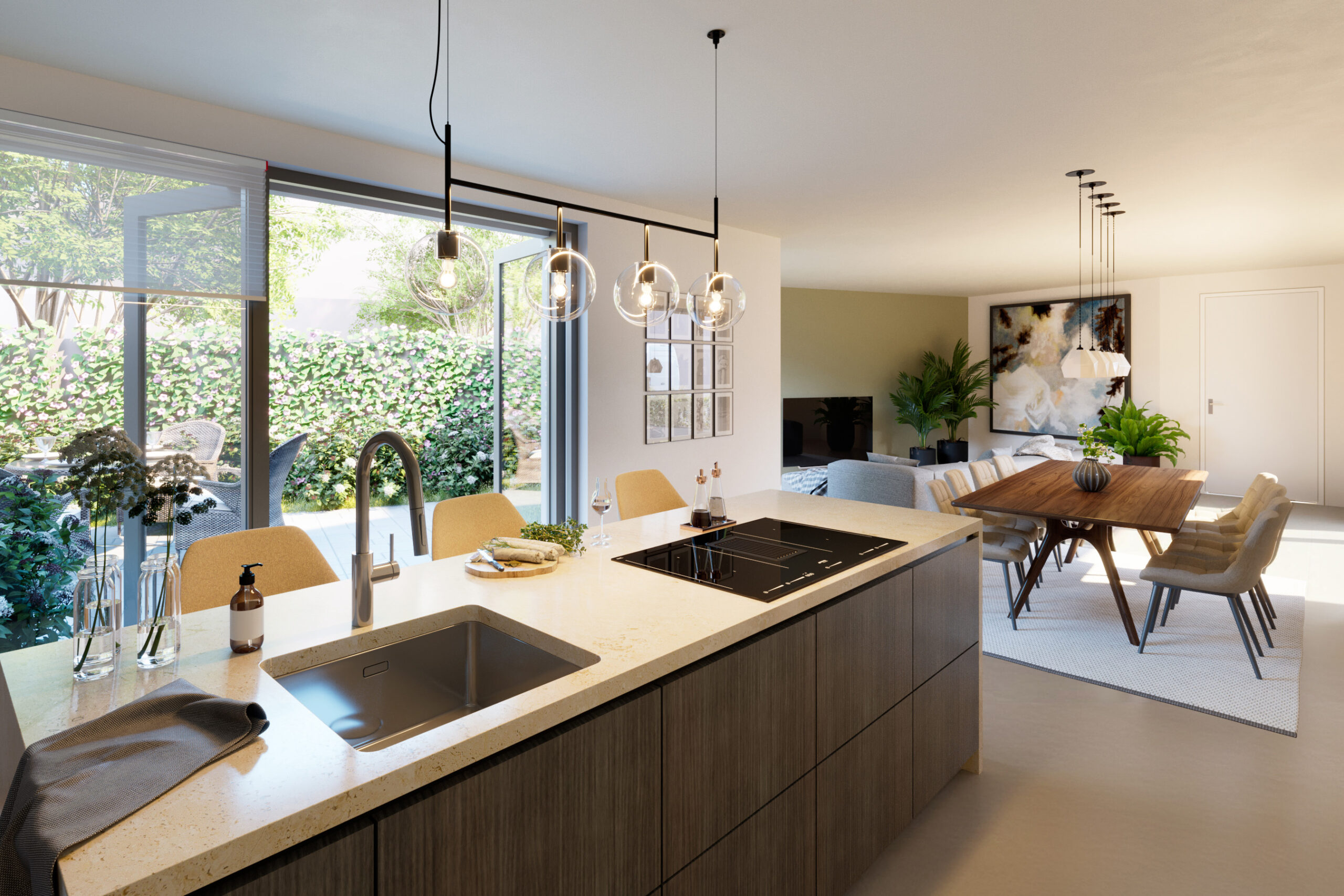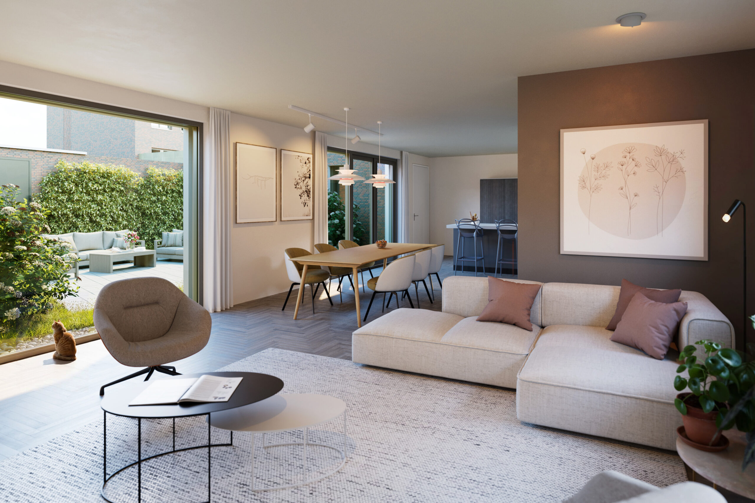 De royale woonkamer met open keuken kijkt uit op deze groene patio en vormt de ideale plek om te ontspannen, te koken en samen te zijn. Dankzij de grote glaspartijen baadt de leefruimte in daglicht en voelt de woning ruim en open aan.