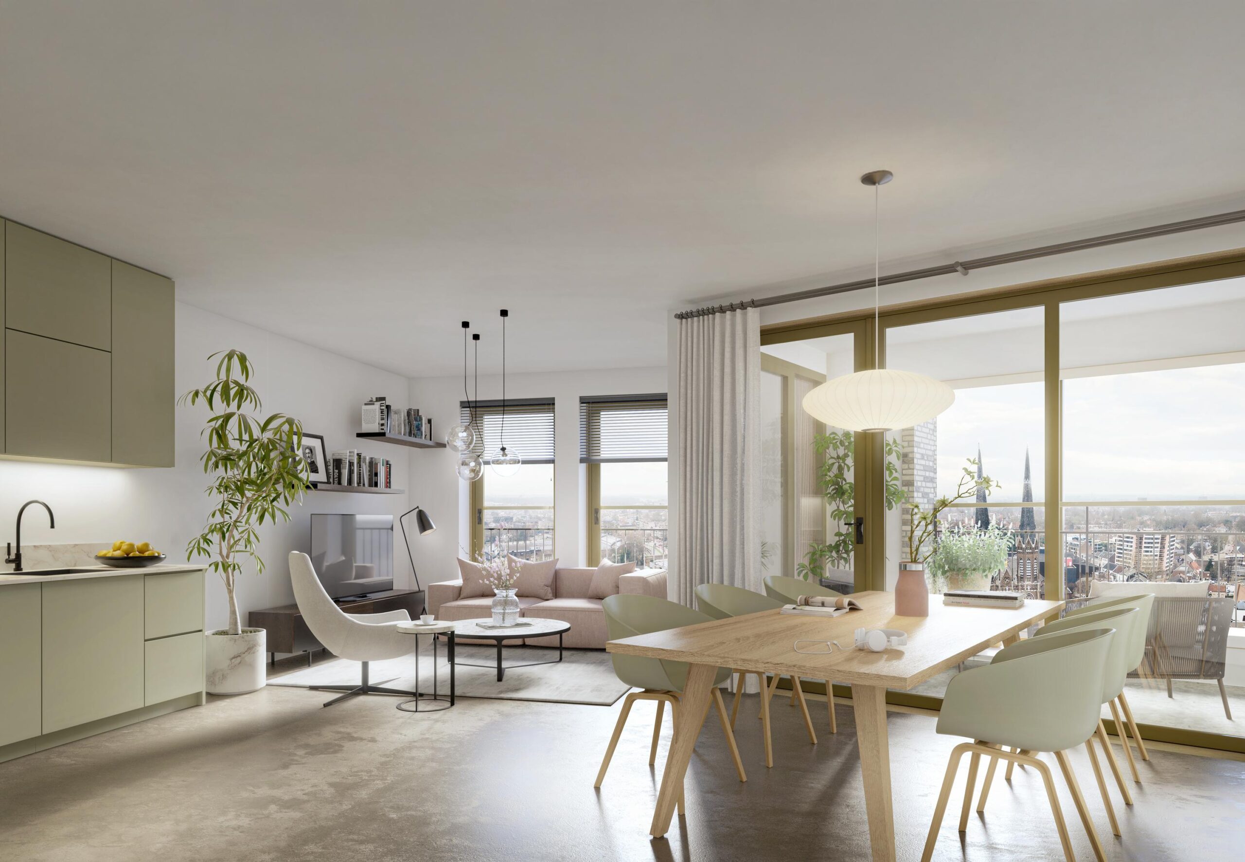 Op de 11e tot en met 19e verdieping aan de zuidoostzijde van woontoren Victoria bevindt zich dit hoekappartement. Dankzij het inpandige balkon op het oosten geniet je van een beschut zitplekje met fraai uitzicht op de karakteristieke St. Jozefkerk en het levendige stadsbeeld daaronder.
