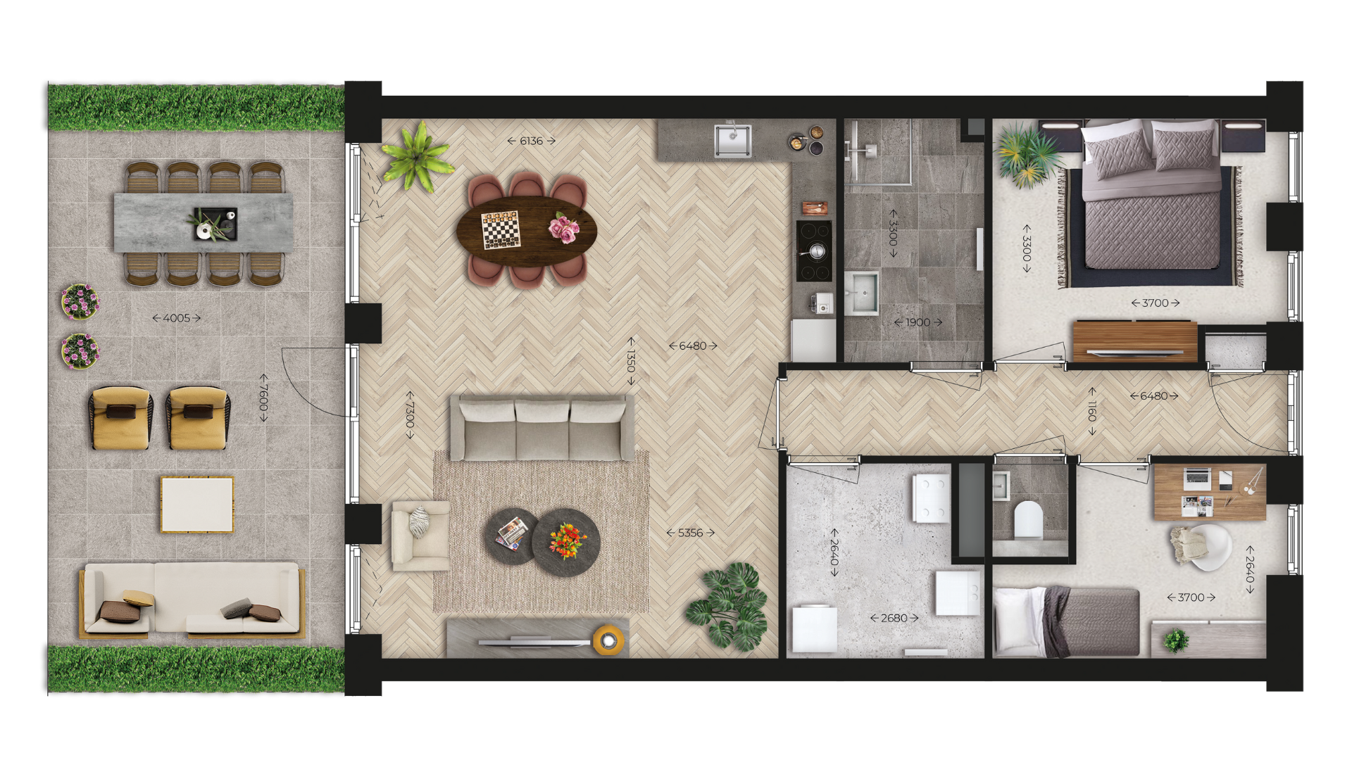 Tien grotere appartementen komen vooral op de begane grond en eerste verdieping aan de Bizetlaan. Twee van de grotere appartementen vormen hierop een uitzondering. Die komen op de begane grond en tweede verdieping aan de zijde van de Bachstraat en het binnenterrein. Deze grotere appartementen krijgen twee (slaap)kamers en variëren in oppervlak van 63 tot 100 m2. Ze beschikken bovendien ieder over een eigen berging op de begane grond.