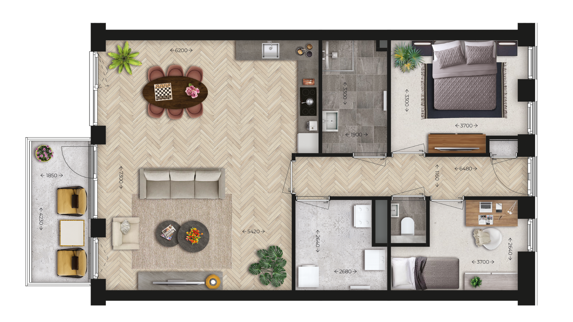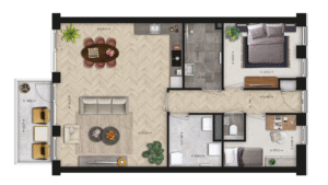 Tien grotere appartementen komen vooral op de begane grond en eerste verdieping aan de Bizetlaan. Twee van de grotere appartementen vormen hierop een uitzondering. Die komen op de begane grond en tweede verdieping aan de zijde van de Bachstraat en het binnenterrein. Deze grotere appartementen krijgen twee (slaap)kamers en variëren in oppervlak van 63 tot 100 m2. Ze beschikken bovendien ieder over een eigen berging op de begane grond.