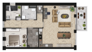 Tien grotere appartementen komen vooral op de begane grond en eerste verdieping aan de Bizetlaan. Twee van de grotere appartementen vormen hierop een uitzondering. Die komen op de begane grond en tweede verdieping aan de zijde van de Bachstraat en het binnenterrein. Deze grotere appartementen krijgen twee (slaap)kamers en variëren in oppervlak van 63 tot 100 m2. Ze beschikken bovendien ieder over een eigen berging op de begane grond.