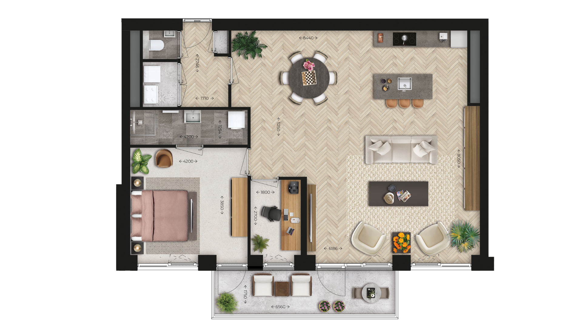 Tien grotere appartementen komen vooral op de begane grond en eerste verdieping aan de Bizetlaan. Twee van de grotere appartementen vormen hierop een uitzondering. Die komen op de begane grond en tweede verdieping aan de zijde van de Bachstraat en het binnenterrein. Deze grotere appartementen krijgen twee (slaap)kamers en variëren in oppervlak van 63 tot 100 m2. Ze beschikken bovendien ieder over een eigen berging op de begane grond.