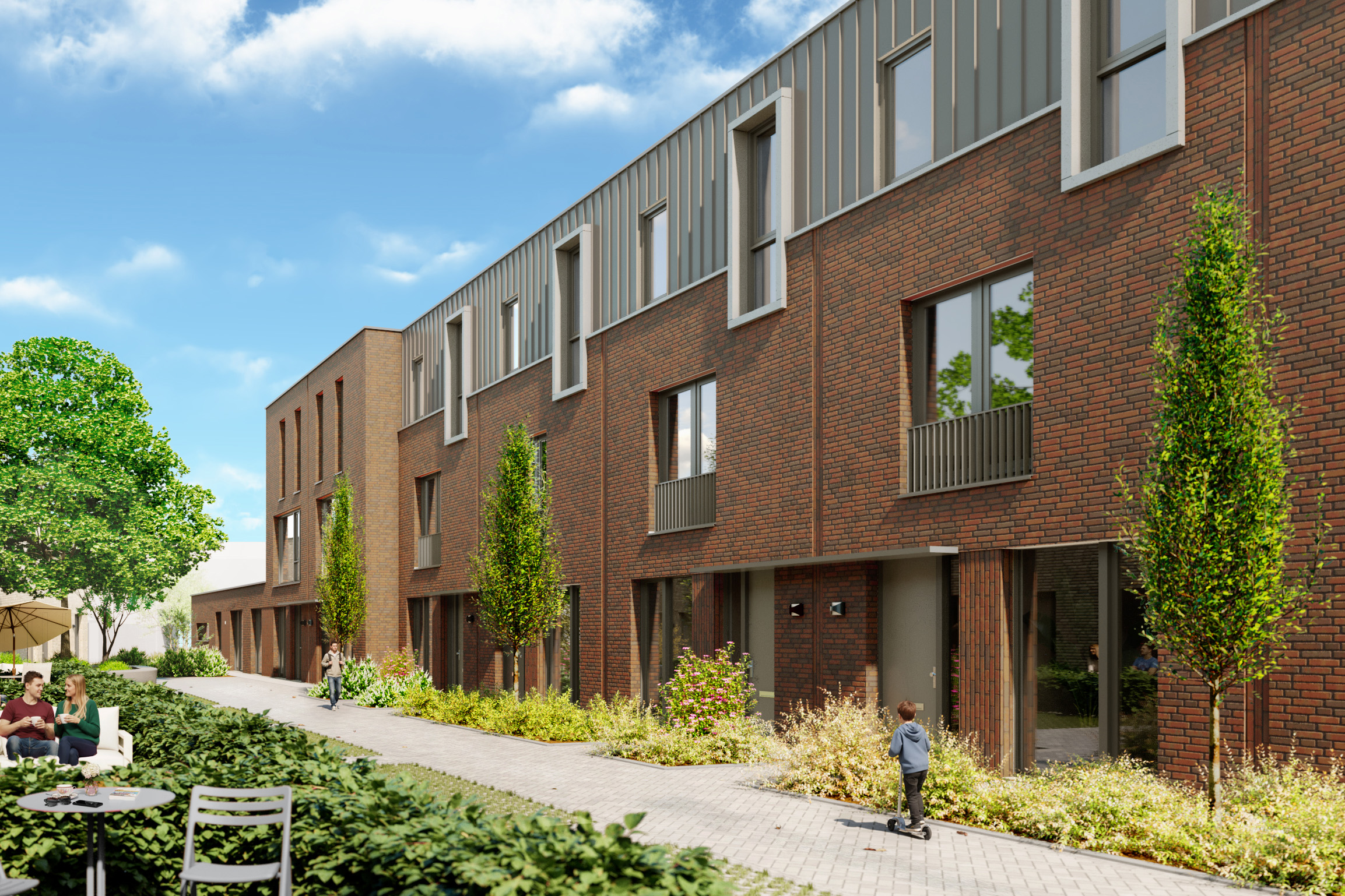 Een Delftse stoep tussen de voorgevel en het openbaar gebied biedt ruimte voor een bankje of plantenbakken voor extra sfeer en gezelligheid in het woonstraatje.