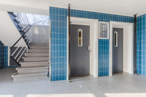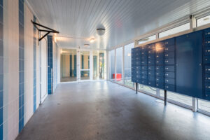 Centrale entree met intercom met toegang tot het trappenhuis en liftinstallaties.