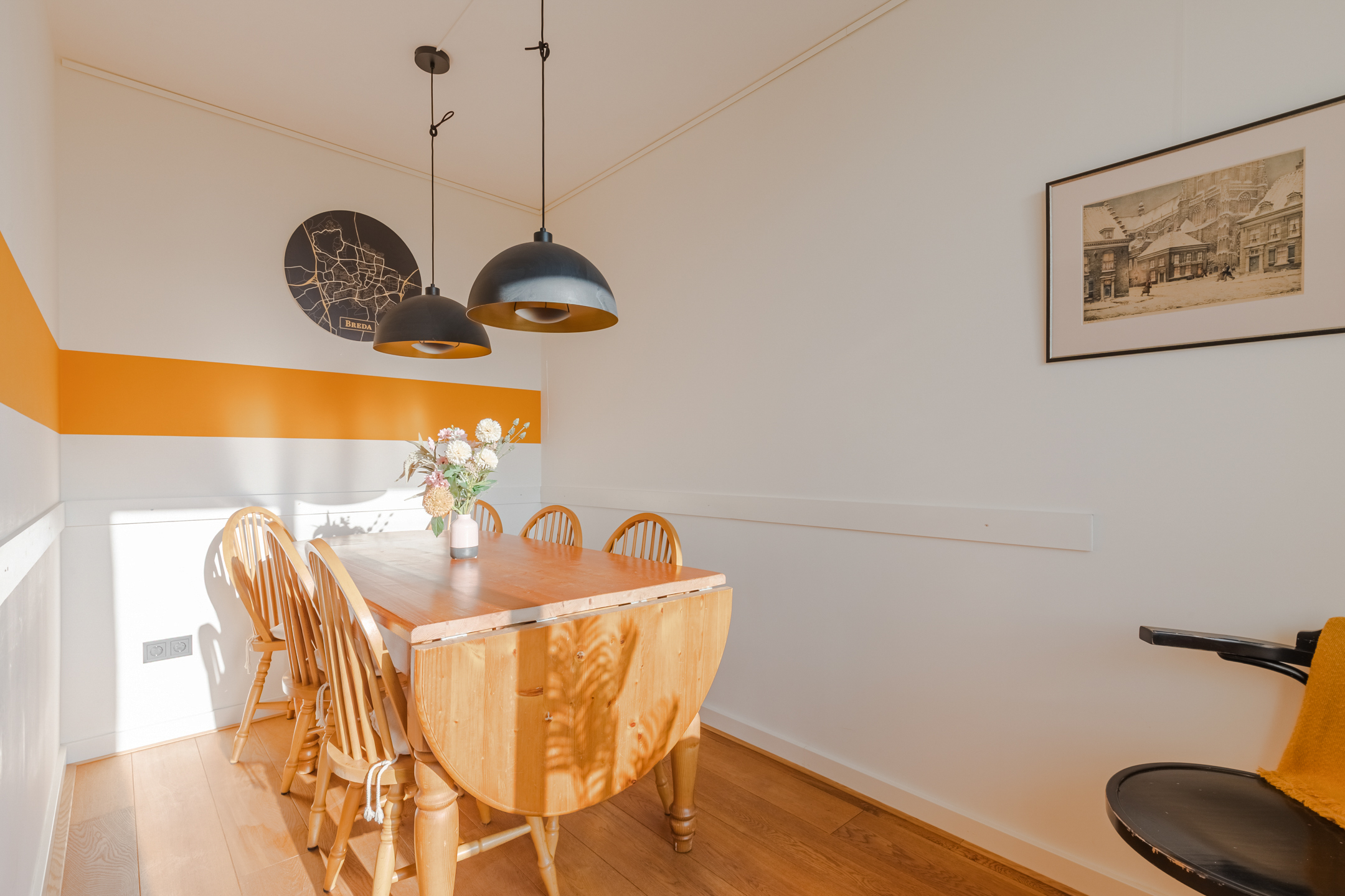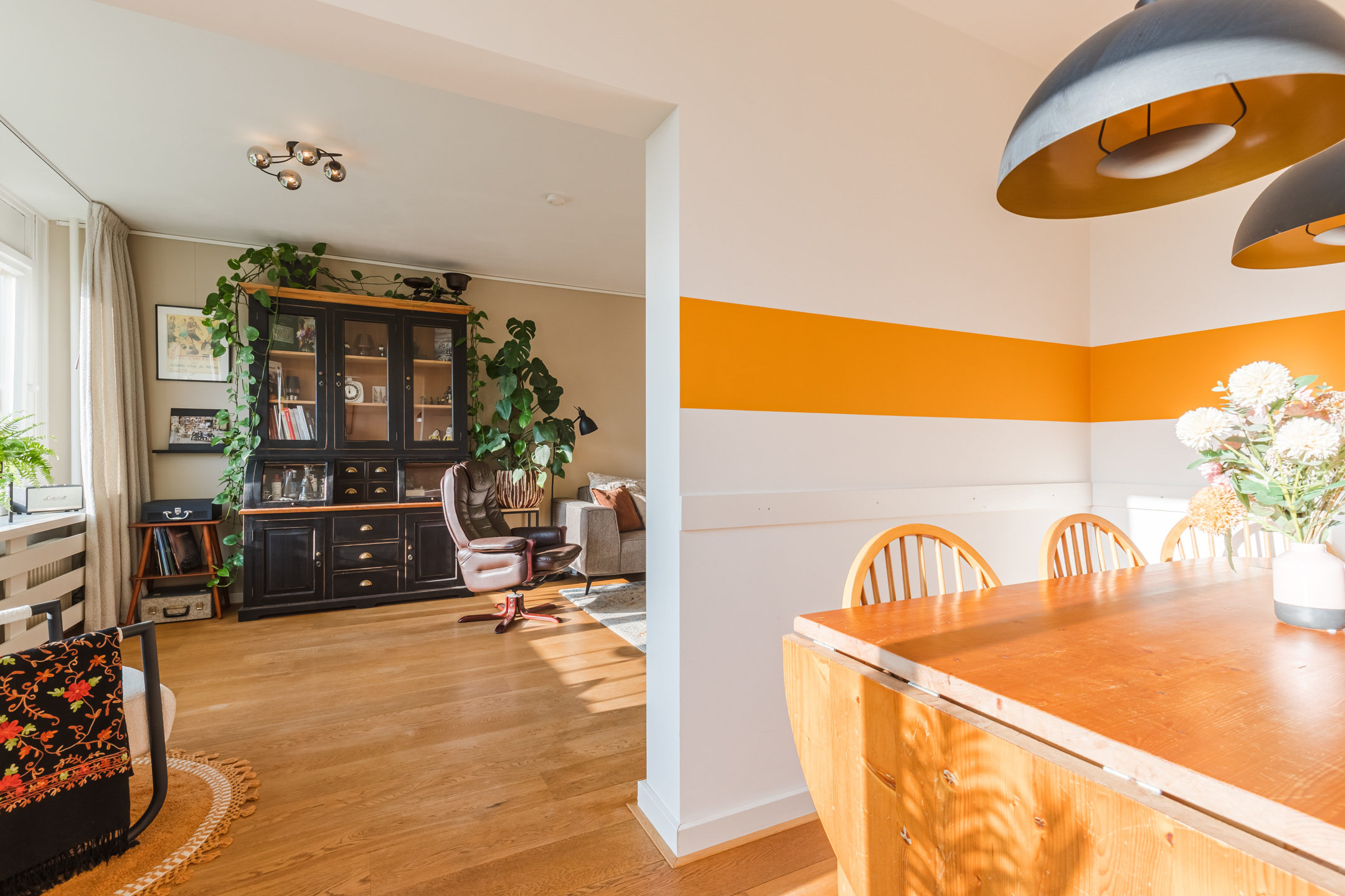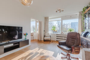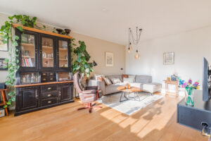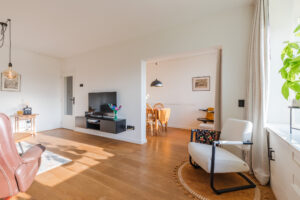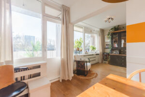 De sfeervolle woonkamer (ca. 21 m²) met houten vloer geniet een prettige daglicht inval door de fraaie raampartijen en is voorzien van een nette radiatorombouw. De woonkamer staat in halfopen verbinding met de zijkamer, die momenteel is ingericht als eetkamer (ca. 7 m²) en directe toegang biedt tot het balkon.
