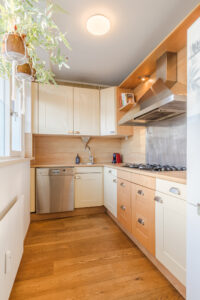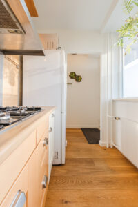 De keuken is volledig uitgerust en voorzien van een 6-pitsgasfornuis, rvs-afzuigkap, vaatwasser, losstaande koel-/vriescombinatie en diverse boven- en onderkasten. Vanuit de keuken heeft u dankzij het grote raam een vrij en prettig uitzicht.