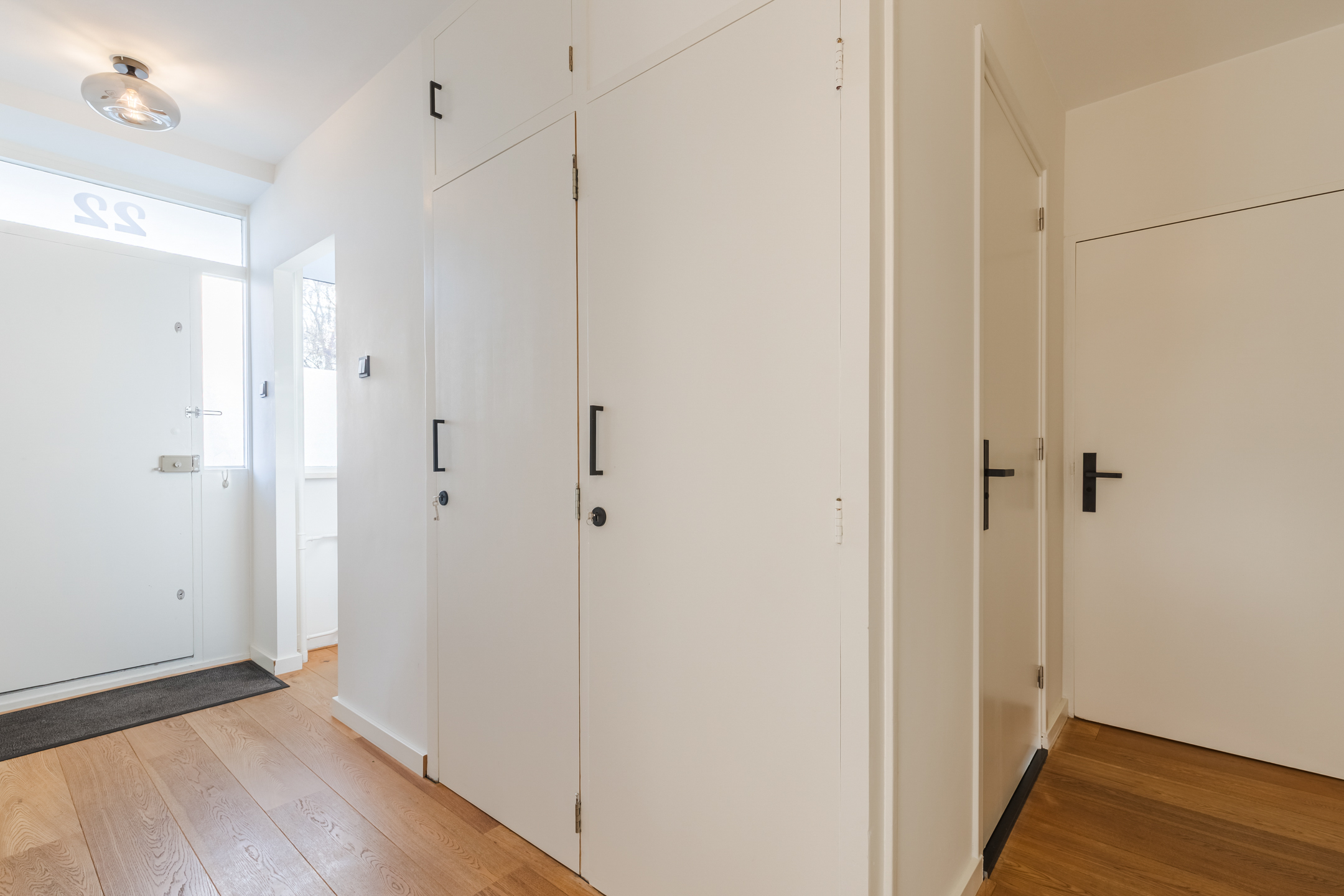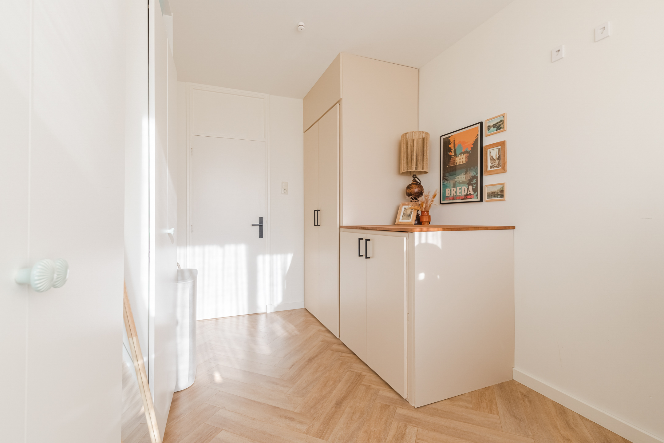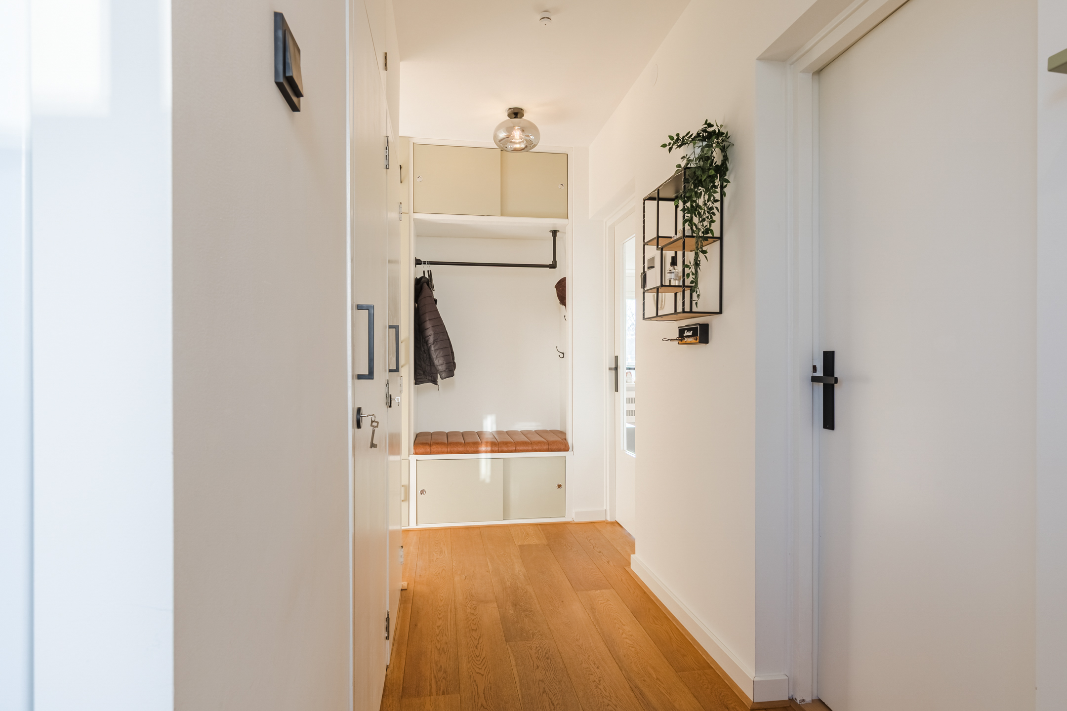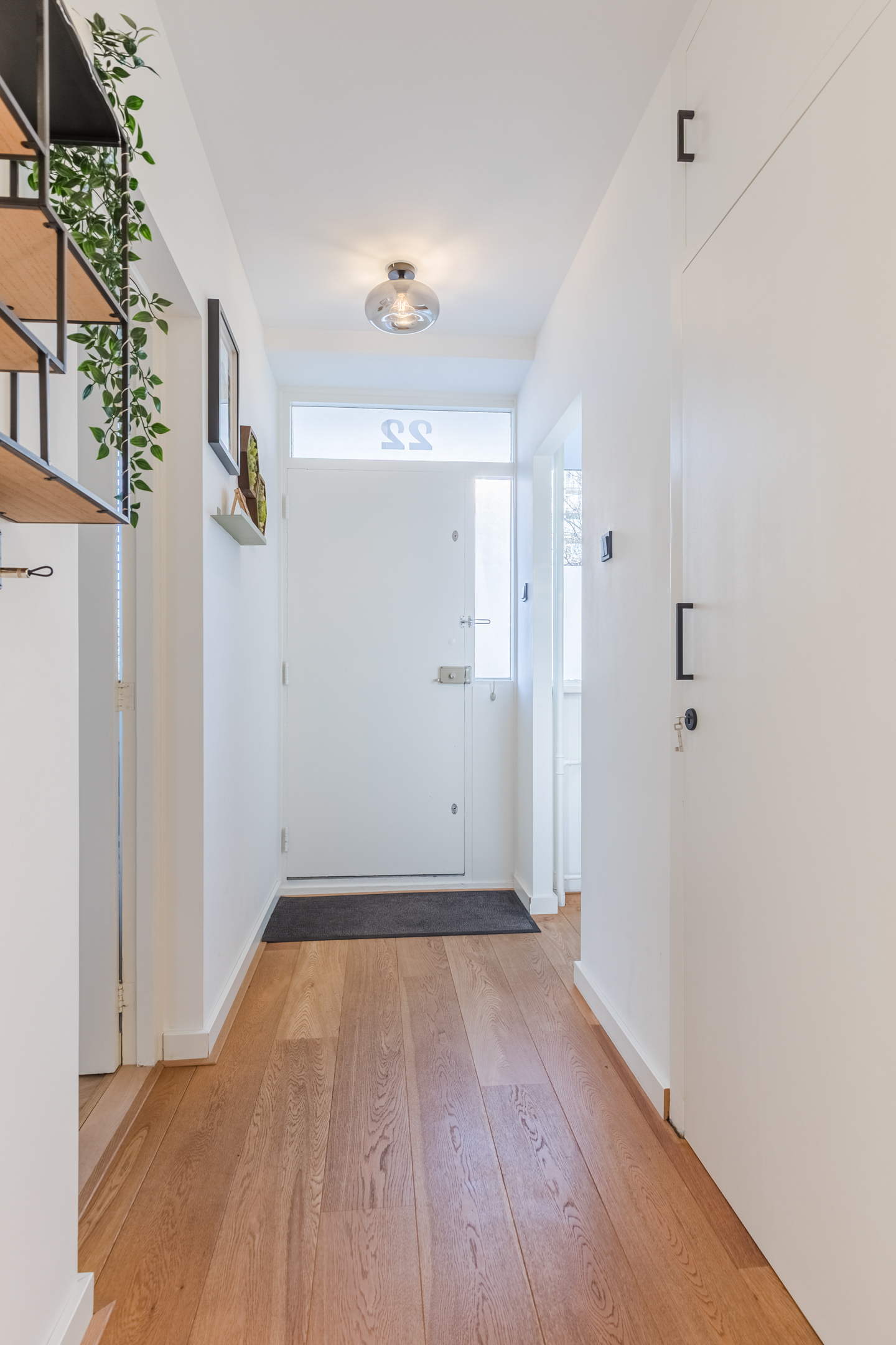 De entree/hal (ca. 4.42 x 1.13 m.) is voorzien van vaste kast, sfeervolle garderobe nis, meterkast (voledig gemoderniseerd) en toegang tot de open keuken, de twee slaapkamers, badkamer, de toiletruimte en de woonkamer.