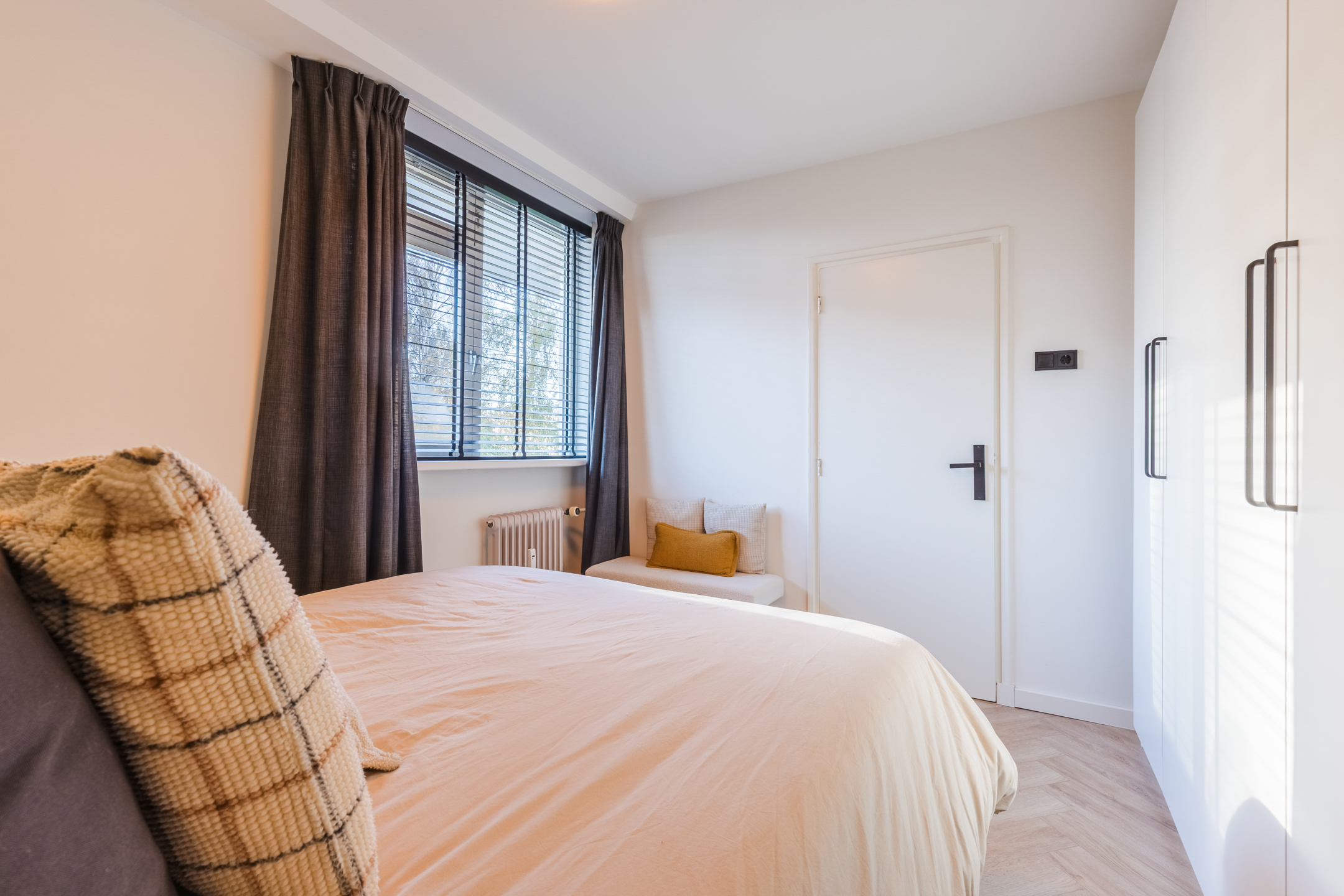 De aan de voorzijde gelegen slaapkamer (ca. 3.59 x 3.31 m) met in visgraat gelegde laminaatvloer is ruim opgezet en biedt ook de mogelijkheid voor het plaatsen van een kastenwand.