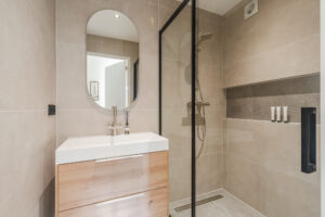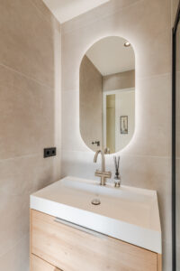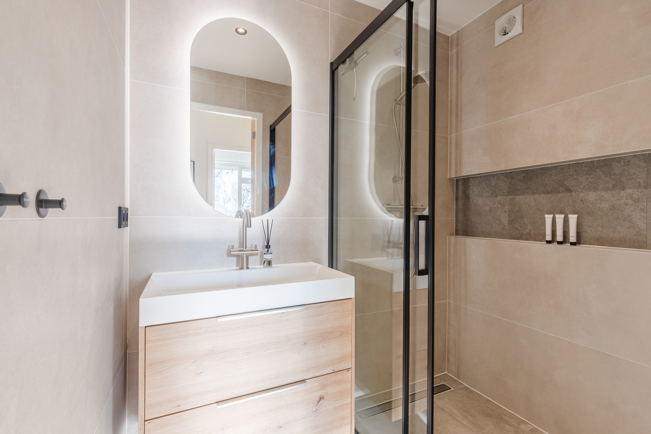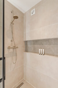 De geheel betegelde badkamer (ca. 1.95 x 1.40 m) uit 2025 met inloopdouche, douchedrain en handige wand nis, wastafel in meubel met verlichte spiegel en mechanische ventilatie.