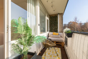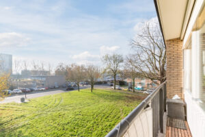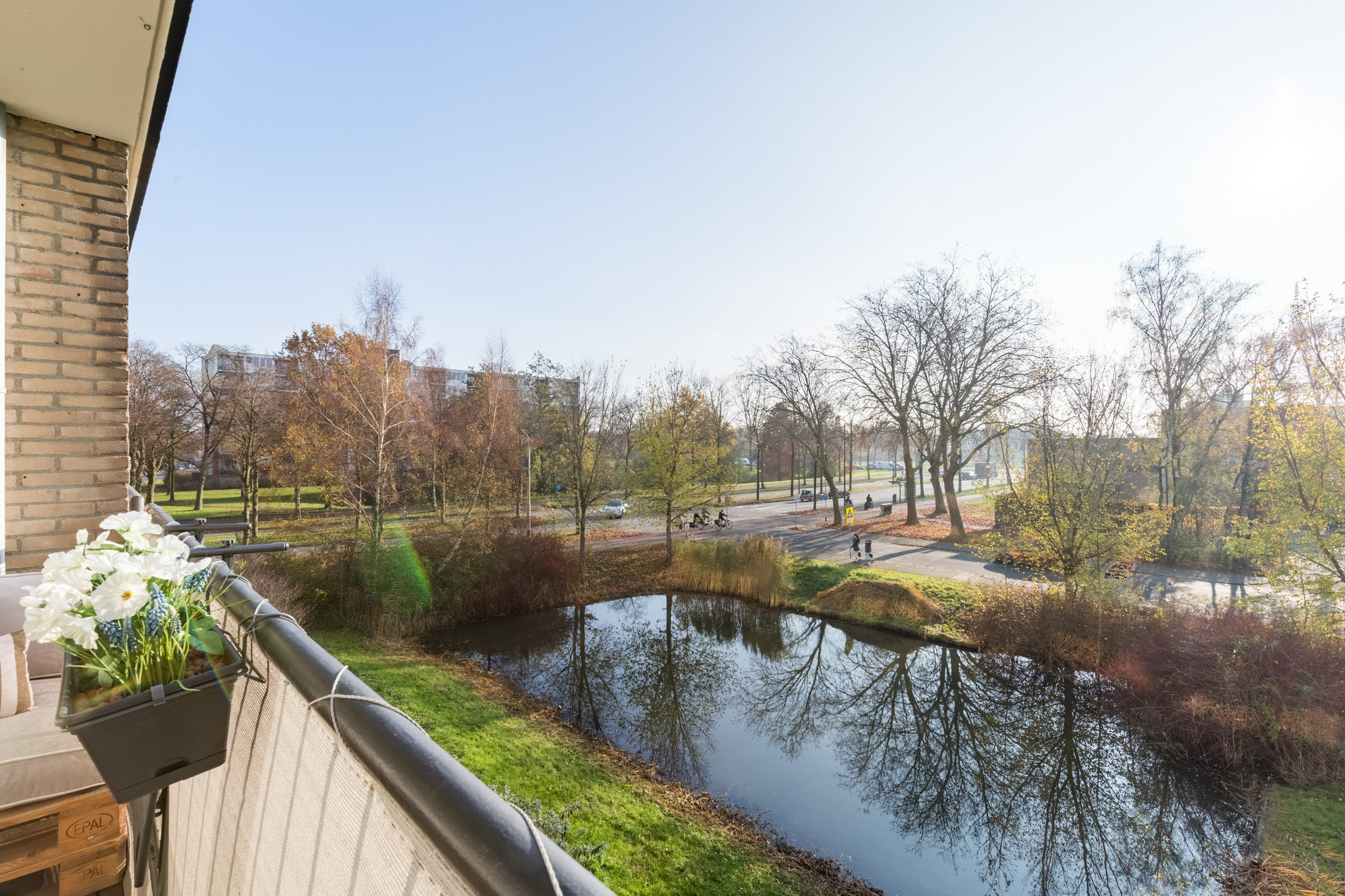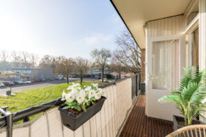 Het balkon, gunstig op het zuiden gelegen en voorzien van vlonderdertegels, biedt een mooi uitzicht over de vijver en de groene omgeving.
