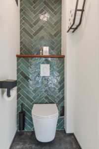 Separaat toilet met visgraat tegel wandafwerking, wandcloset en tegel vloer.