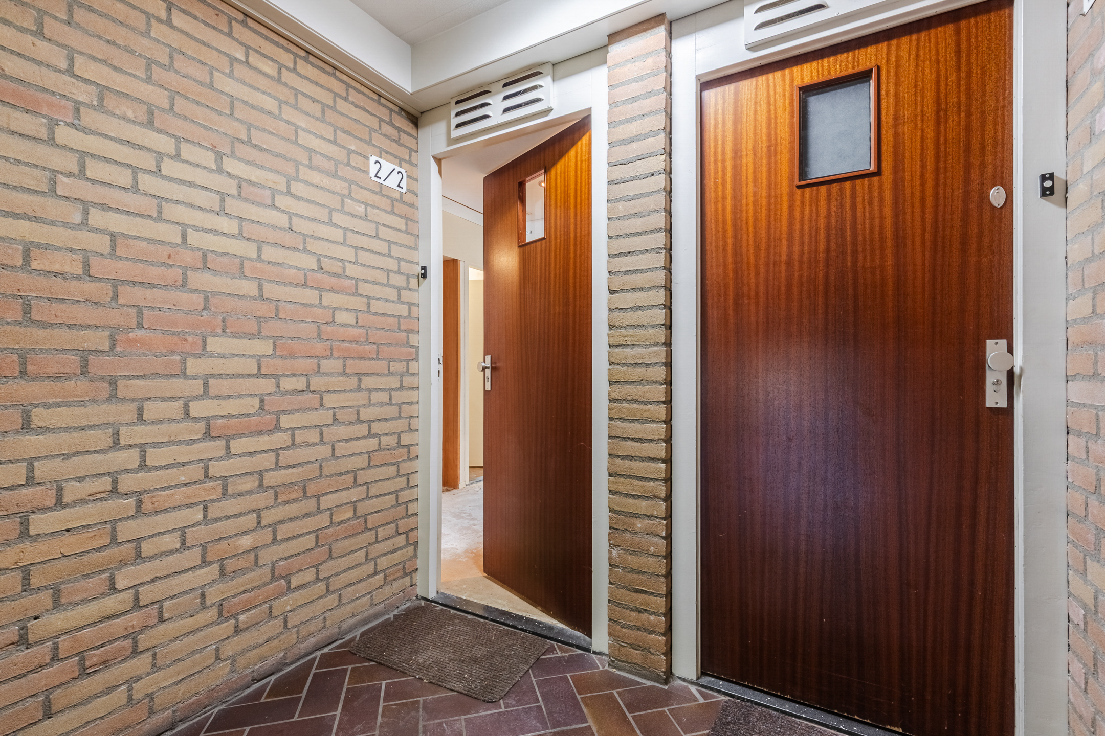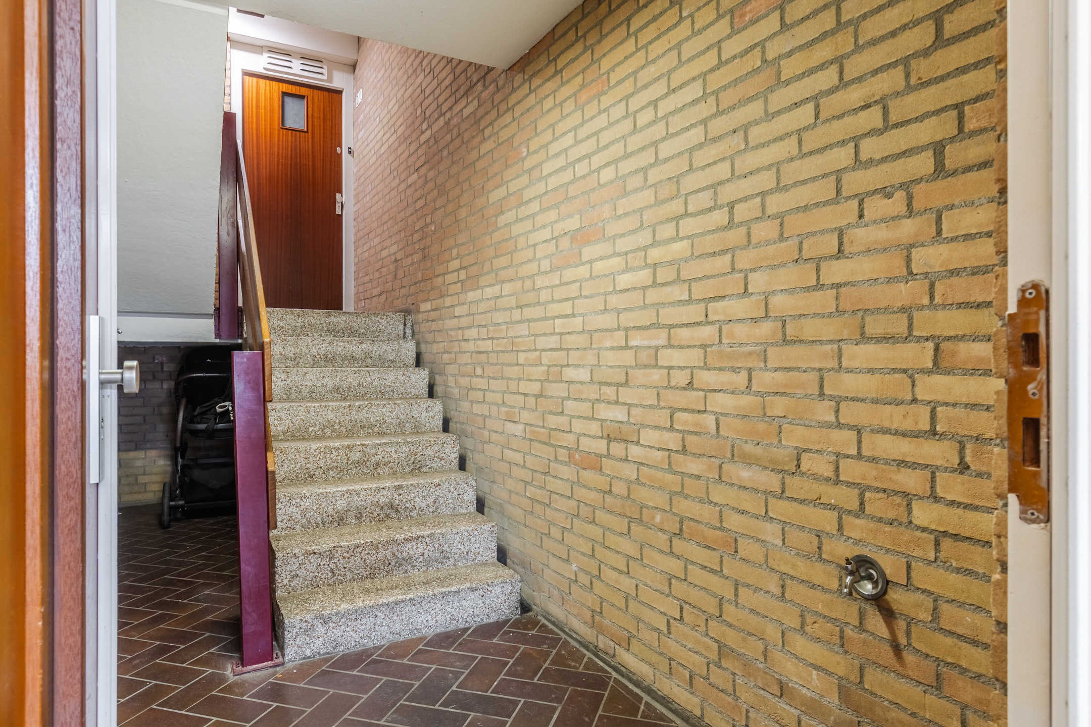 Centrale entree met trapopgang, bellentableau/brievenbussen en intercominstallatie. De entree geeft toegang tot de afgesloten binnenplaats, waar tevens toegang is tot de garage box.