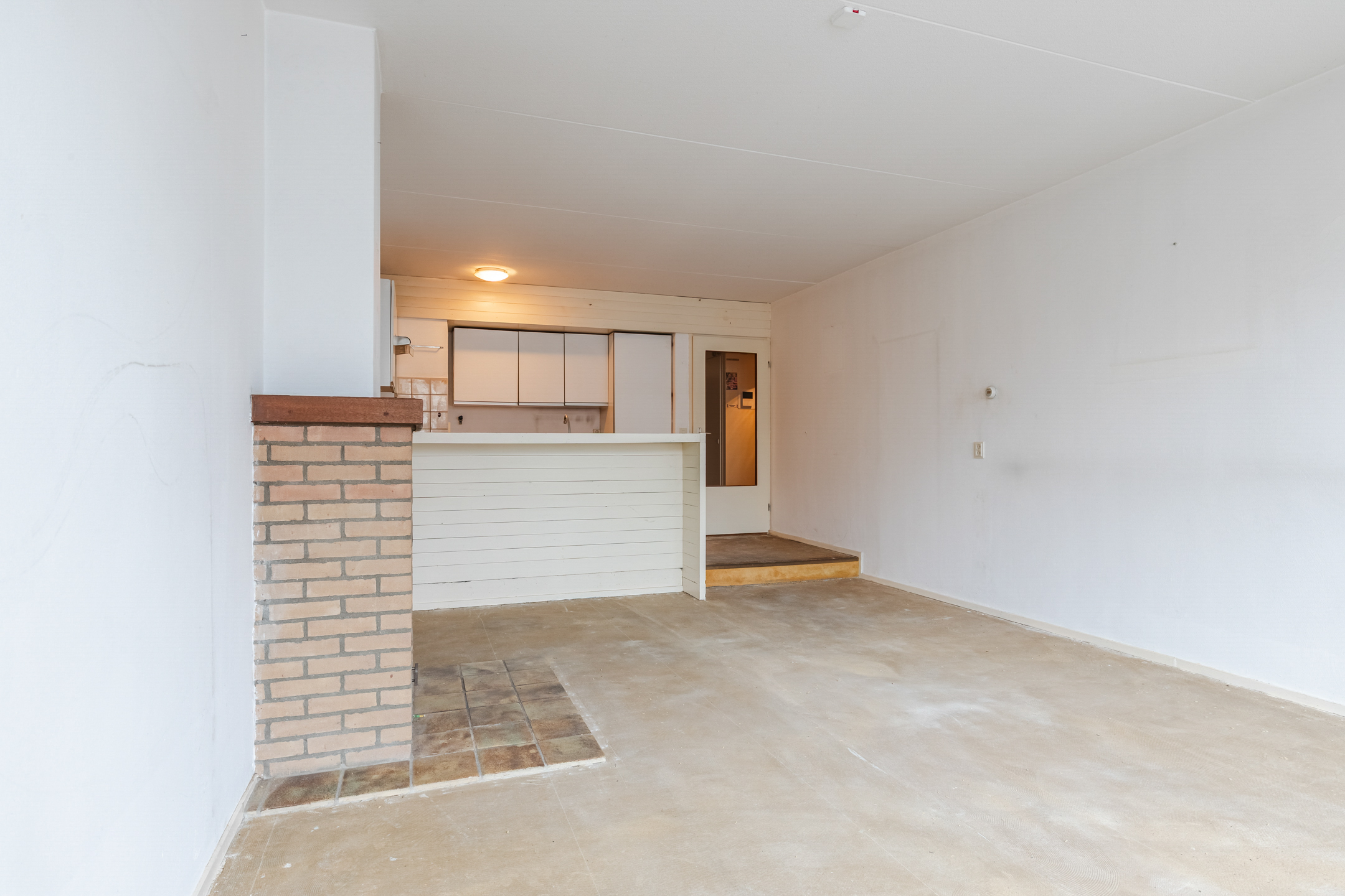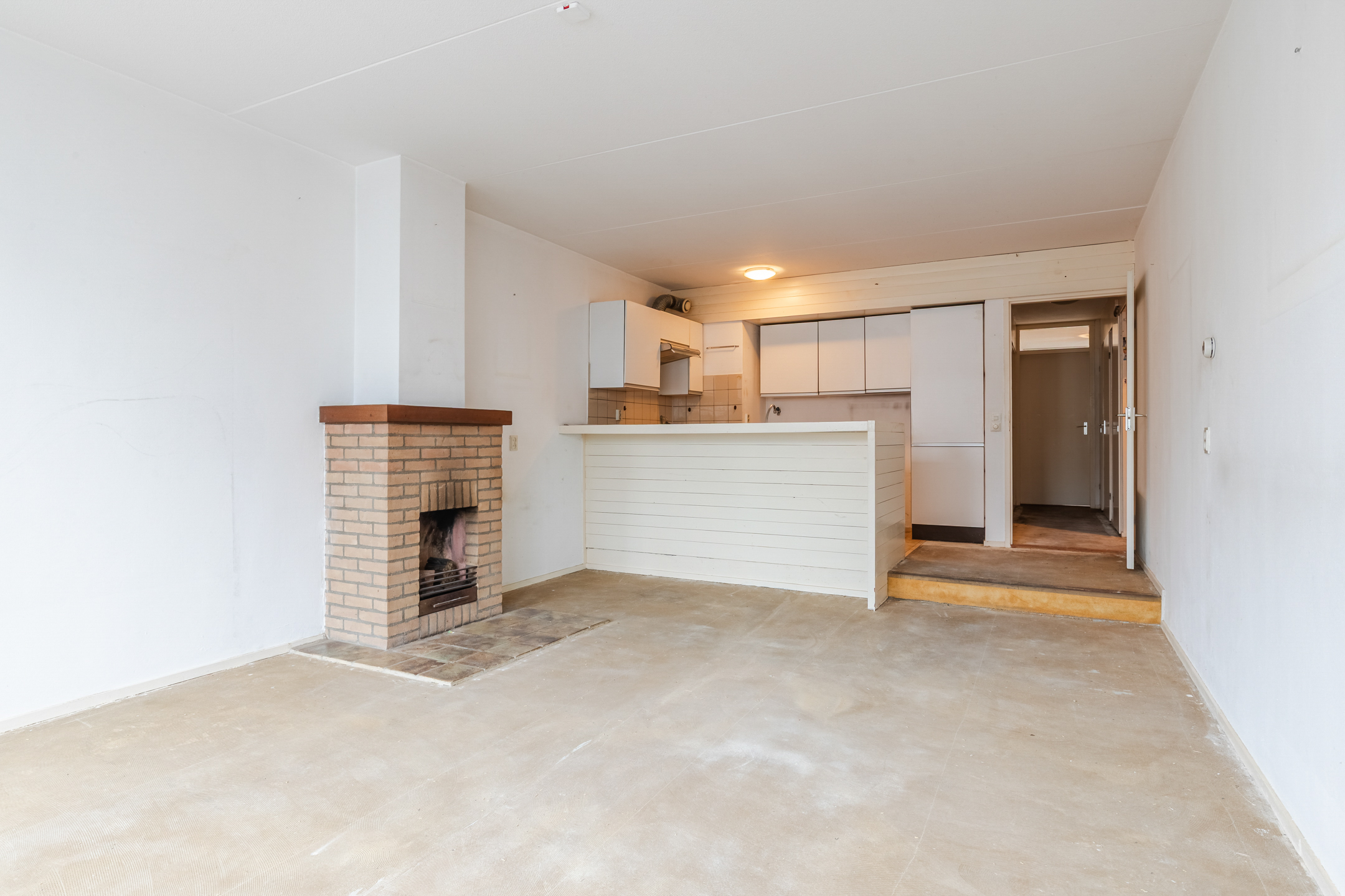 Met een gemetselde schouw en een half open keuken met een eenvoudige keukeninrichting.