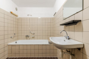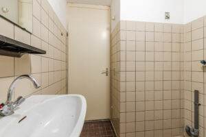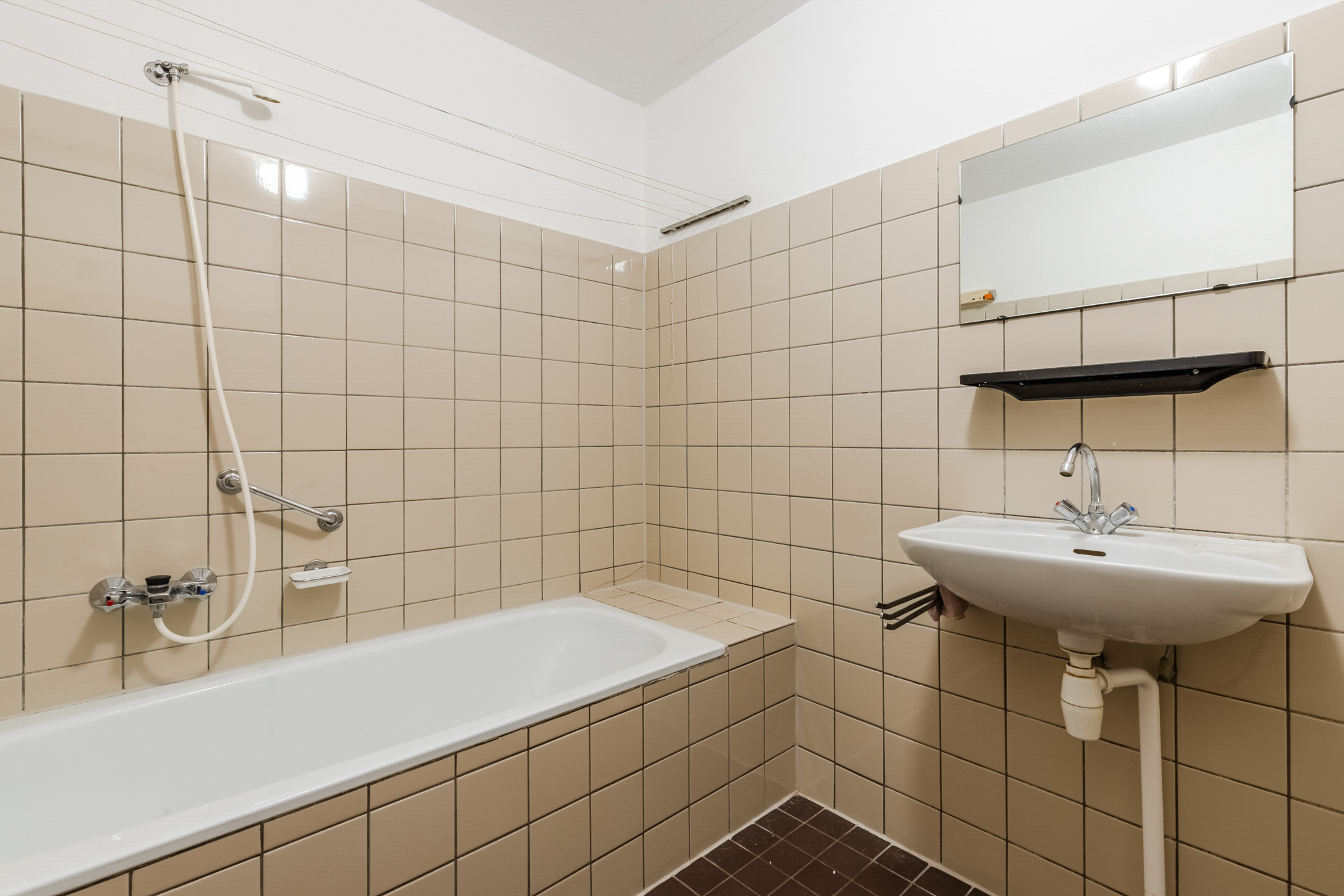 Gedeeltelijk betegeld ca. 2.00x2.70 m. met ligbad, wastafel en aansluitingen ten behoeve van de wasapparatuur.