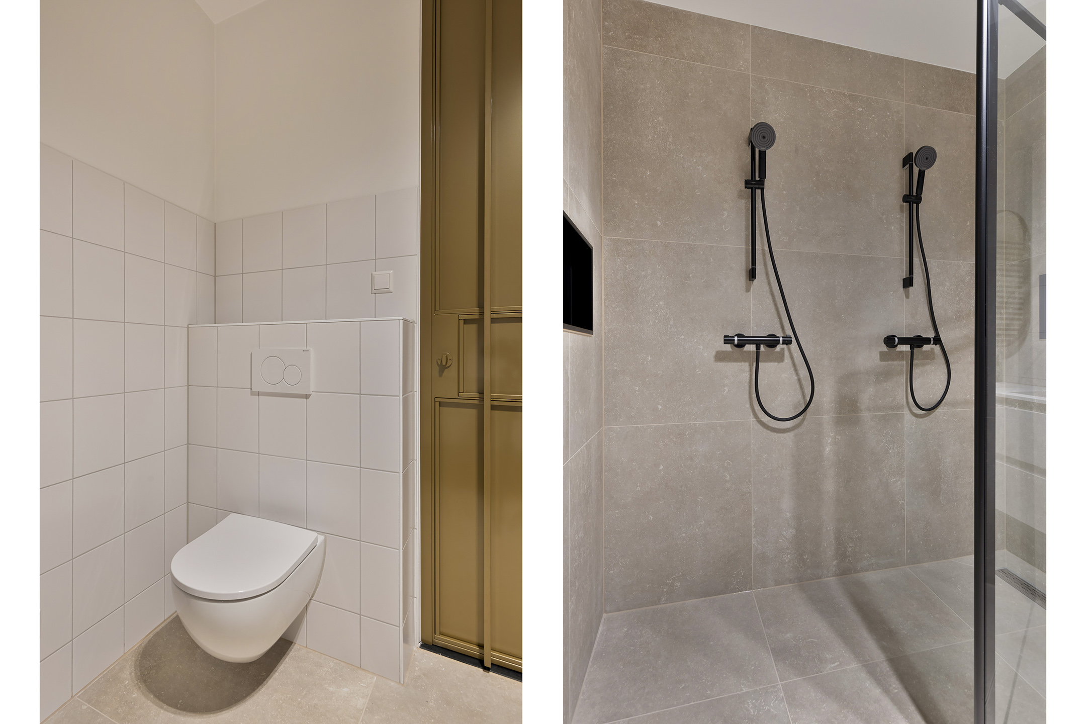 De badkamer (ca. 7 m²) is gedeeltelijk betegeld en ruim van opzet. voorzien van een ruime dubbele inloopdouche met draingoot, dubbele wastafel in meubel en een elektrische designradiator.