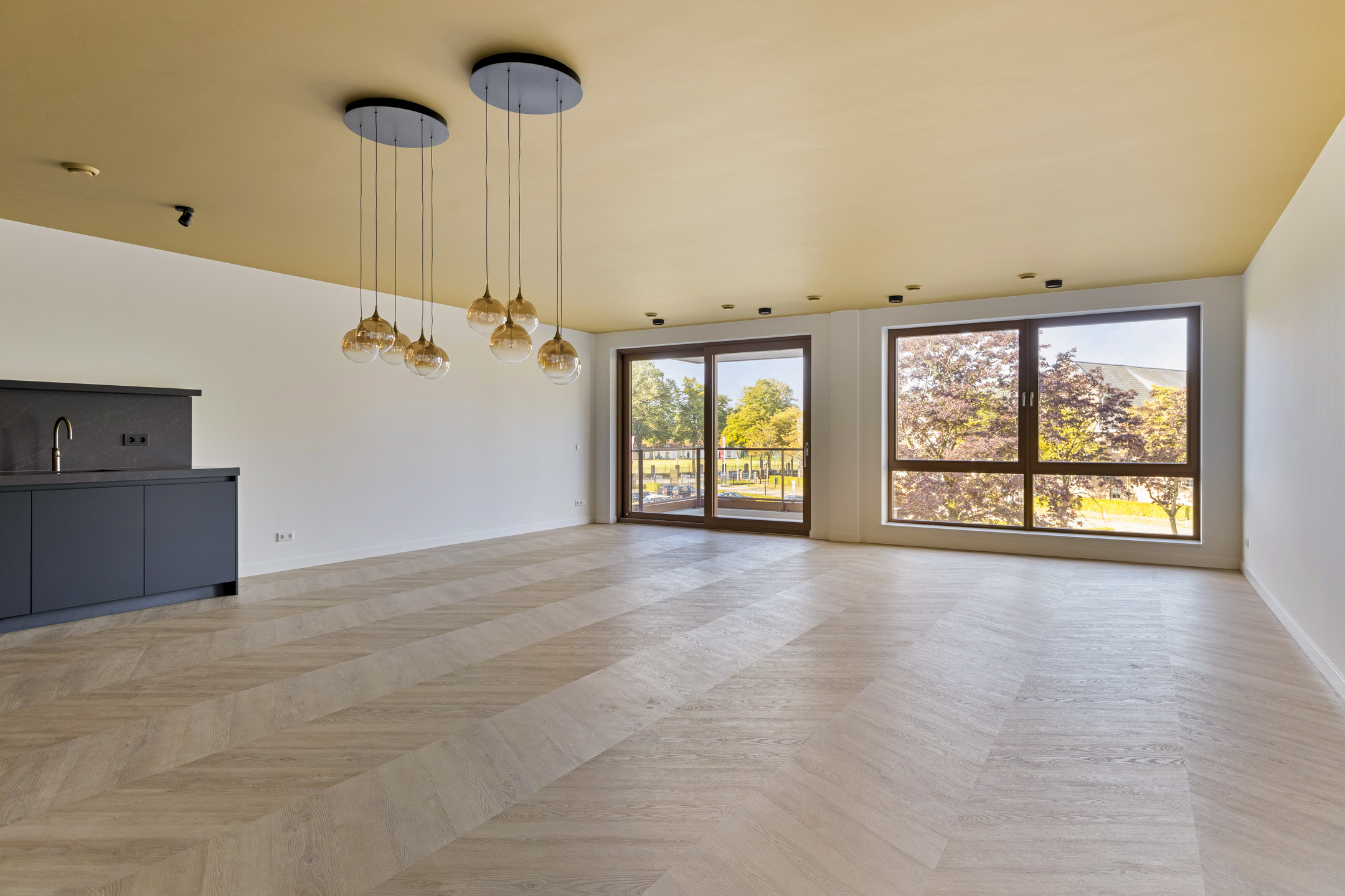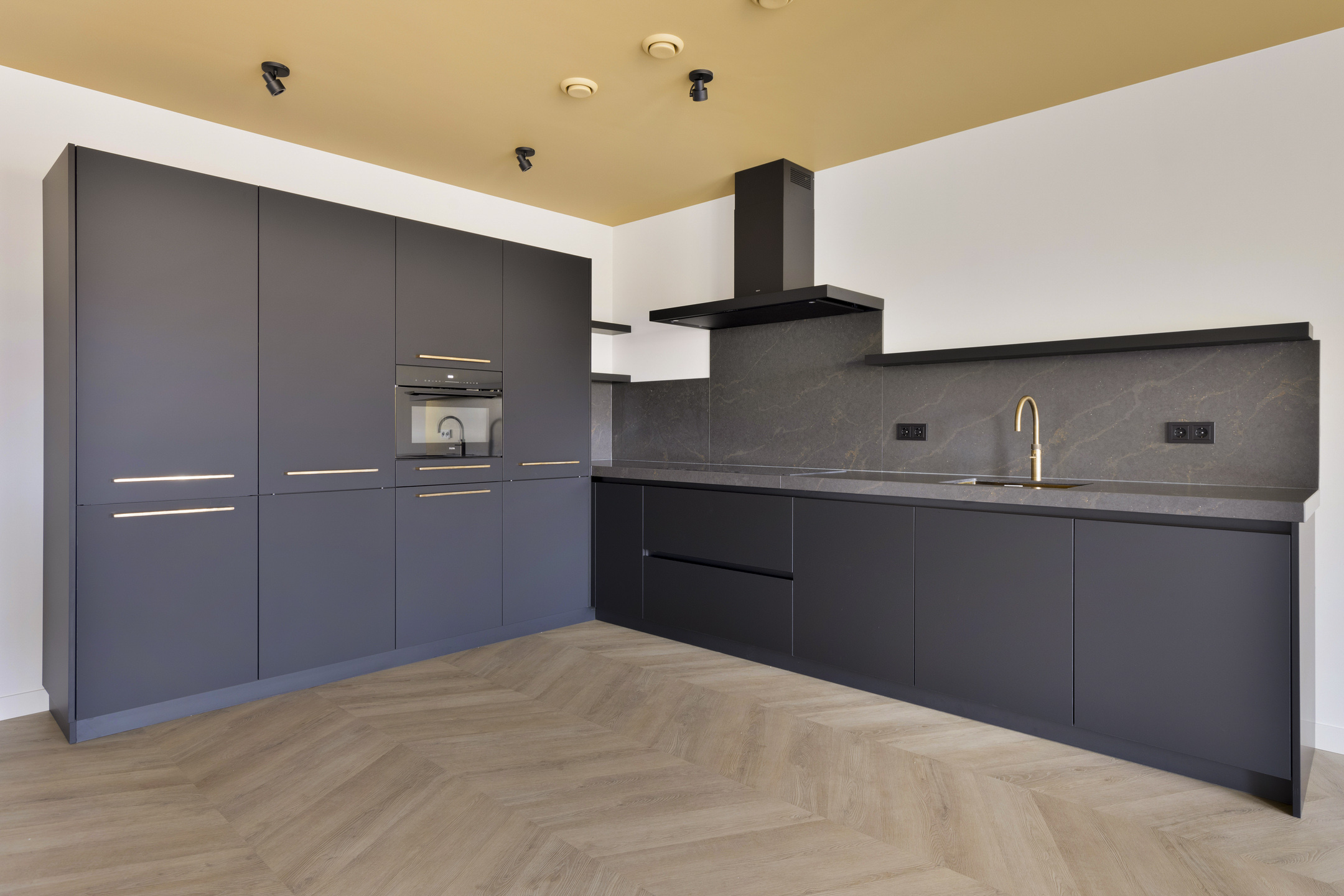 De riante living (ca. 66 m²) kent een prettige lichtinval dankzij de grote raampartijen die mooi uitzicht geven over de stad en straks "de Nieuwe Mark". De strakke afwerking draagt bij aan een rustige en moderne uitstraling. Vanuit de woonkamer heeft u direct toegang tot het gunstig op het westen gesitueerde balkon (ca. 8 m² ), een fijne buitenruimte waar u in alle rust kunt ontspannen. De luxe L-vormige keukeninrichting is compleet afgewerkt met hoogwaardige inbouwapparatuur.