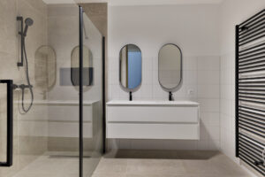 De badkamer (ca. 7 m²) is gedeeltelijk betegeld en ruim van opzet. voorzien van een ruime dubbele inloopdouche met draingoot, dubbele wastafel in meubel en een elektrische designradiator.