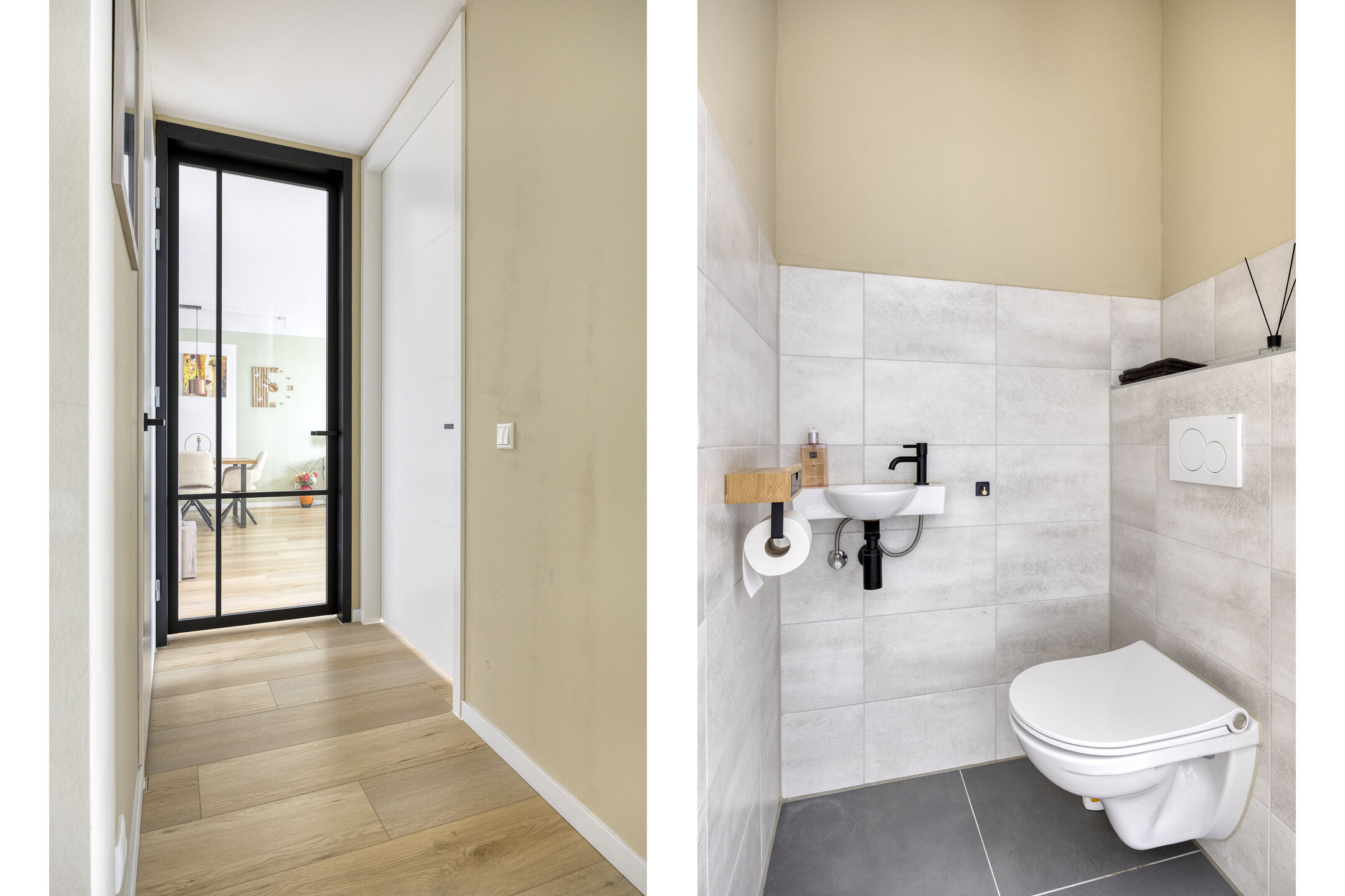 Entree/hal met meterkast, gedeeltelijk betegelde toiletruimte met wandcloset voorzien van inbouwreservoir en fonteintje en een praktische berging/wasruimte (ca. 2.30x2.85 m.) met unit ten behoeve van de mechanische ventilatie met warmte terugwin installatie en aansluitingen ten behoeve van de wasapparatuur.