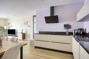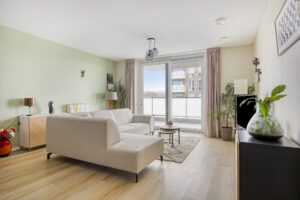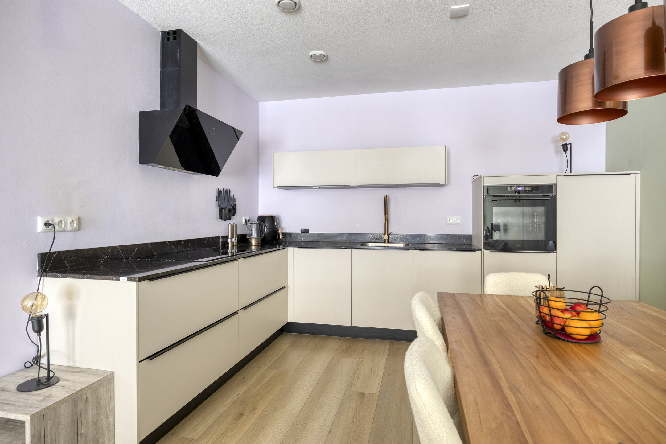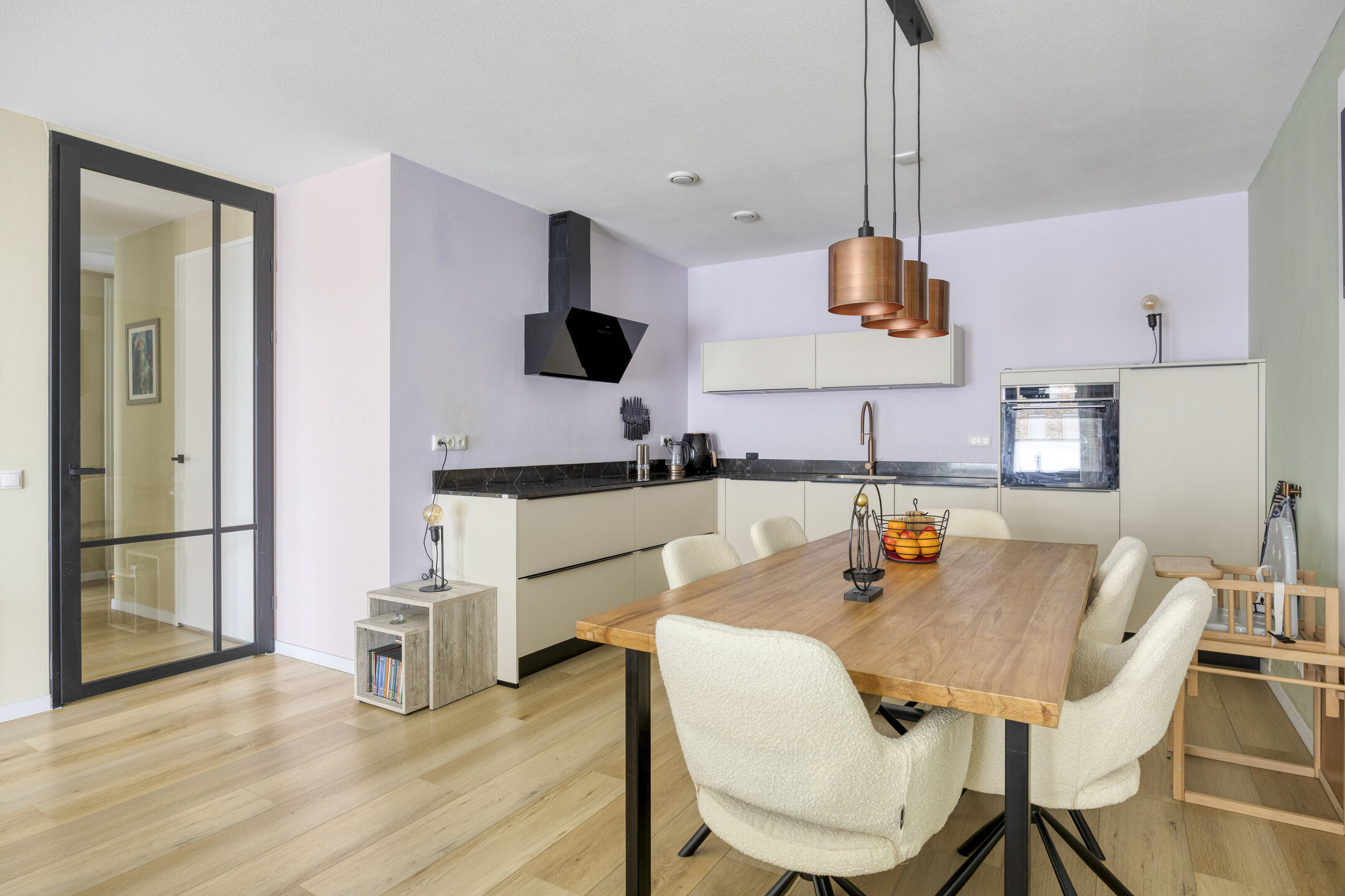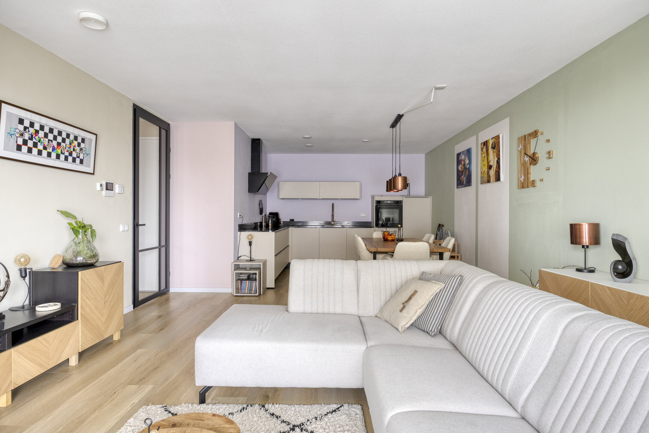 Royale living (ca. 37 m²) met schuifpui naar een ruim balkon (ca. 7 m²) gunstig gesitueerd op het westen en een open keuken met een L-vormige keukeninrichting voorzien van inductie kookplaat, afzuigkap, koelkast, elektrische oven en een vaatwasser.