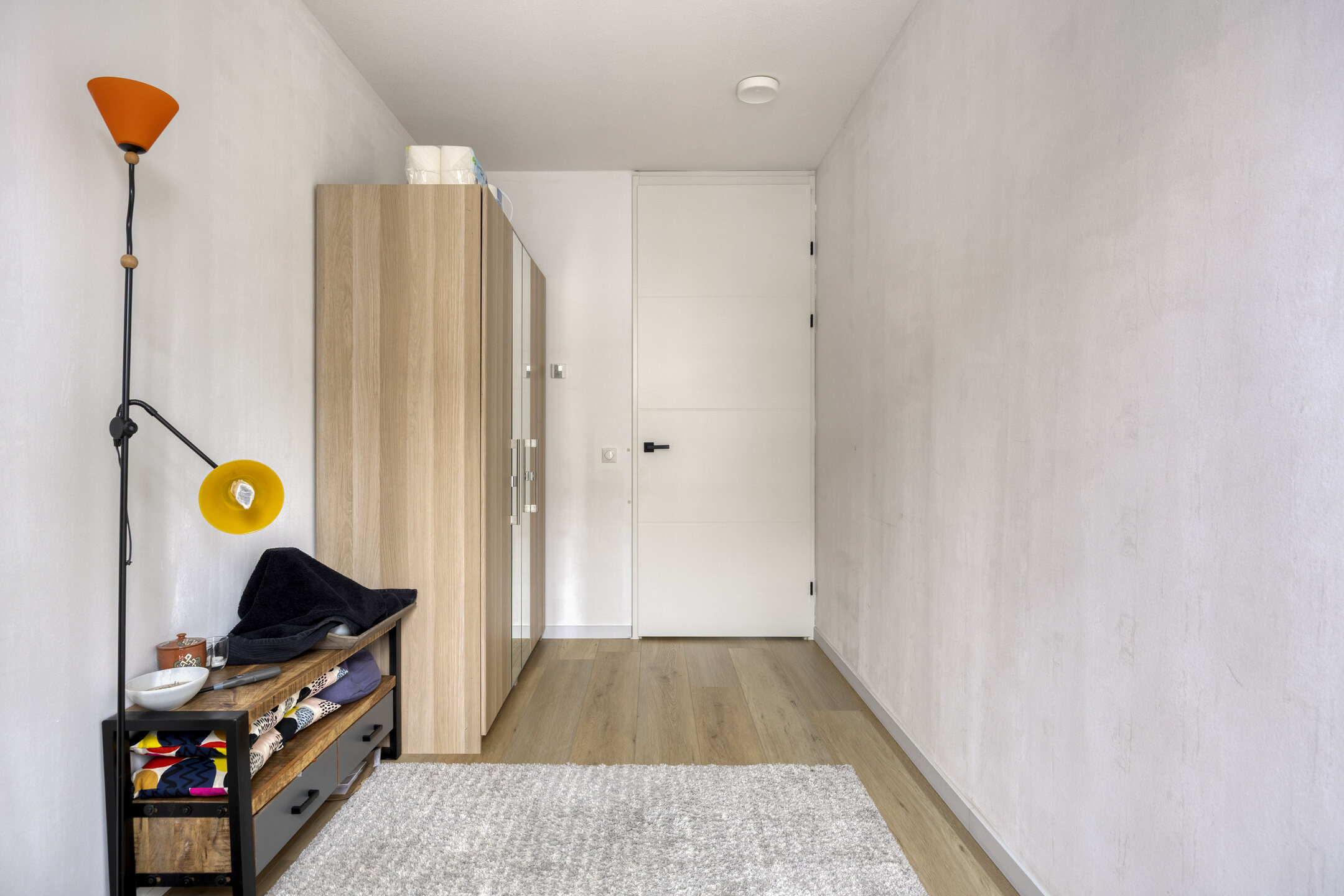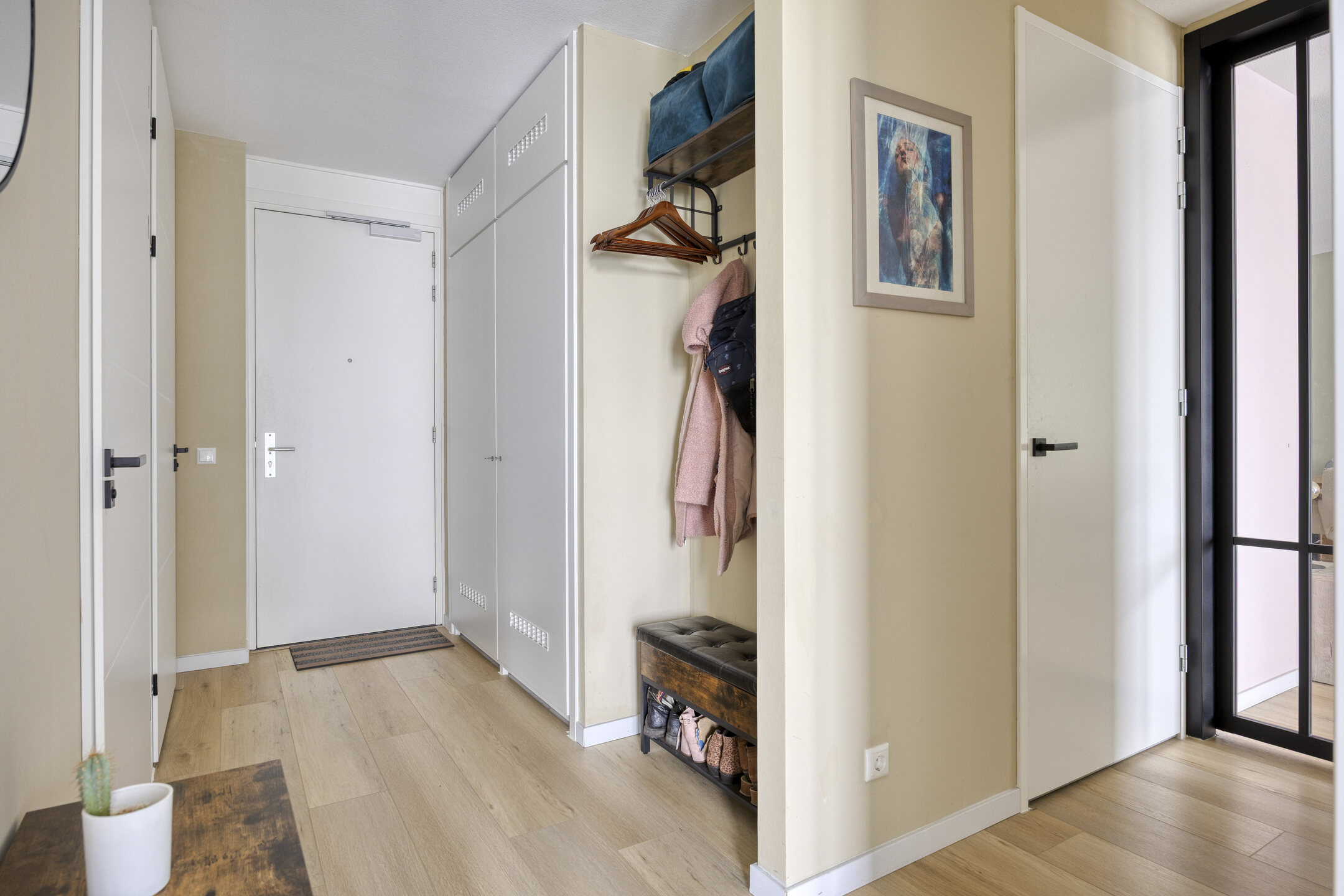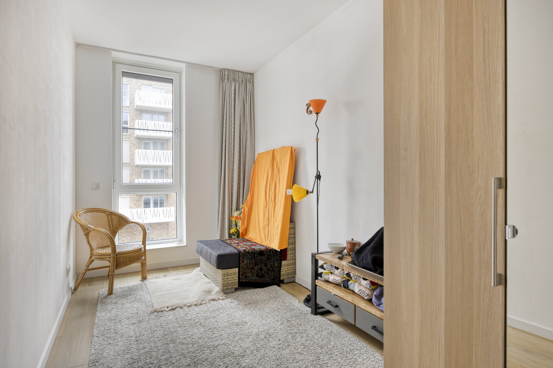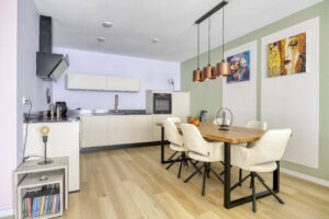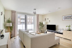 Royale living (ca. 37 m²) met schuifpui naar een ruim balkon (ca. 7 m²) gunstig gesitueerd op het westen en een open keuken met een L-vormige keukeninrichting voorzien van inductie kookplaat, afzuigkap, koelkast, elektrische oven en een vaatwasser.