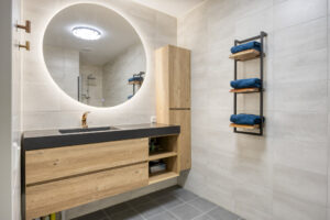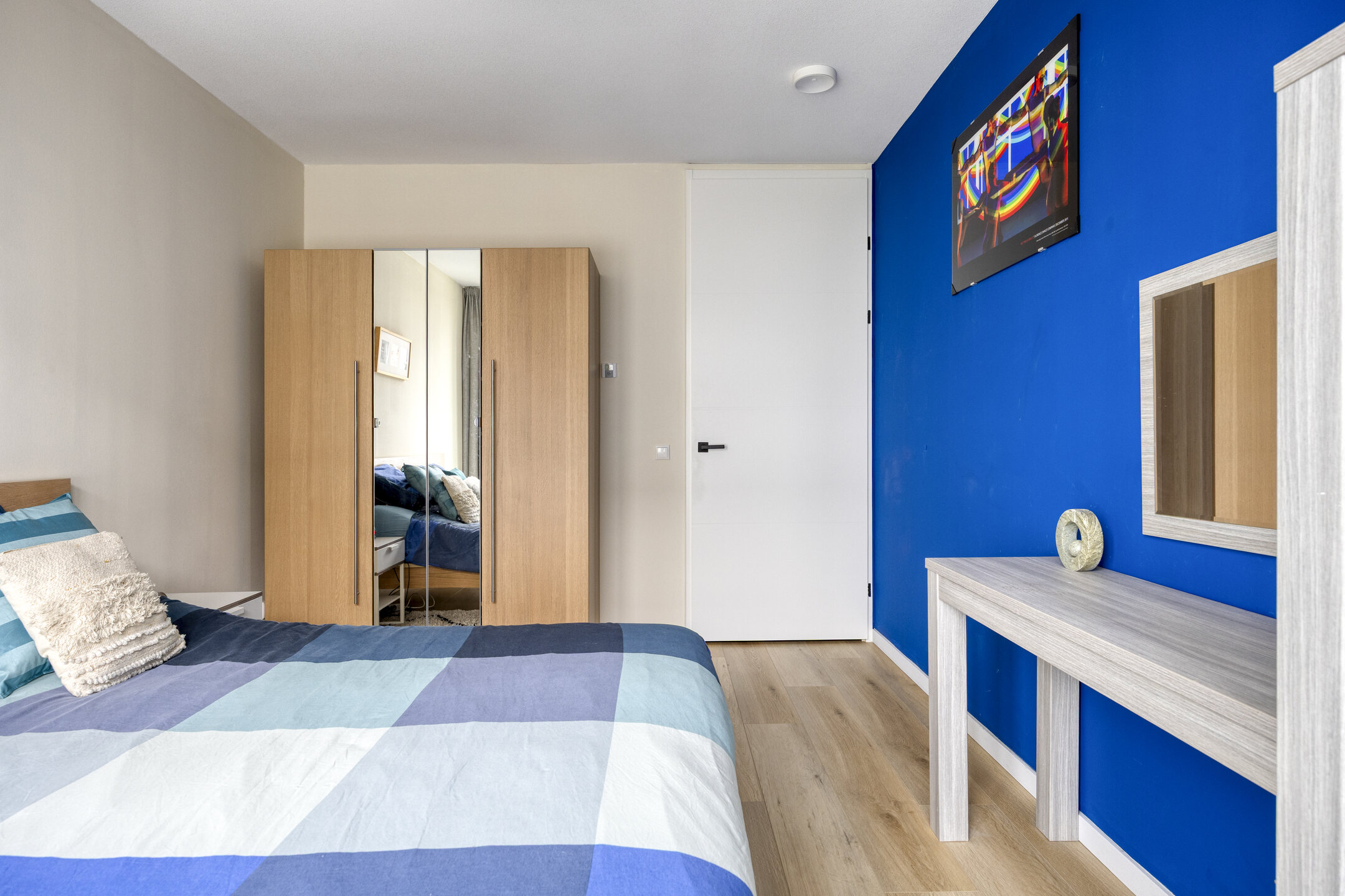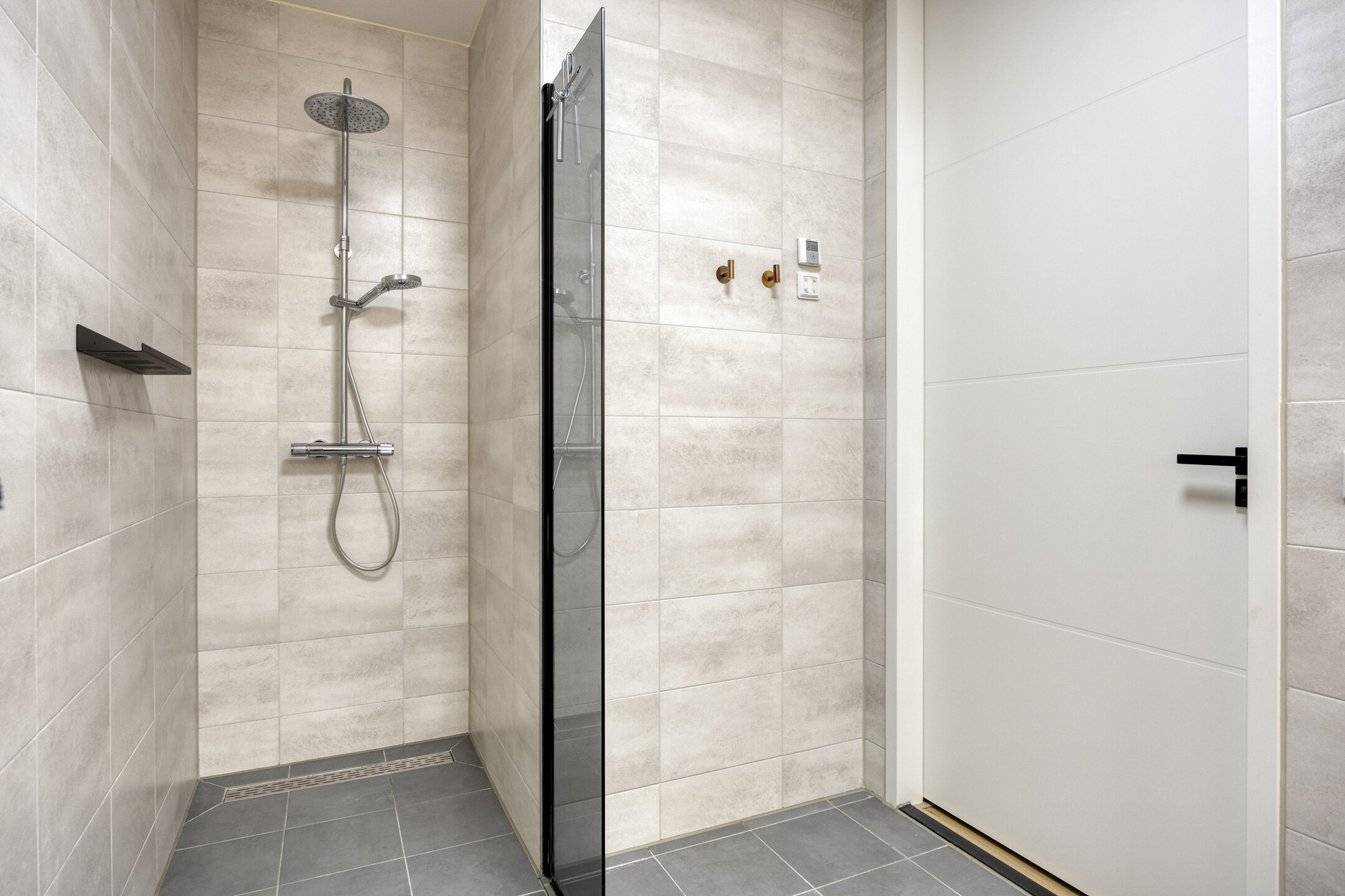 Vanuit de hal tevens toegang tot slaapkamer (ca. 2.10x4.50 m.); slaapkamer (ca. 3.10x4.50 m.) en een geheel betegelde badkamer (ca. 7 m²) voorzien royale inloopdouche, wastafel in een fraai badkamermeubel.