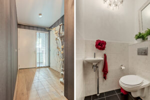 Portaal met toegang tot de ruime hal/gang met airco en de meterkast, betegelde toiletruimte voorzien van wandcloset met inbouw reservoir en een fonteintje; royale berging met opstelplaats CV-combiketel, unit mechanische ventilatie met WTW en de aansluitpunten ten behoeve van de wasapparatuur; separate berging extra diep.