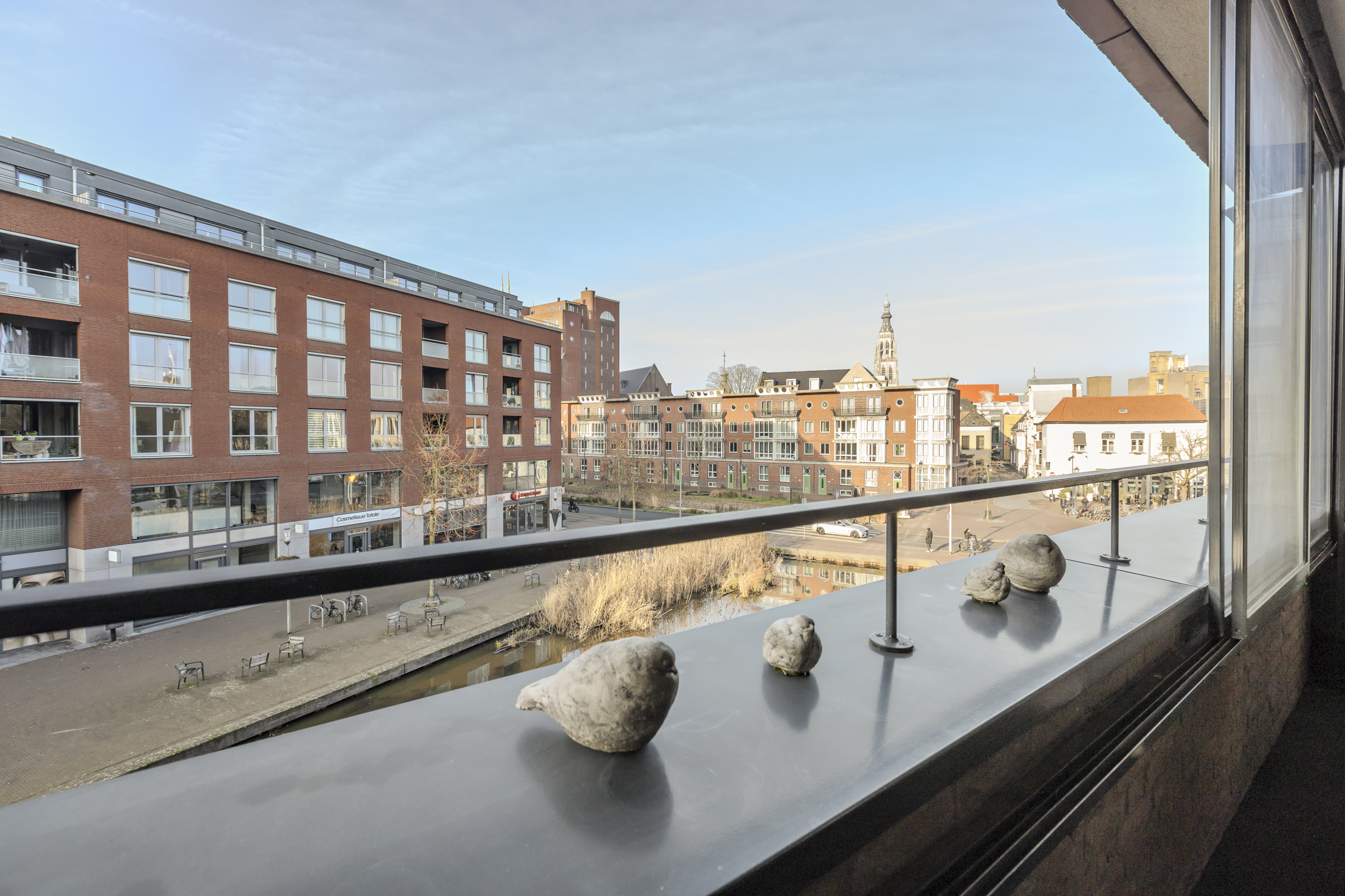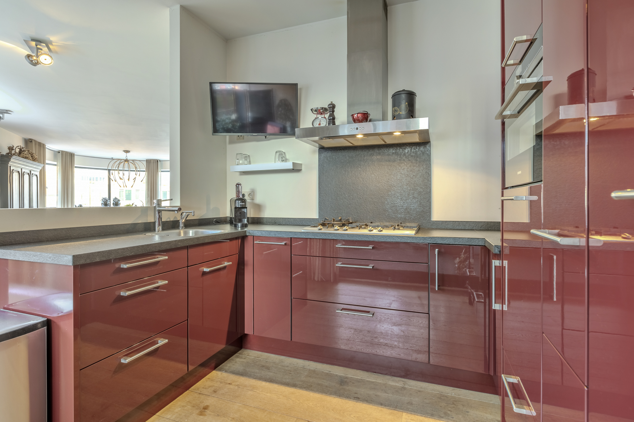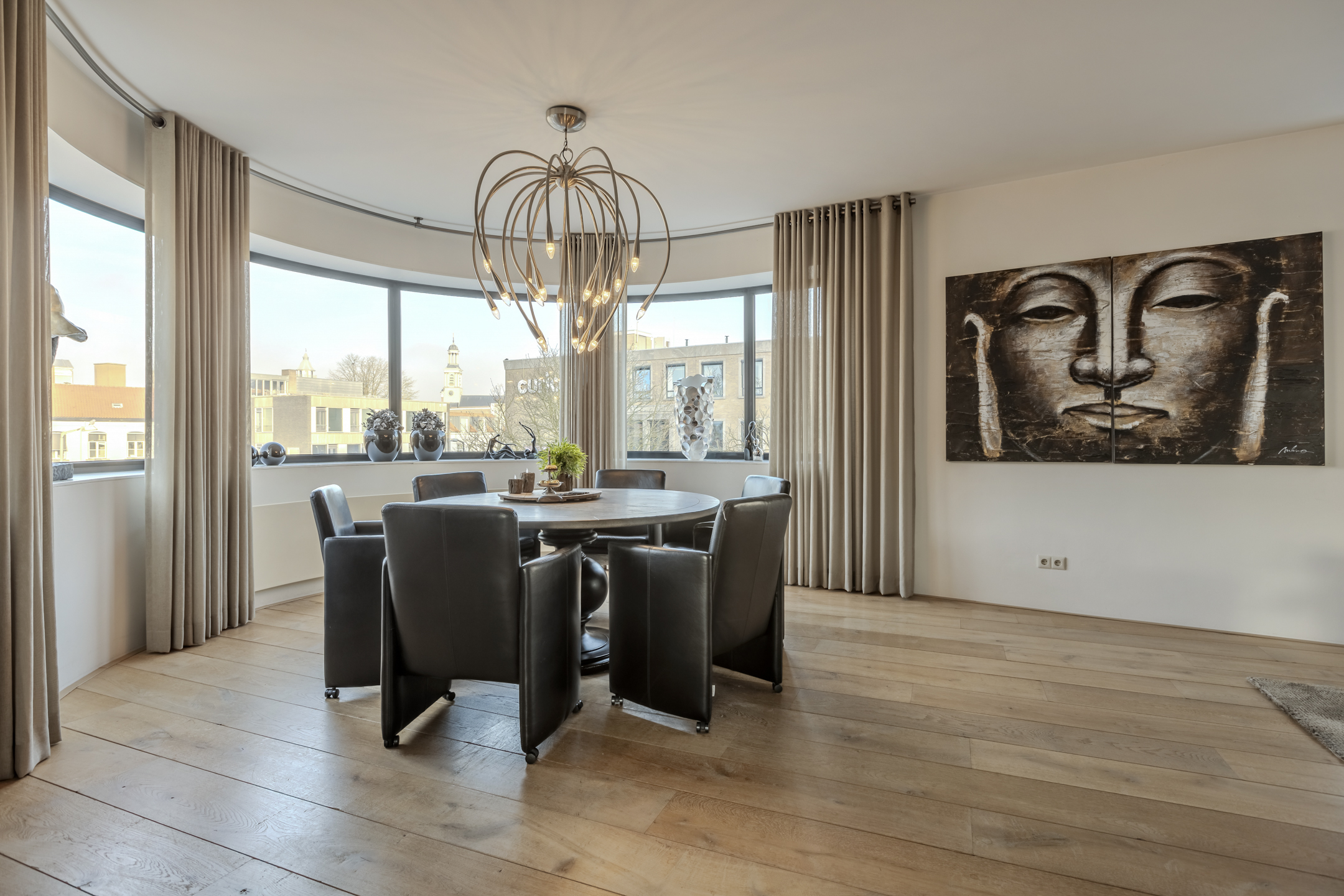 Riante living ca. (74 m²) met schuifpui naar de buitenruimte. Tevens beschikt de woonkamer over een fantastisch grote, ronde raampartij waardoor u een geweldig uitzicht heeft over de binnenstad. Semi-open keuken met U-vormige keukeninrichting voorzien van een hard stenen aanrechtblad en de volgende inbouwapparatuur: 5 pits gaskookplaat, recirculatie afzuigschouw, koelkast, combi oven/magnetron, vaatwasser en een quooker-kraan. De woonkamer/keuken is tevens voorzien van een airco.