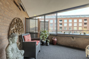 Vanuit de keuken heeft u tevens toegang middels een schuifpui tot de ruime buitenruimte met een oppervlakte van ca. 12 m² die gunstig is gesitueerd op het westen. De buitenruimte kan gesloten worden door middel van een schuifpui van glas. (Hier staat ook de buiten-unit van de airconditioning)