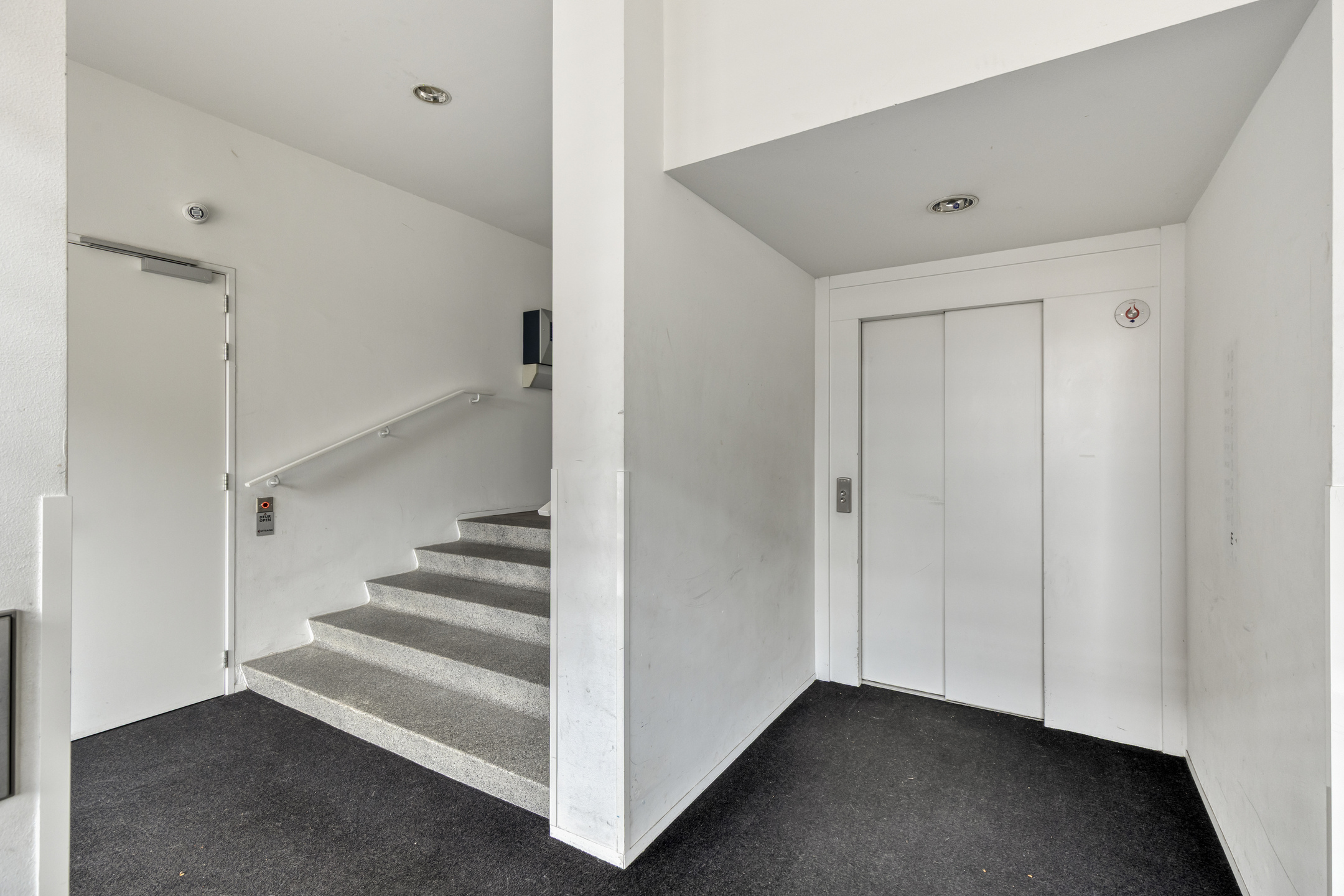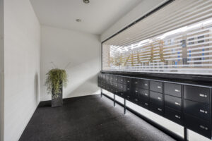 Middels videofoon installatie toegang tot centrale entree met liftinstallatie, brievenbussen en toegang tot trappenhuis, afgesloten overnameruimte parkeerstalling en gemeenschappelijke fietsenberging.