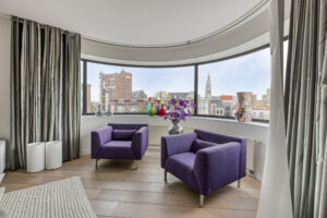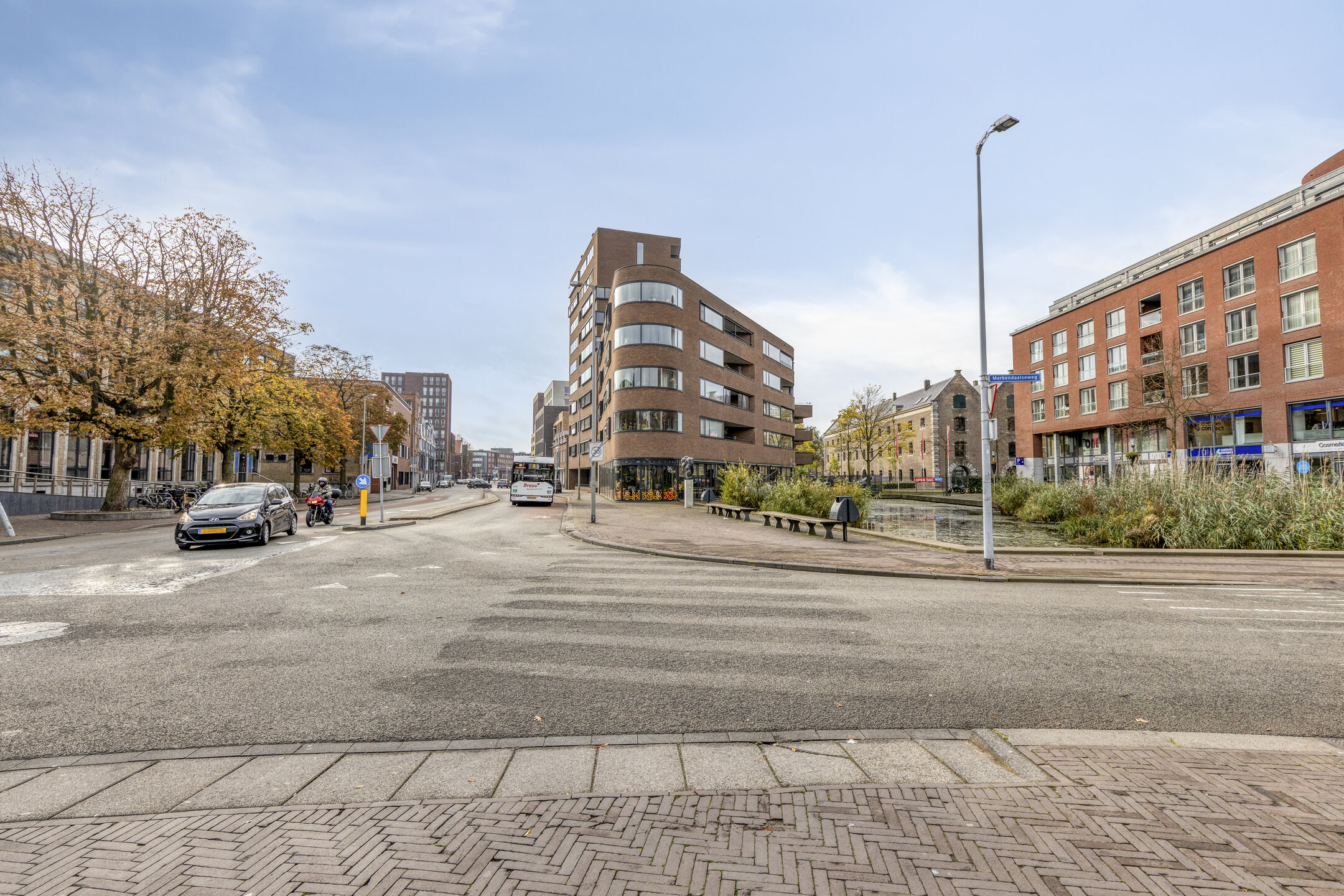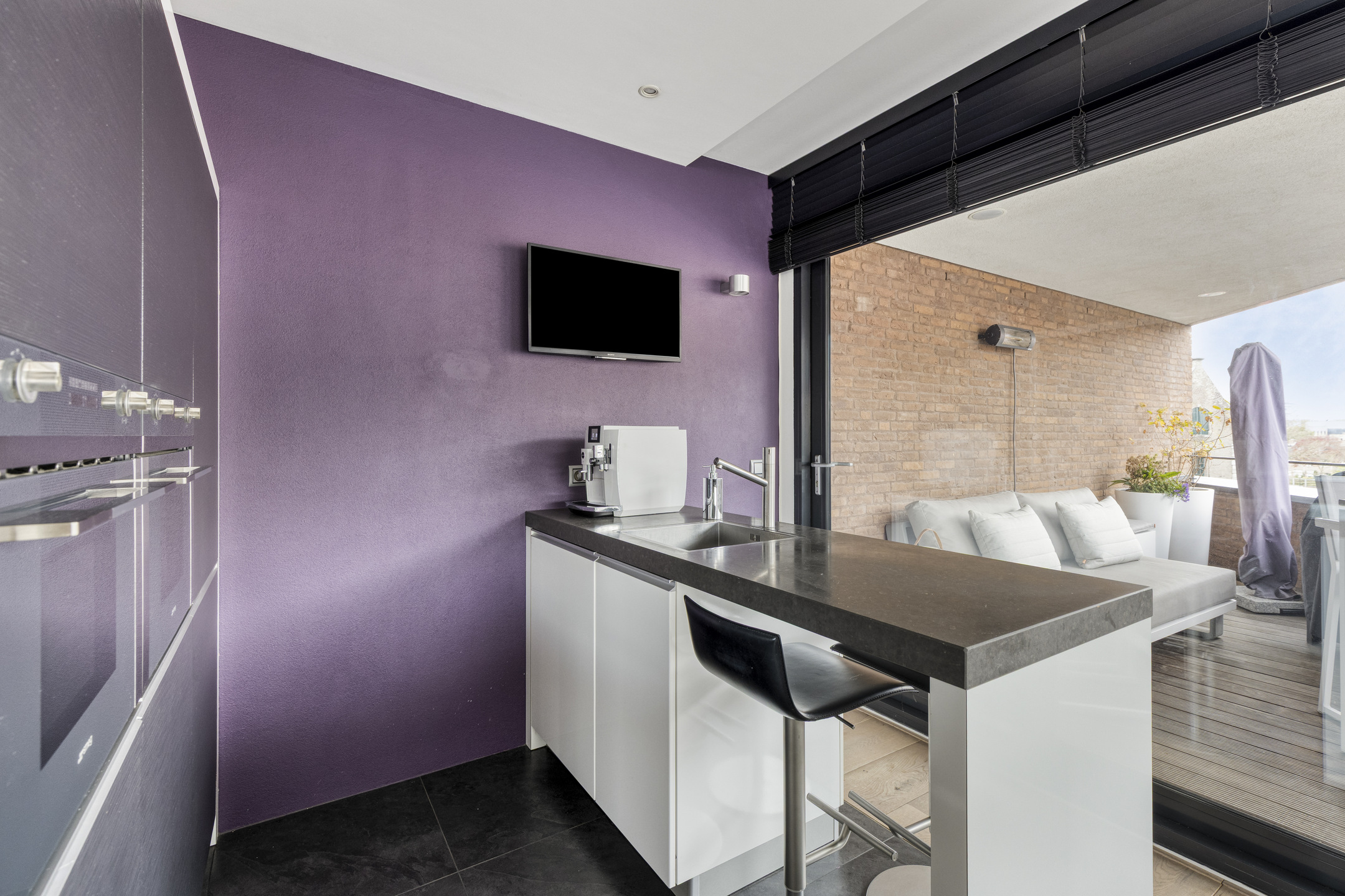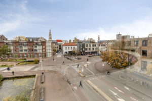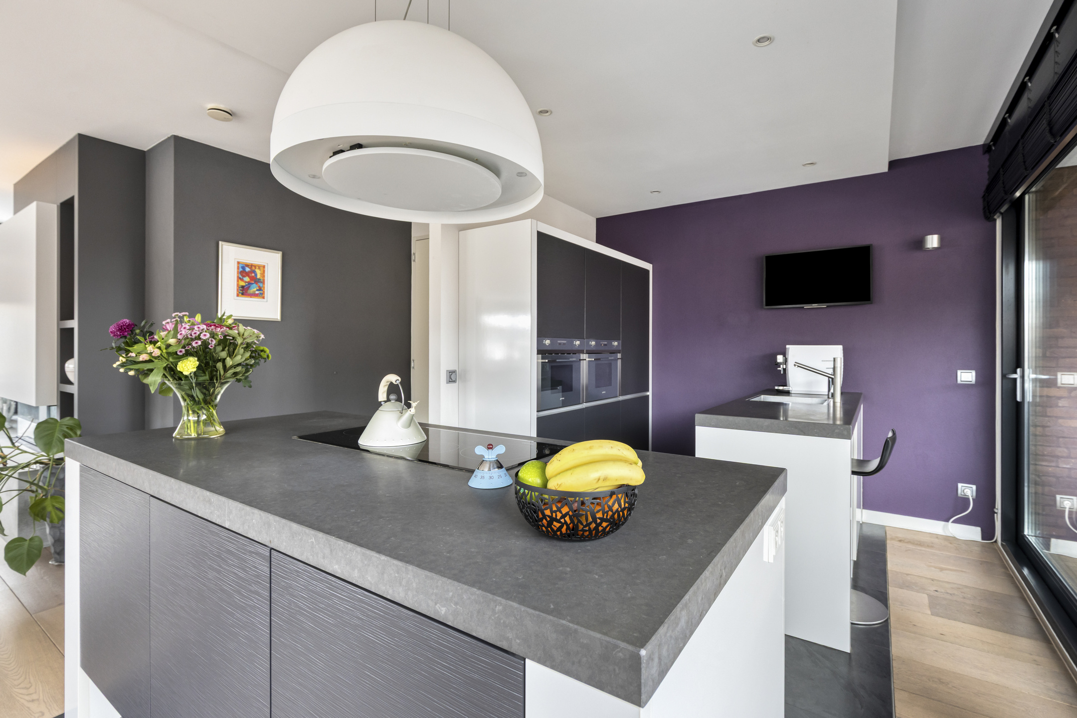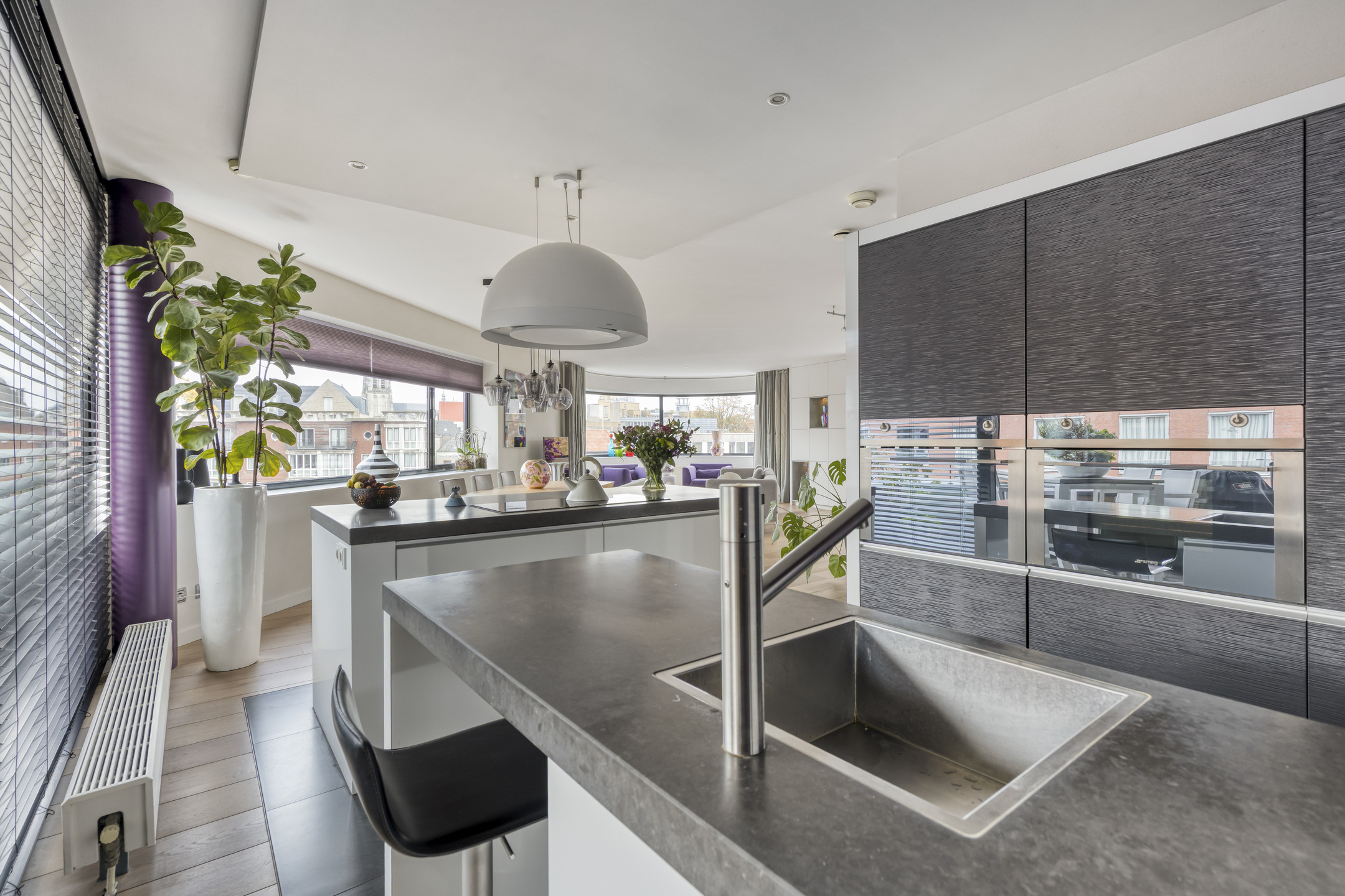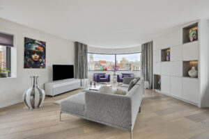 Riante living ca. (70 m²) met op maat gemaakte kastenwand, schouw met ingebouwde elektrische haard (beide door Stefan Martens ontworpen) en schuifpui naar de buitenruimte. Tevens beschikt de woonkamer over een fantastisch grote, ronde raampartij waardoor u een geweldig uitzicht heeft over de binnenstad. Semi-open keuken met luxe design keukeninrichting "Leicht" bestaande uit een open opstelling met een kookeiland voorzien van de volgende hoogwaardige inbouwapparatuur: Oven (Smeg), combi oven/magnetron (Smeg), inductie kookplaat (Miele), vaatwasser (Miele 2020), design afzuiglamp (Wave 2021), een koelkast (Miele 2024) en een vriezer.