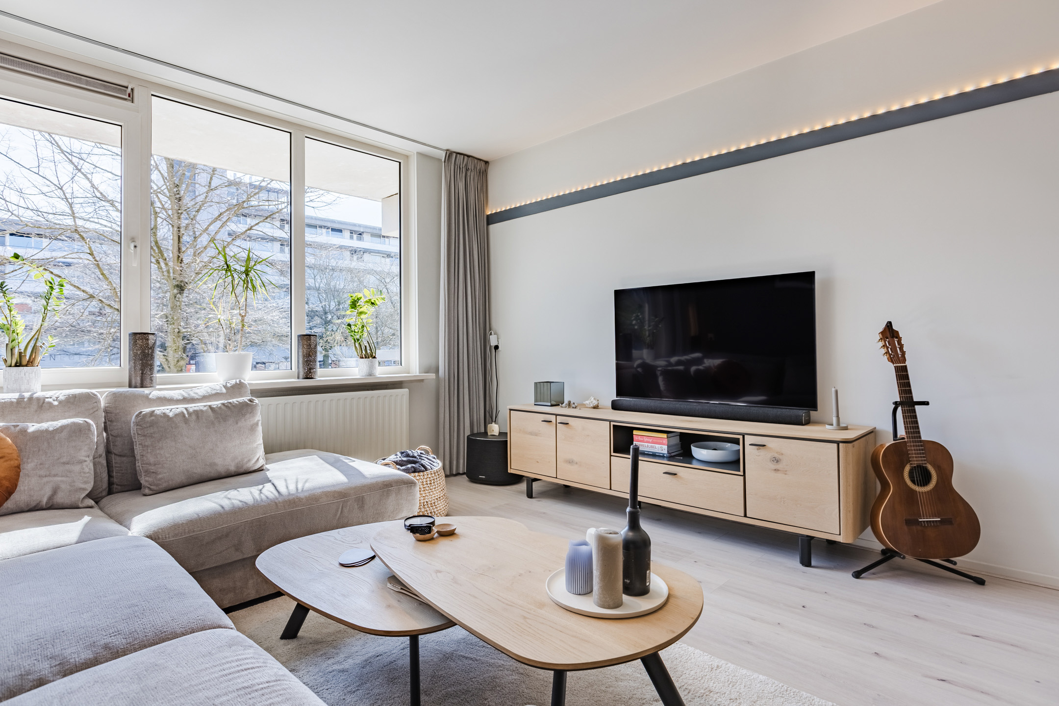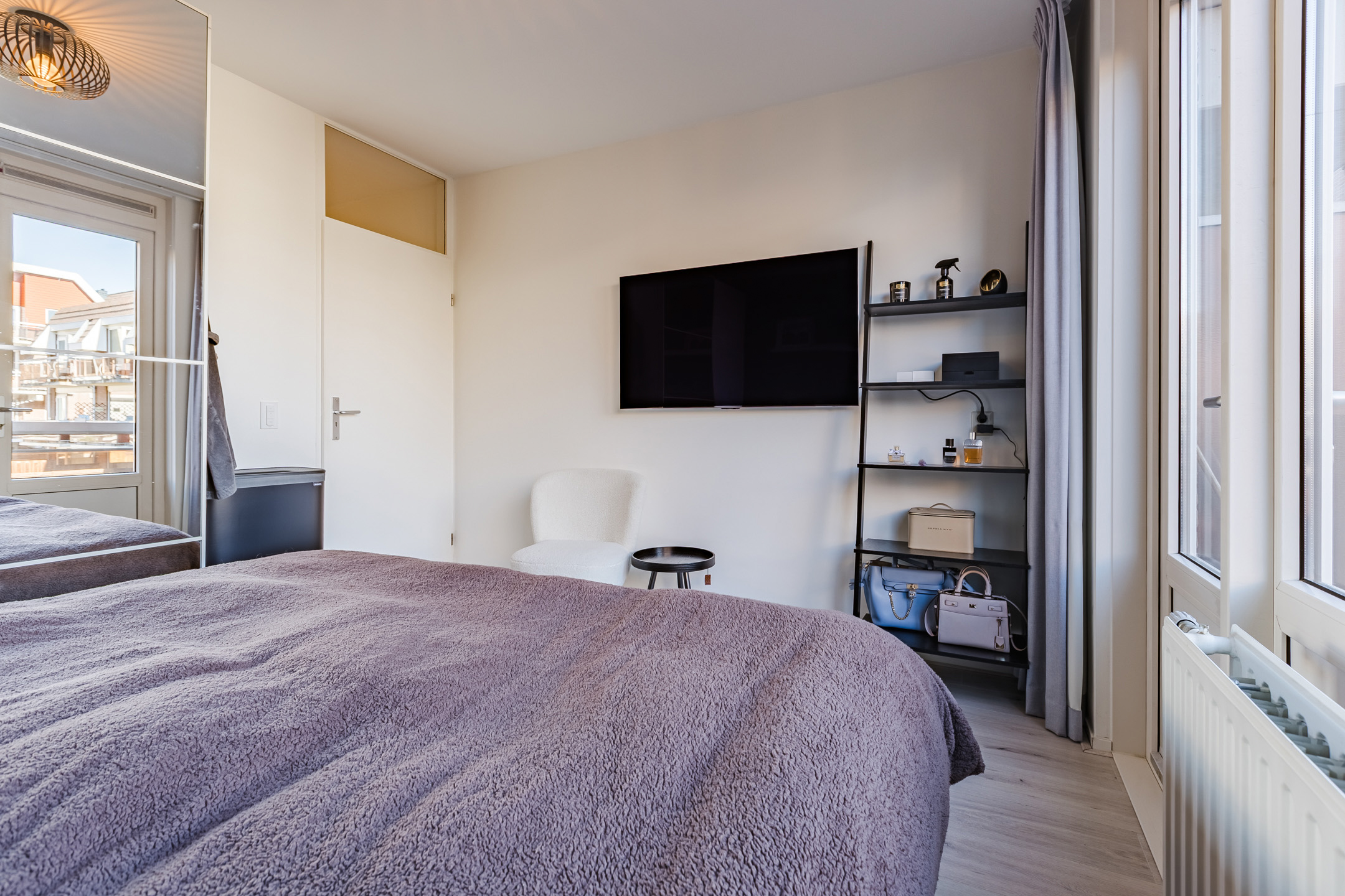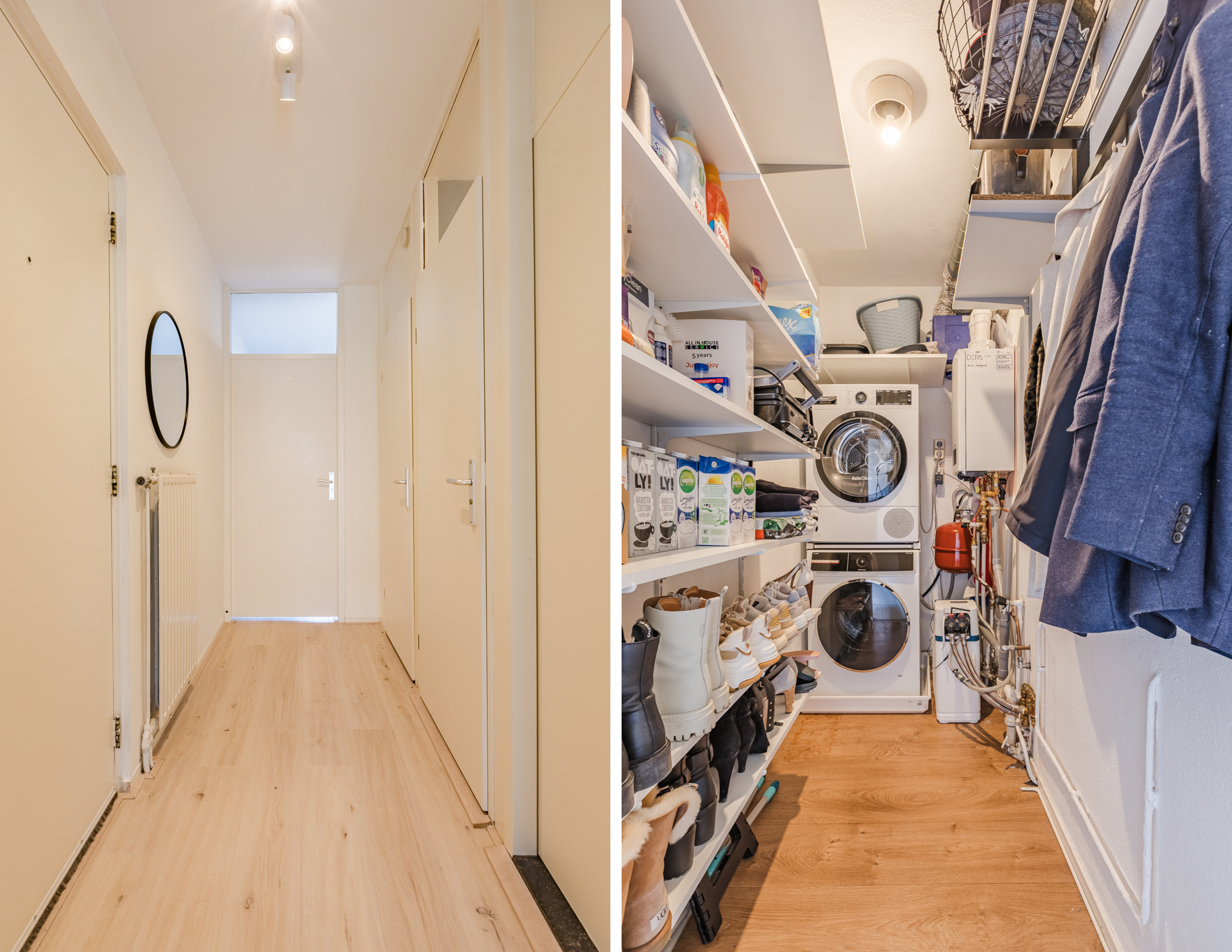 Entree/hal, gedeeltelijk betegelde toiletruimte met wandcloset voorzien van inbouw reservoir en fonteintje en een diepe vaste kast met opstelling CV-combiketel (Nefit 2025) en aansluitingen ten behoeve van de wasapparatuur; slaapkamer ca. 12 m² met toegang tot een balkon gesitueerd op noord-westen; gedeeltelijk betegelde lichte badkamer voorzien van royale inloopdouche en een dubbele wastafel in meubel; living ca. 30 m² met een moderne L-vormige keukeninrichting voorzien van RVS fornuis met 5 pits gaskookplaat en een oven, afzuigkap, koel/vries combinatie en een vaatwasser; vanuit de living toegang tot de 2e slaapkamer ca. 13 m² met toegang tot een balkon op het zuid-oosten.
