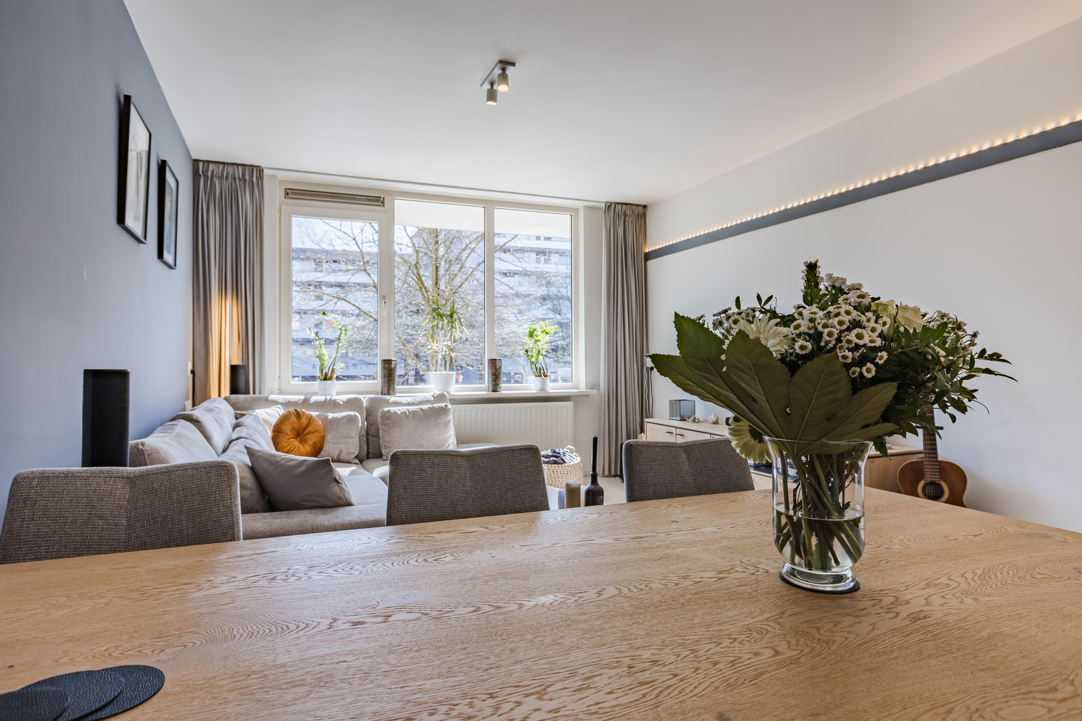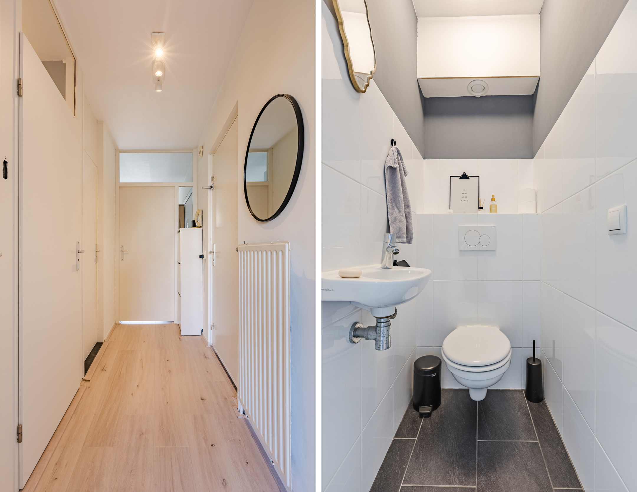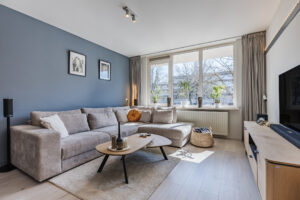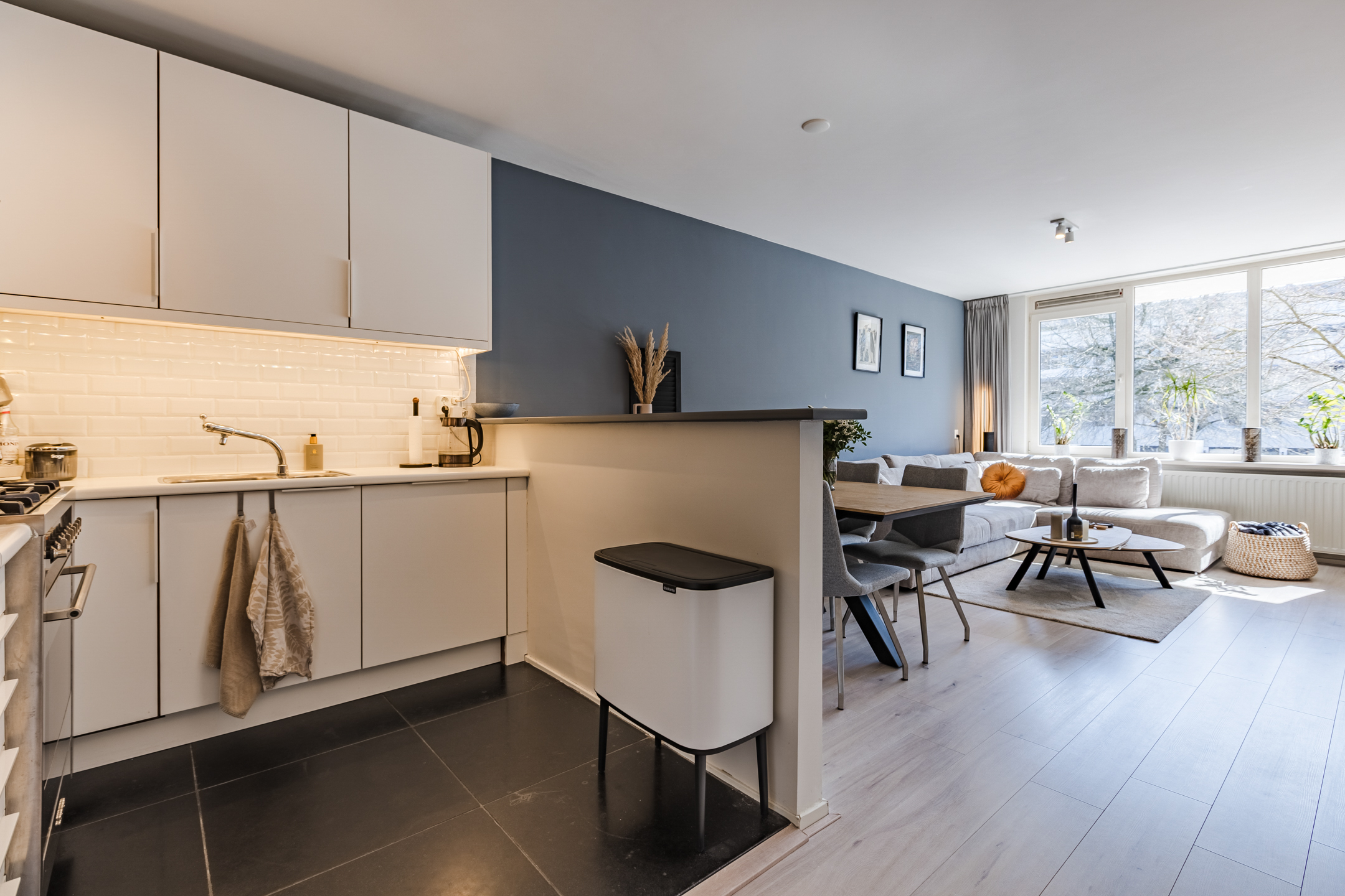Entree/hal, gedeeltelijk betegelde toiletruimte met wandcloset voorzien van inbouw reservoir en fonteintje en een diepe vaste kast met opstelling CV-combiketel (Nefit 2025) en aansluitingen ten behoeve van de wasapparatuur; slaapkamer ca. 12 m² met toegang tot een balkon gesitueerd op noord-westen; gedeeltelijk betegelde lichte badkamer voorzien van royale inloopdouche en een dubbele wastafel in meubel; living ca. 30 m² met een moderne L-vormige keukeninrichting voorzien van RVS fornuis met 5 pits gaskookplaat en een oven, afzuigkap, koel/vries combinatie en een vaatwasser; vanuit de living toegang tot de 2e slaapkamer ca. 13 m² met toegang tot een balkon op het zuid-oosten.