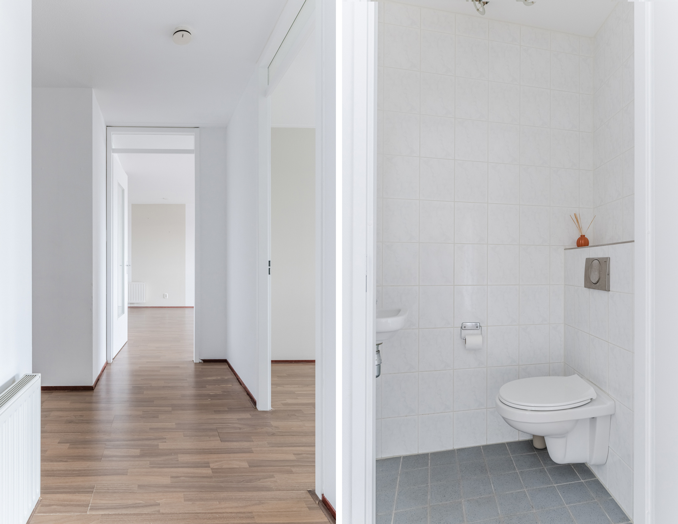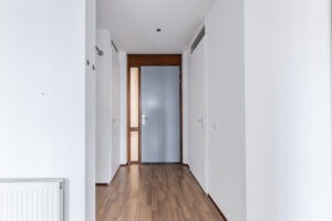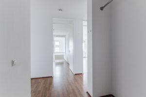 Entree-/hal met toegang tot de twee slaapkamers, woonkamer/-keuken, badkamer, berging en geheel betegelde toiletruimte met wandcloset en fonteintje.
