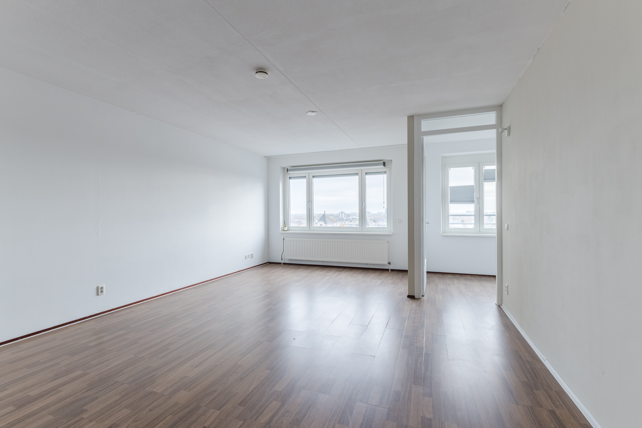 De open woonkamer (ca. 37 m²) is ruim van opzet en voorzien van elektrische bedienbare zonwering in de vorm van een screen. Aansluitend bevindt zich de loggia (ca. 3,48 x 1,80 m), een veelzijdige ruimte die zich uitstekend leent voor bijvoorbeeld een thuiswerkplek met uitzicht over de singel en de Koepel van Breda.