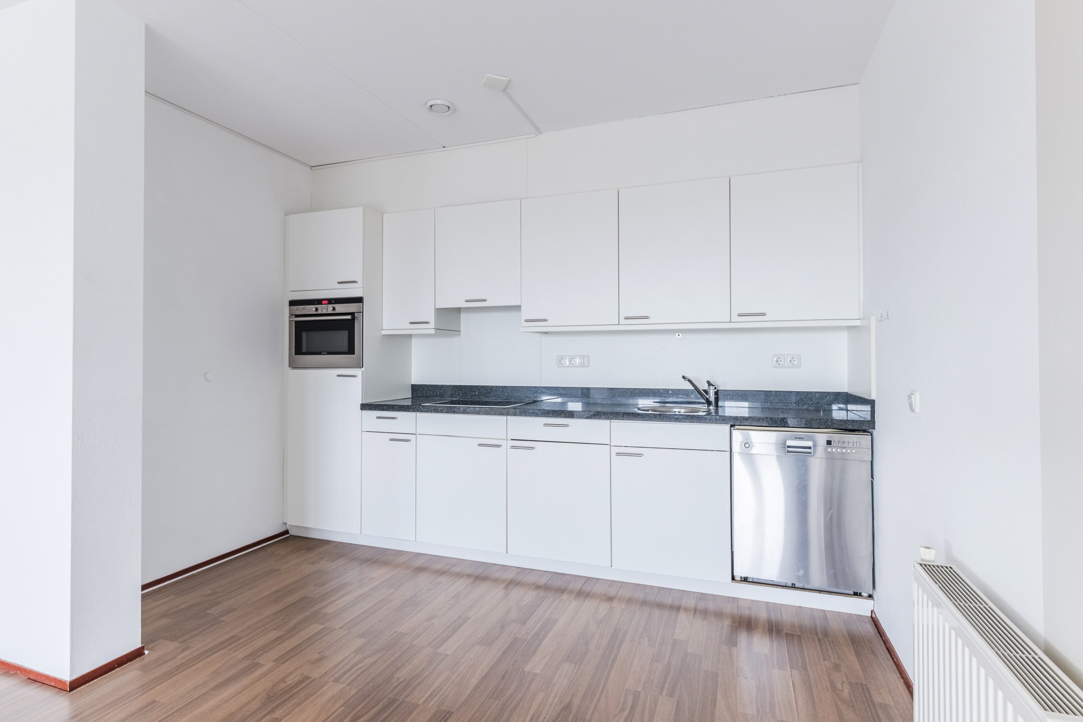 De keuken is uitgerust met een combi-oven/magnetron, koelkast, 4-pits keramische kookplaat, afzuigkap, spoelbak met mengkraan, vaatwasser en diverse boven- en onderkasten.