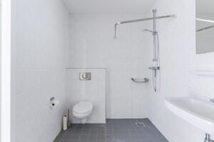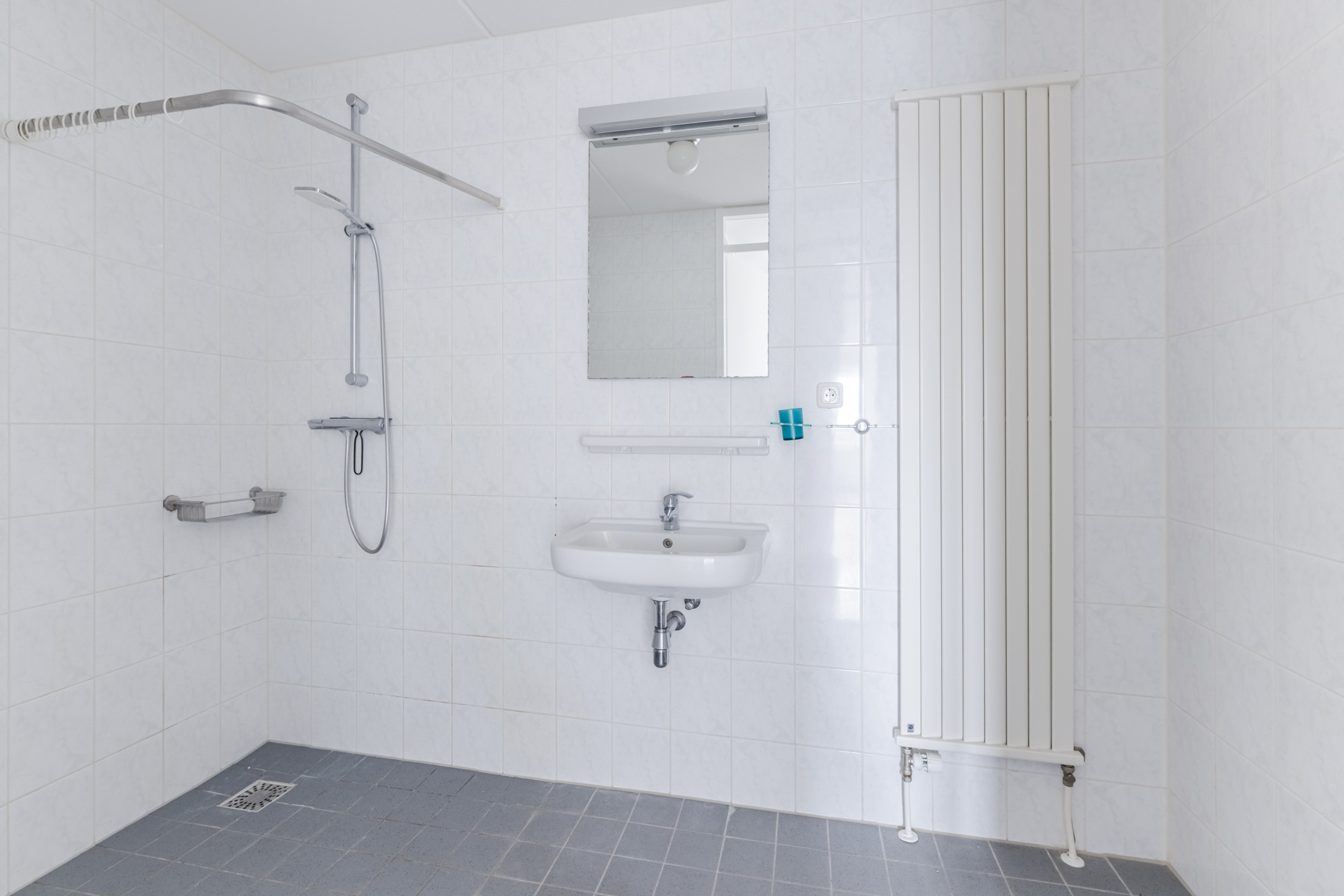 De volledig betegelde badkamer (ca. 1,93 x 3,05 m) is uitgerust met een inloopdouche, wastafel, wandcloset, wandradiator en mechanische afzuiging.