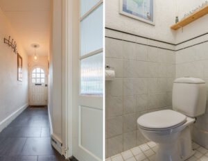 Entree/hal met plavuizen vloer, trapopgang naar de eerste verdieping, praktische trapkast en een gedeeltelijk betegelde toiletruimte met toilet.