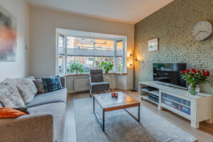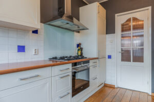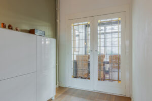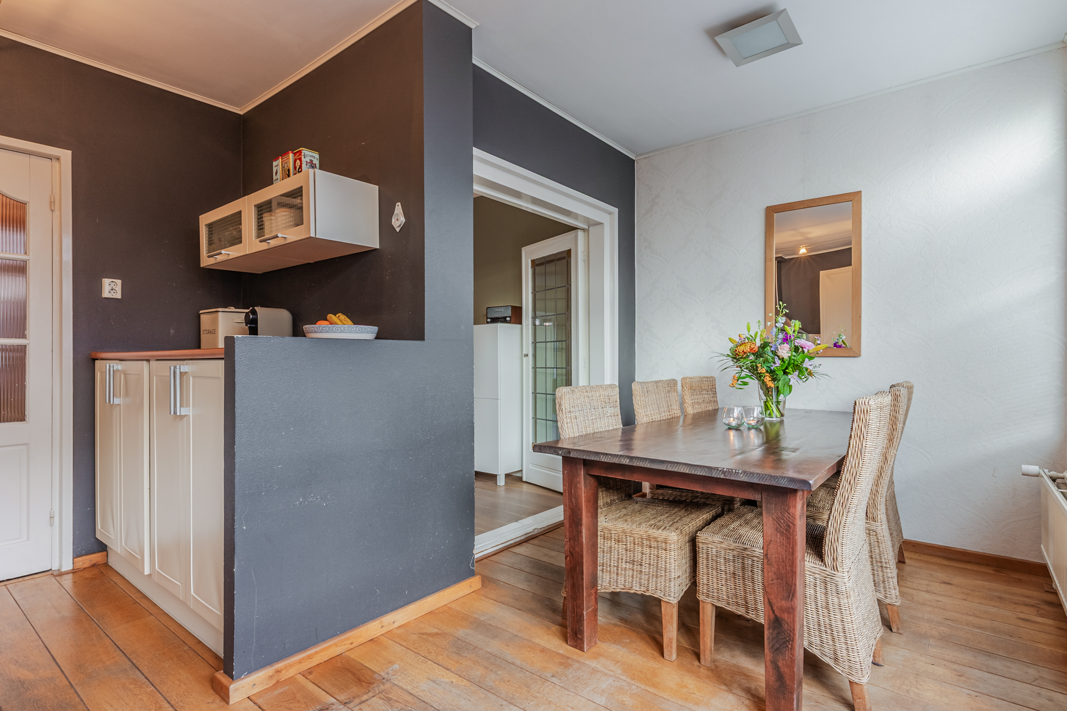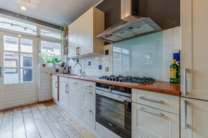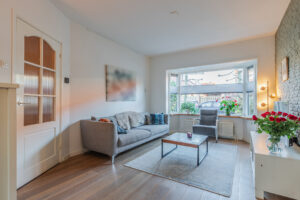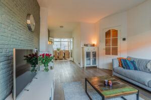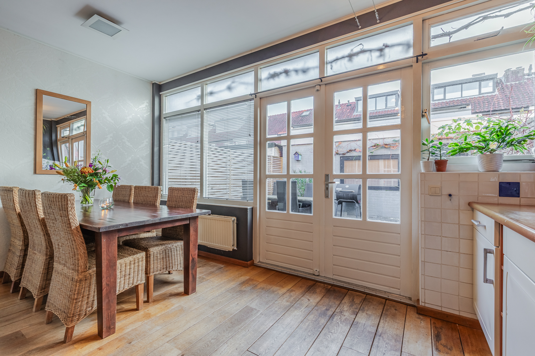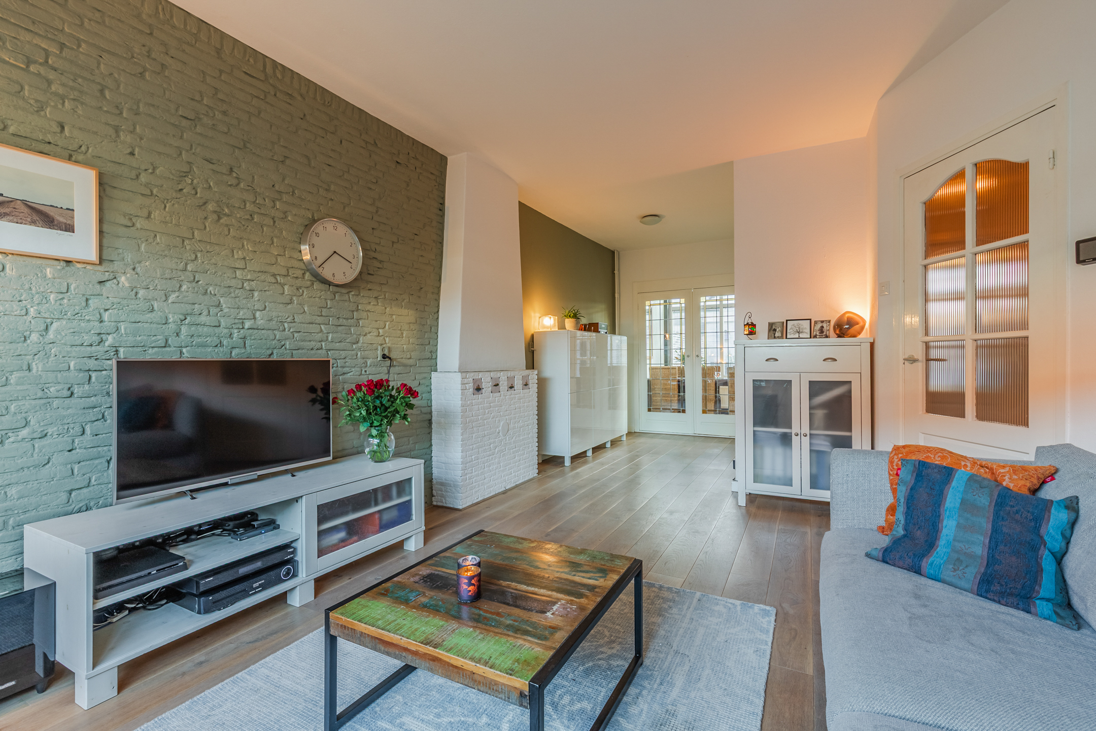 Royale leefruimte (ca. 37 m²) voorzien van lamell Eiken vloer, sierschouw en onderverdeeld in een: Woonkamer (ca. 22 m²) met een erker en een woonkeuken (ca. 15 m²) met openslaande deuren naar de achtertuin en een keukeninrichting voorzien van: 5 pits gaskookplaat, elektrische oven, afzuigkap, koel/vries combinatie, vaatwasser, close-in boiler en aansluitingen ten behoeve van de wasapparatuur. De woonkamer en woonkeuken zijn gescheiden van elkaar middels glas-in-lood deuren.